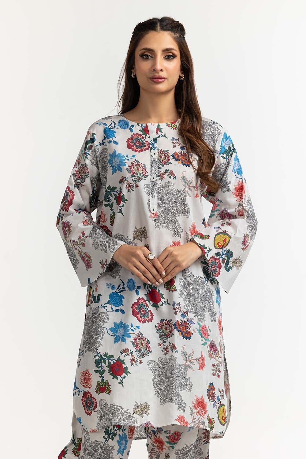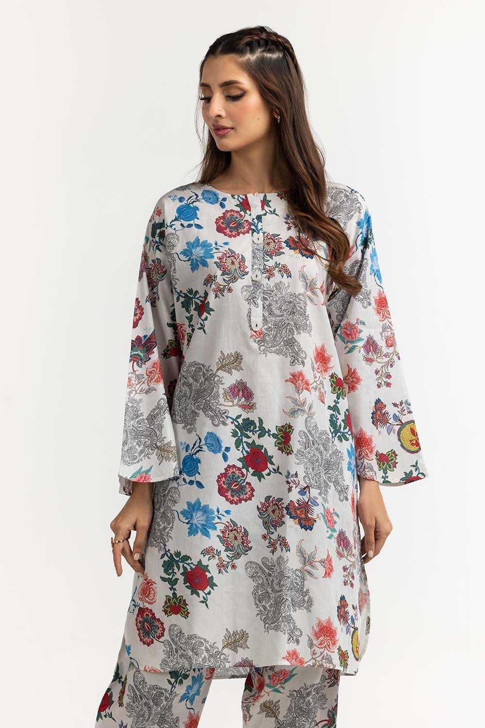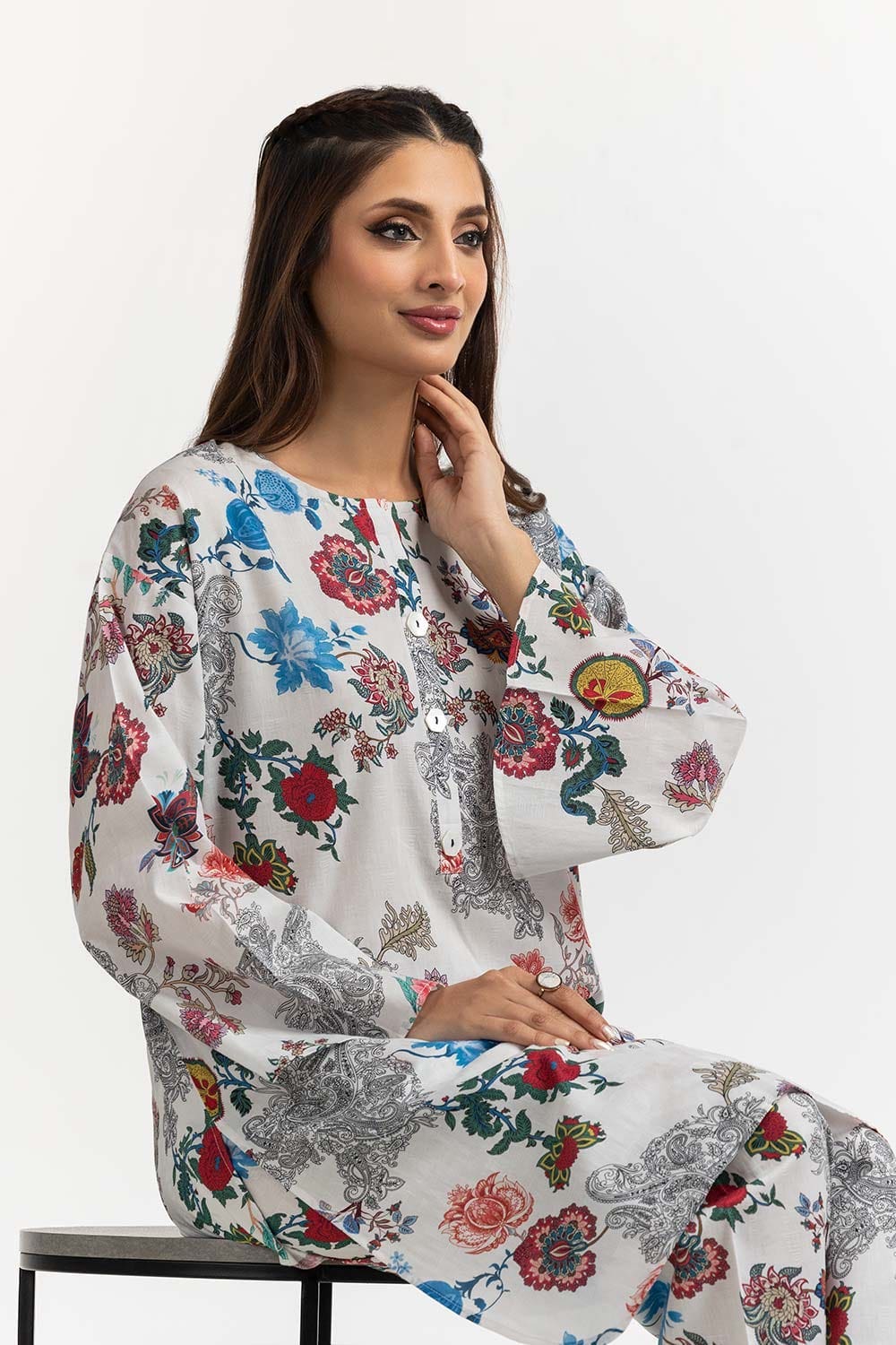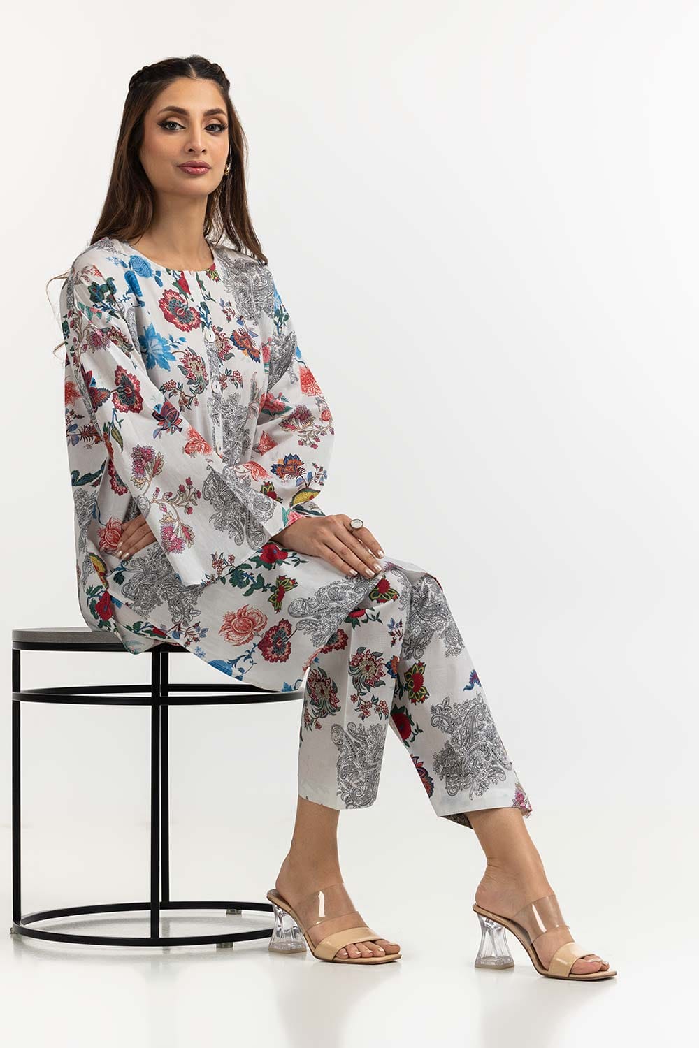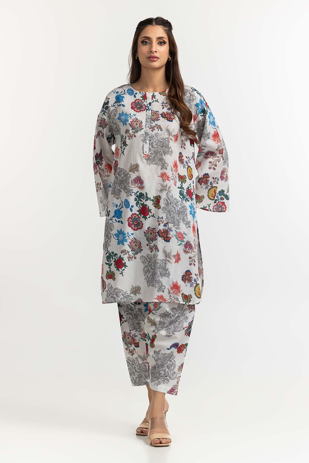 Ready to wear Elevate your style with this 2PC chic white ensemble featuring a beautiful floral print. The kurta boasts a round neckline and full sleeves, while the matching pants complete the look. Perfect for casual outings and semi-formal occasions.