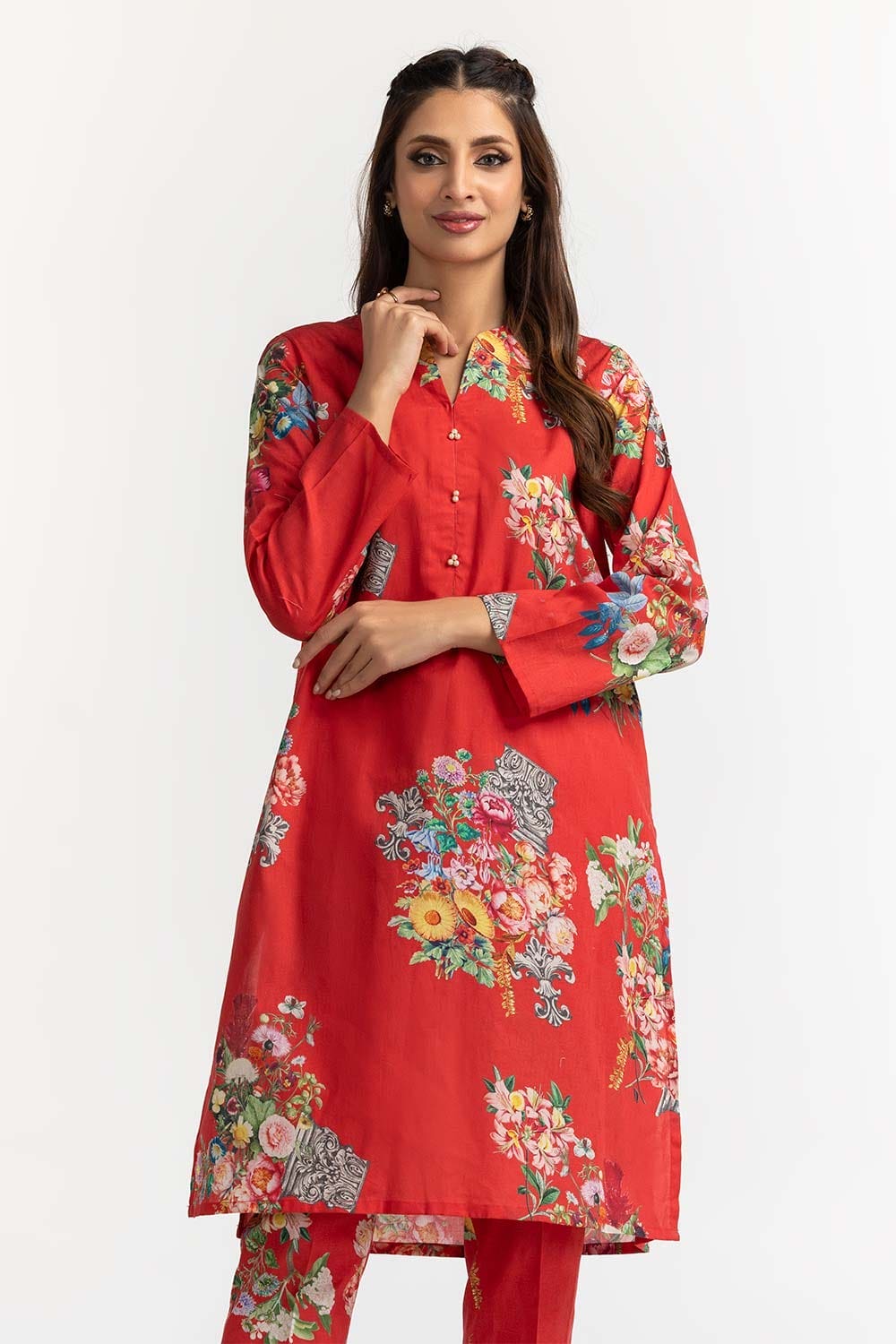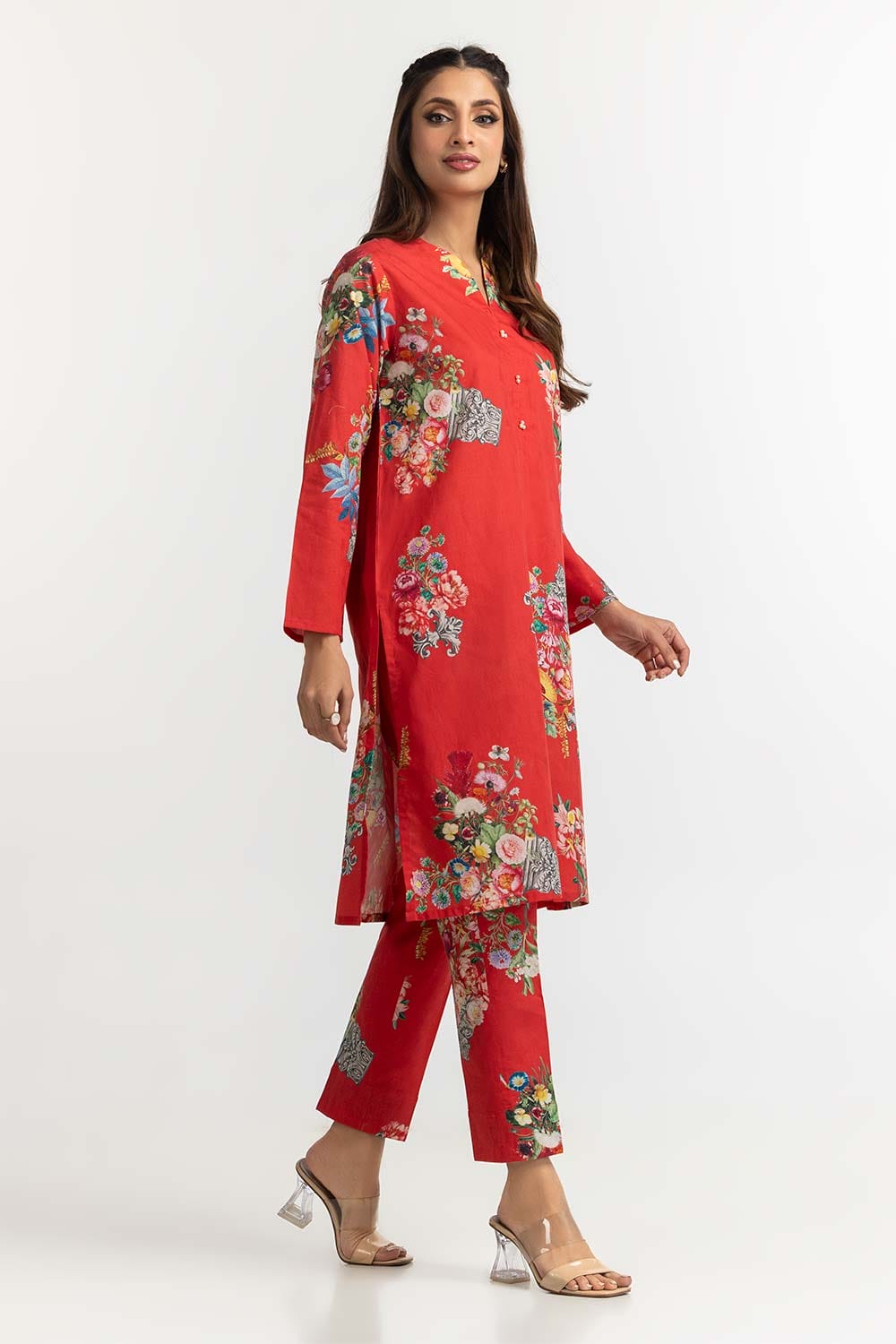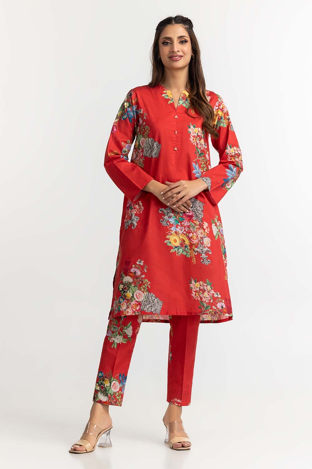 Ready to wear Make a bold statement with this vibrant 2PC red floral print kurta, featuring a round neckline and full sleeves. Paired with matching pants adorned with floral details, this ensemble is perfect for both casual outings and festive celebrations.