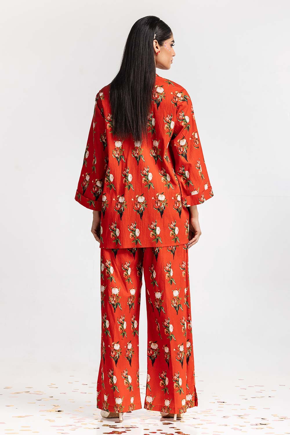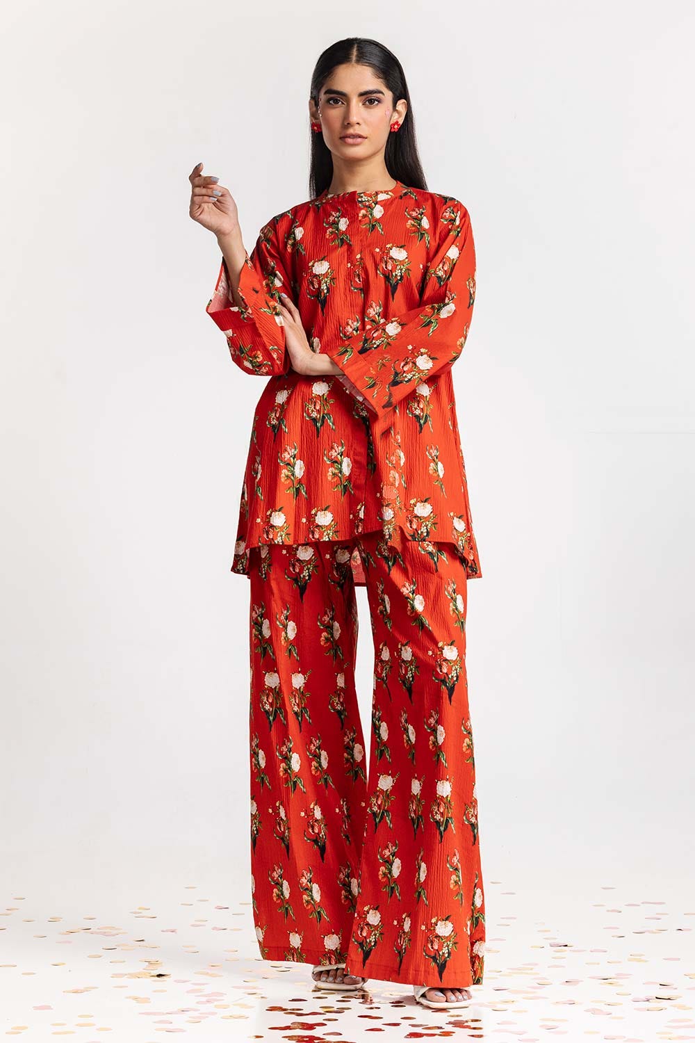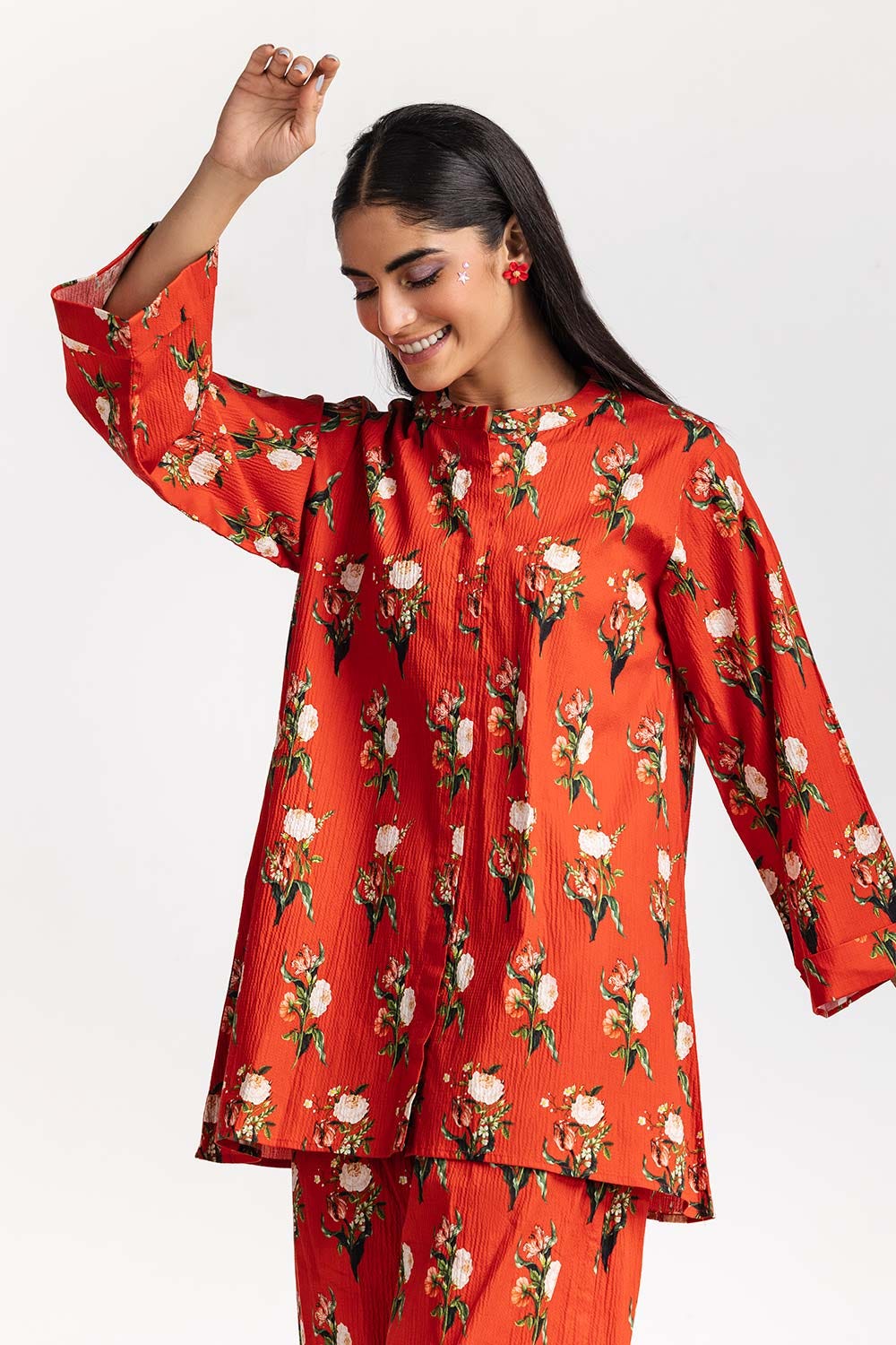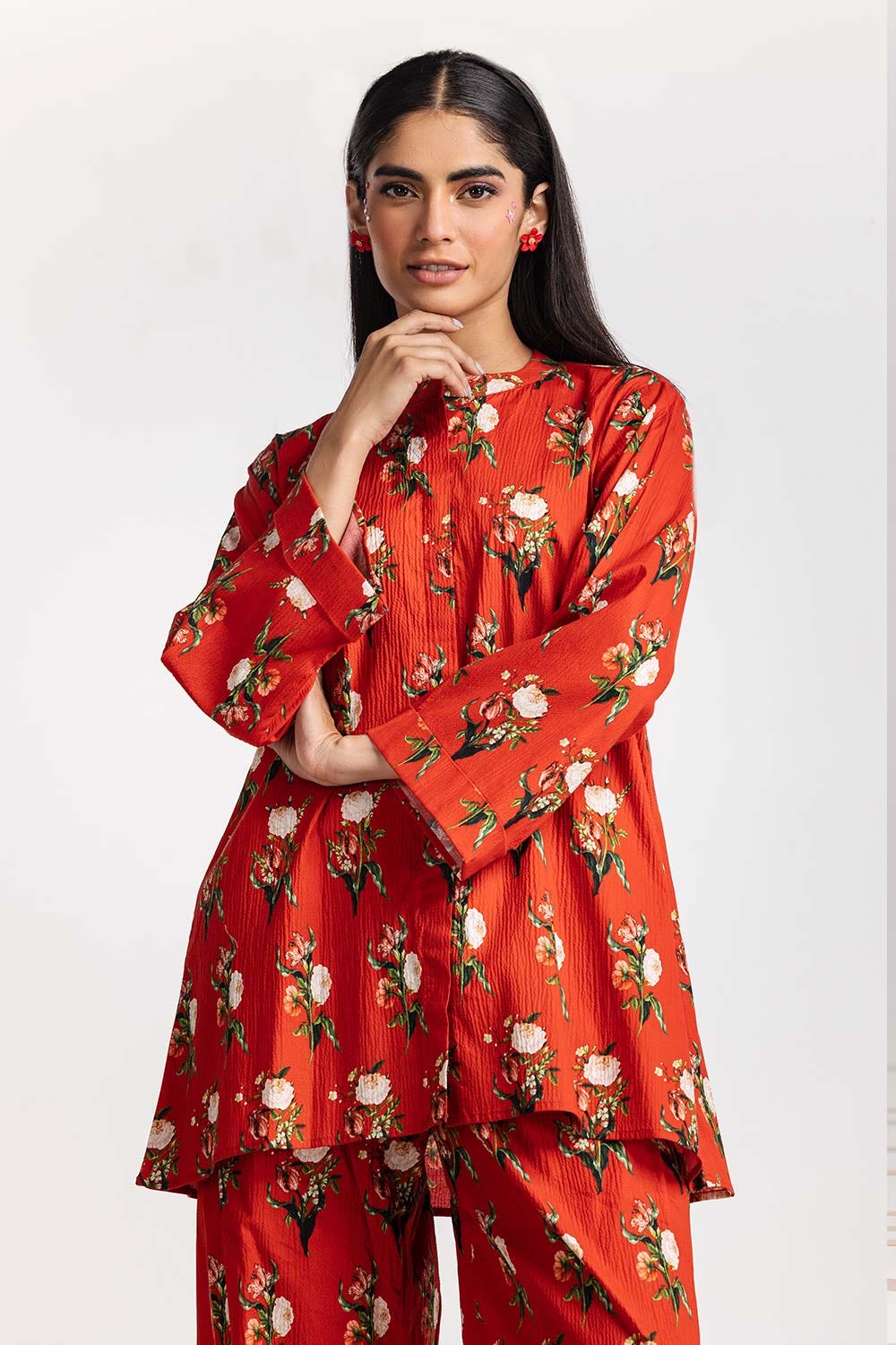 Ready to wear Embrace floral bliss with this 2PC digitally printed red-dyed lycra short shirt, featuring a round neck, and simple straight sleeves, paired with matching printed trousers to complete the look.