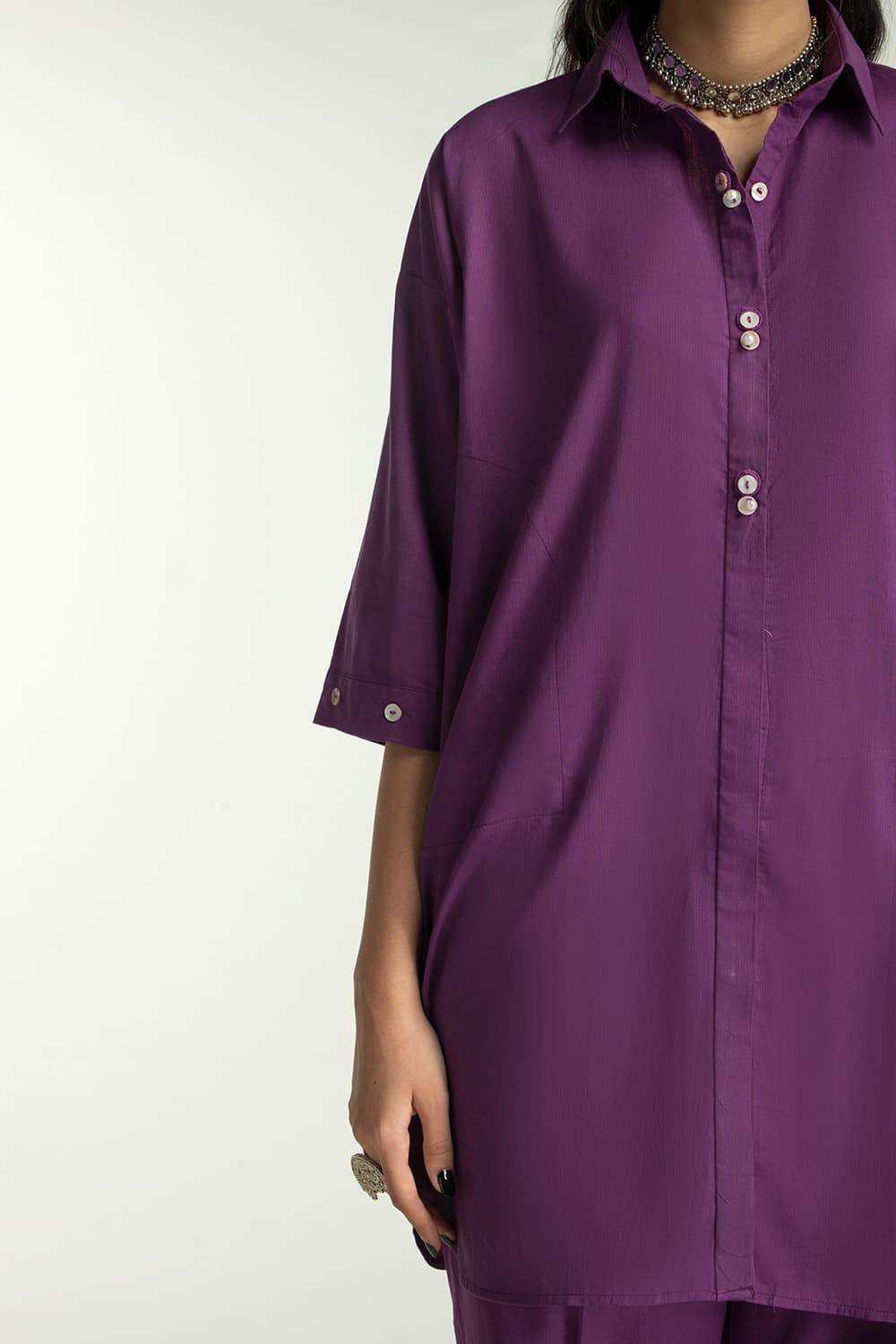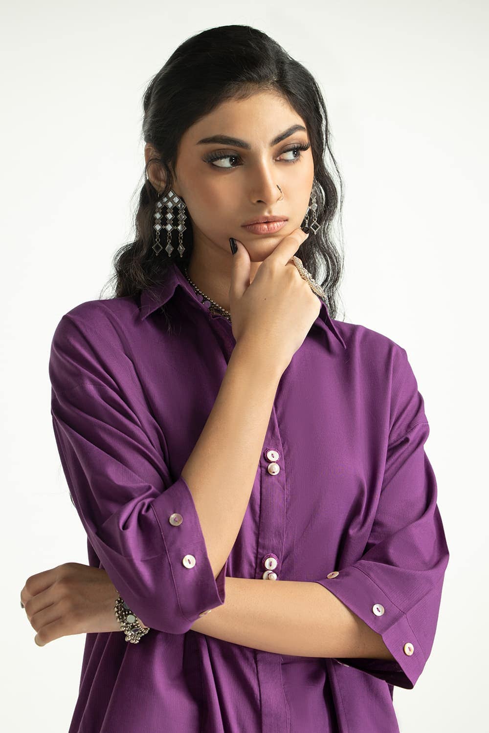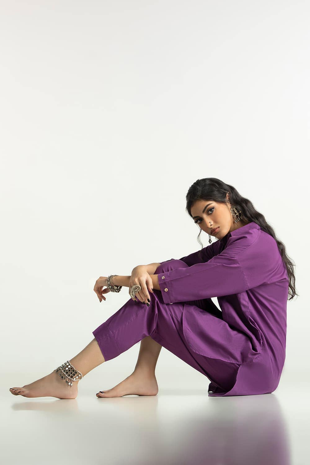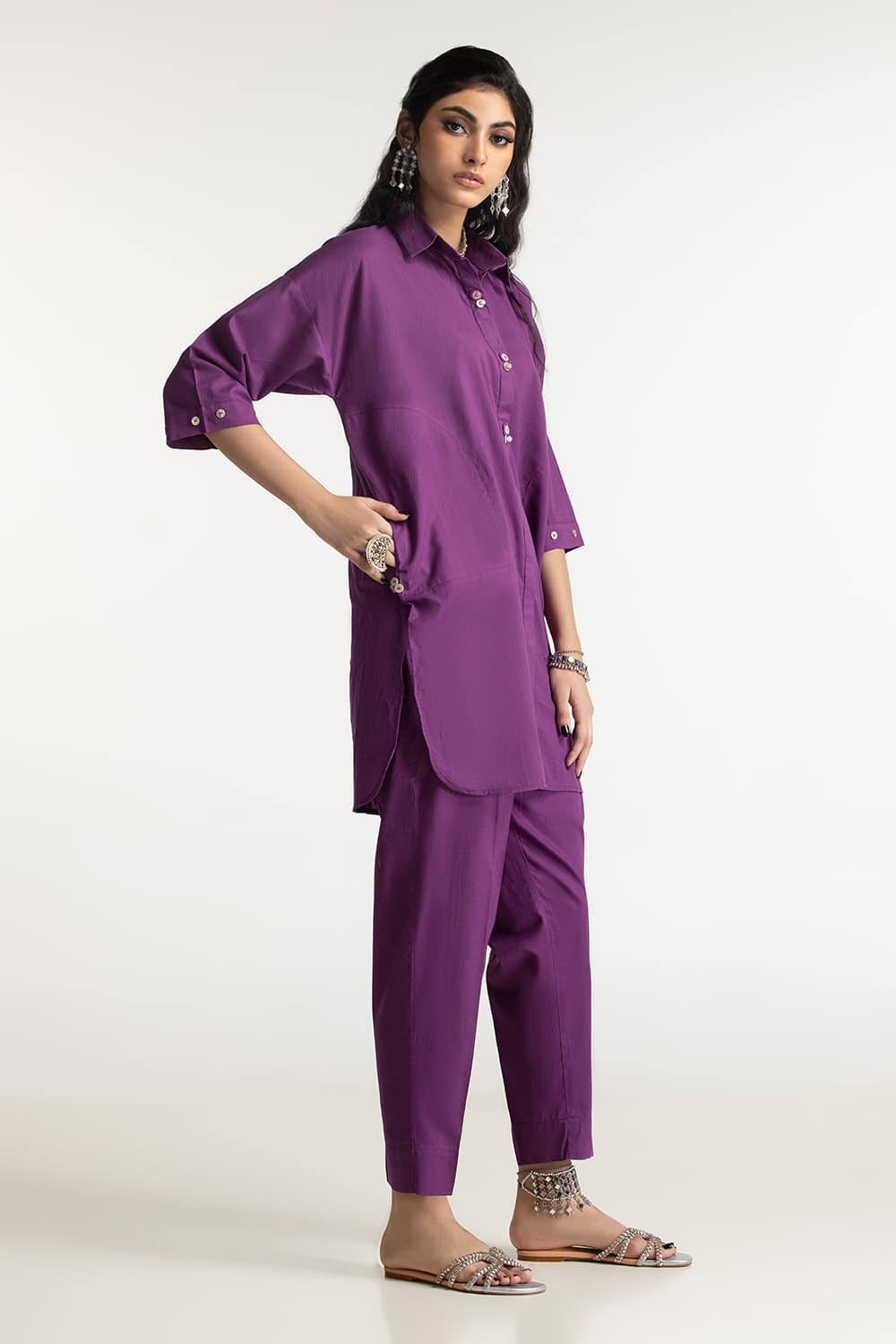 Ready to wear Redefine elegance with this sophisticated 2PC purple kurta with a button-down front and collar neckline. Matched with straight-cut trousers, this outfit is perfect for a graceful and polished look.