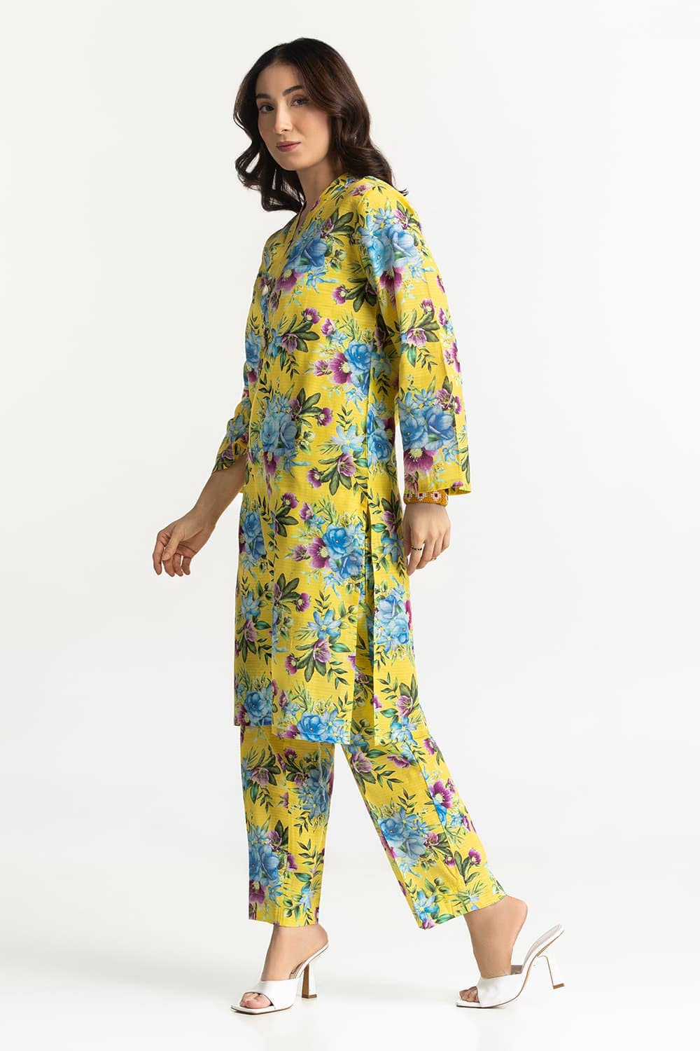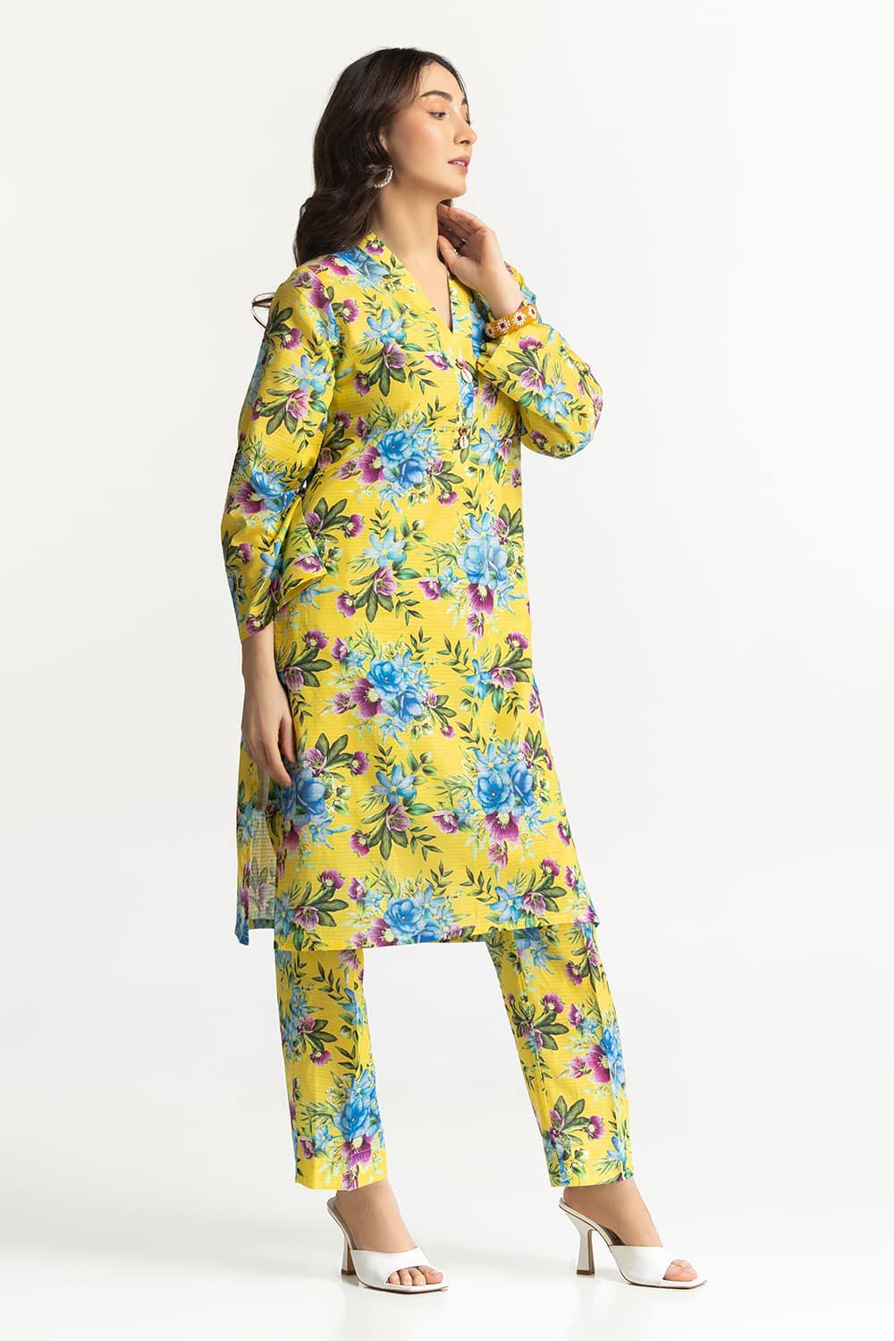 Ready to wear Brighten your day with this 3PC floral suit, adorned with blue and purple blossoms. The V-neckline enhances its appeal, complemented by straight trousers for a chic and comfortable outfit.