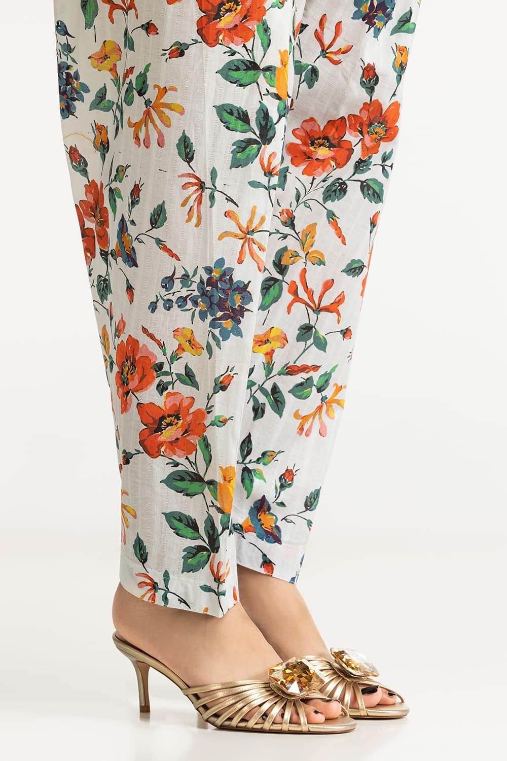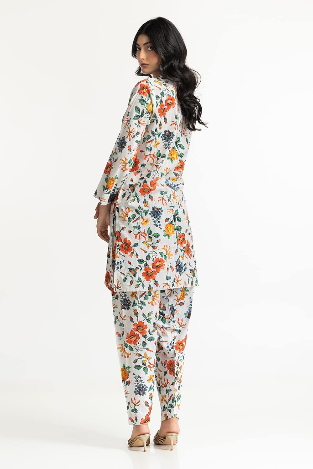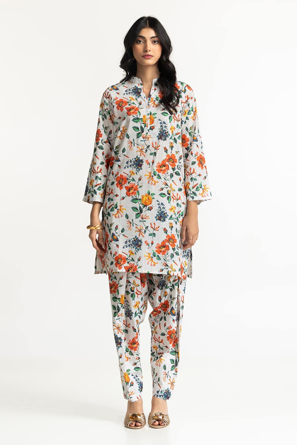 Ready to wear Embrace a fresh look with this 2PC floral suit, showcasing an array of colorful flowers. It features a round neckline and straight-cut sleeves with loose-fitting trousers providing ease and elegance.