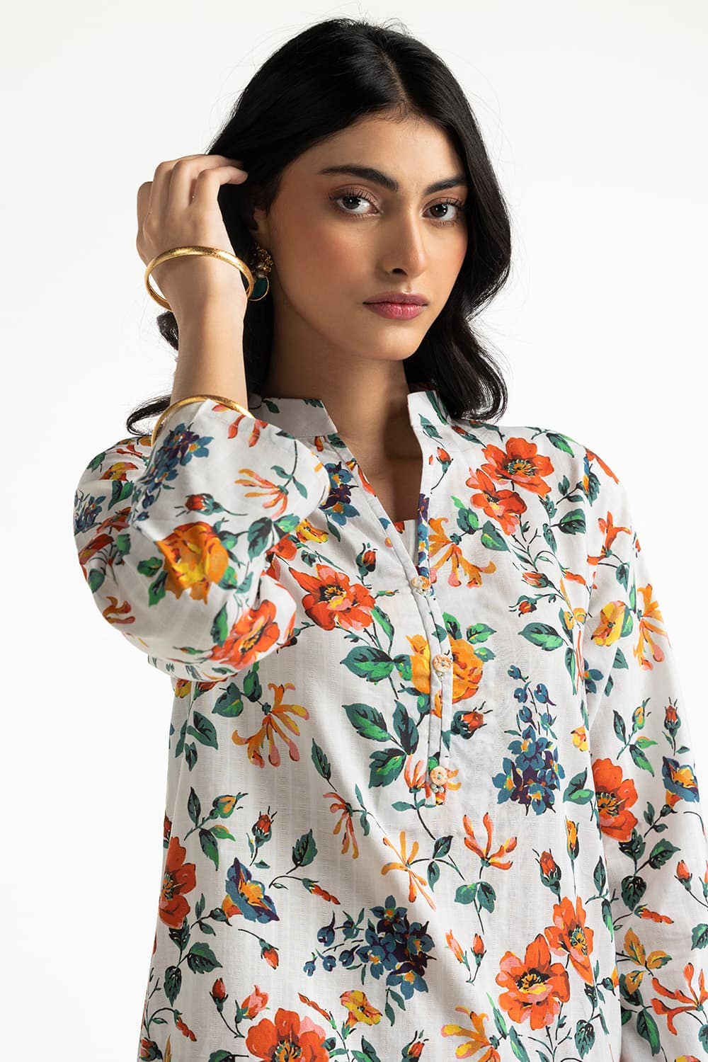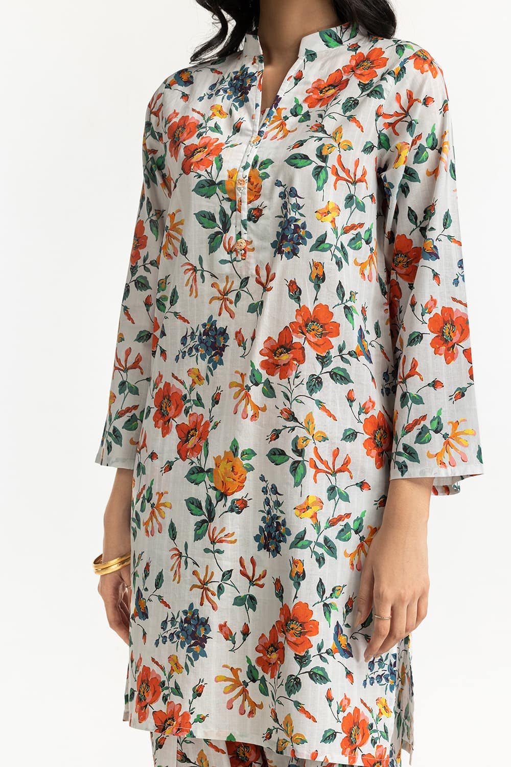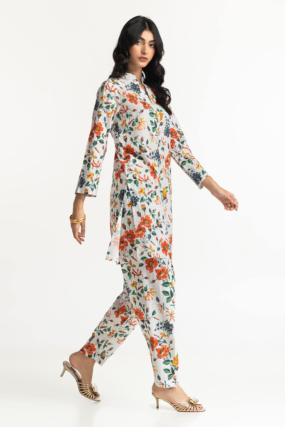 Ready to wear Embrace a fresh look with this 2PC floral suit, showcasing an array of colorful flowers. It features a round neckline and straight-cut sleeves with loose-fitting trousers providing ease and elegance.