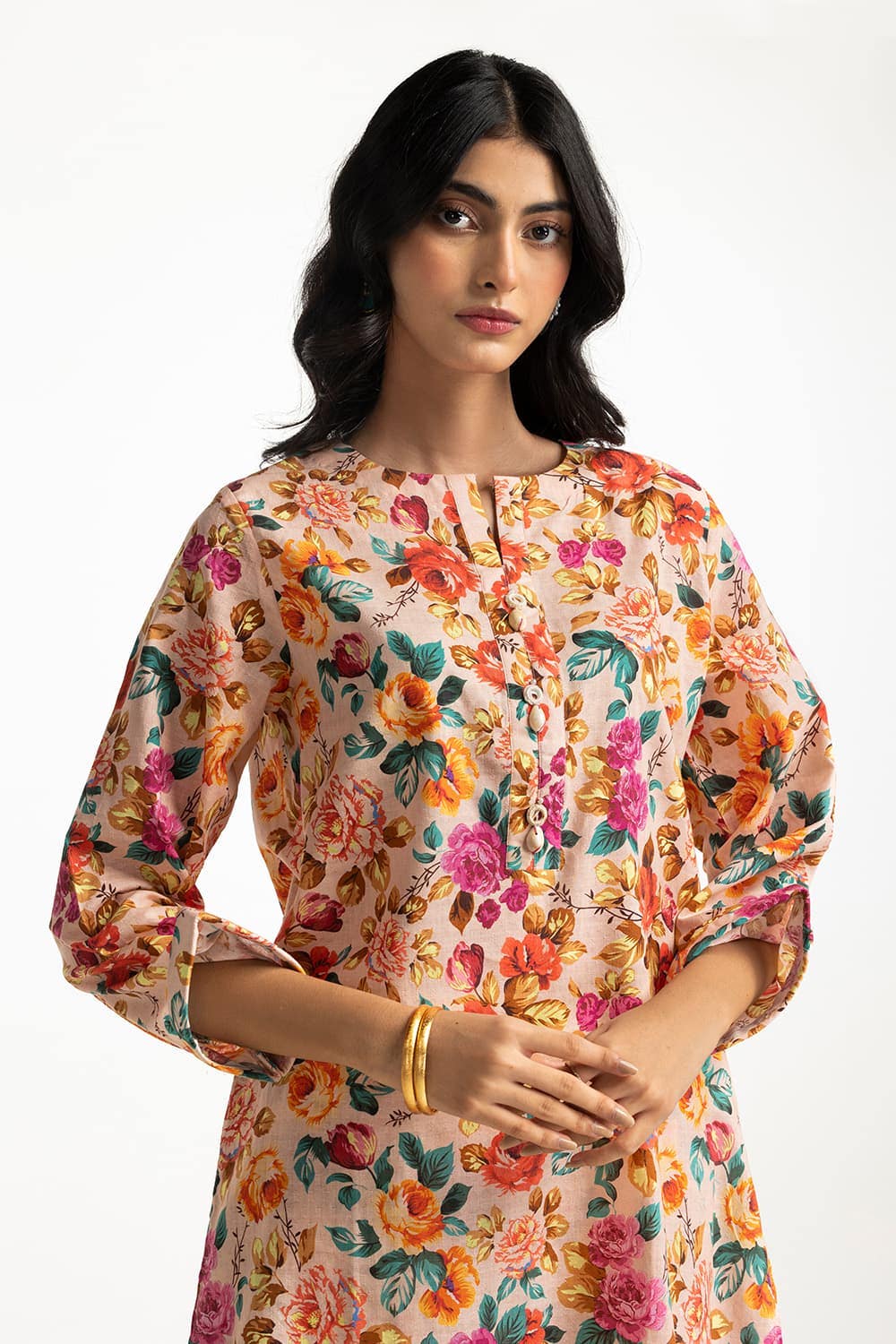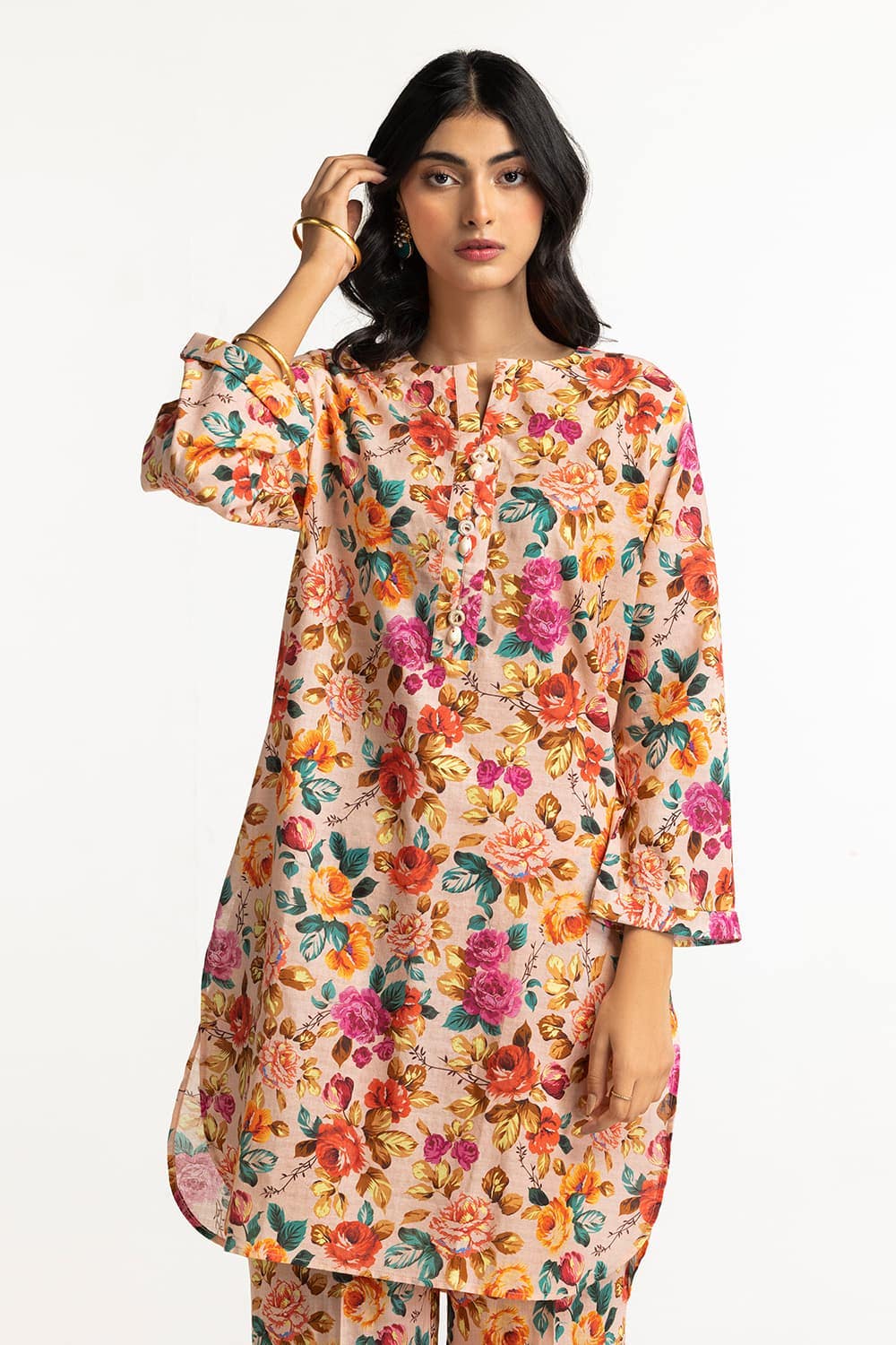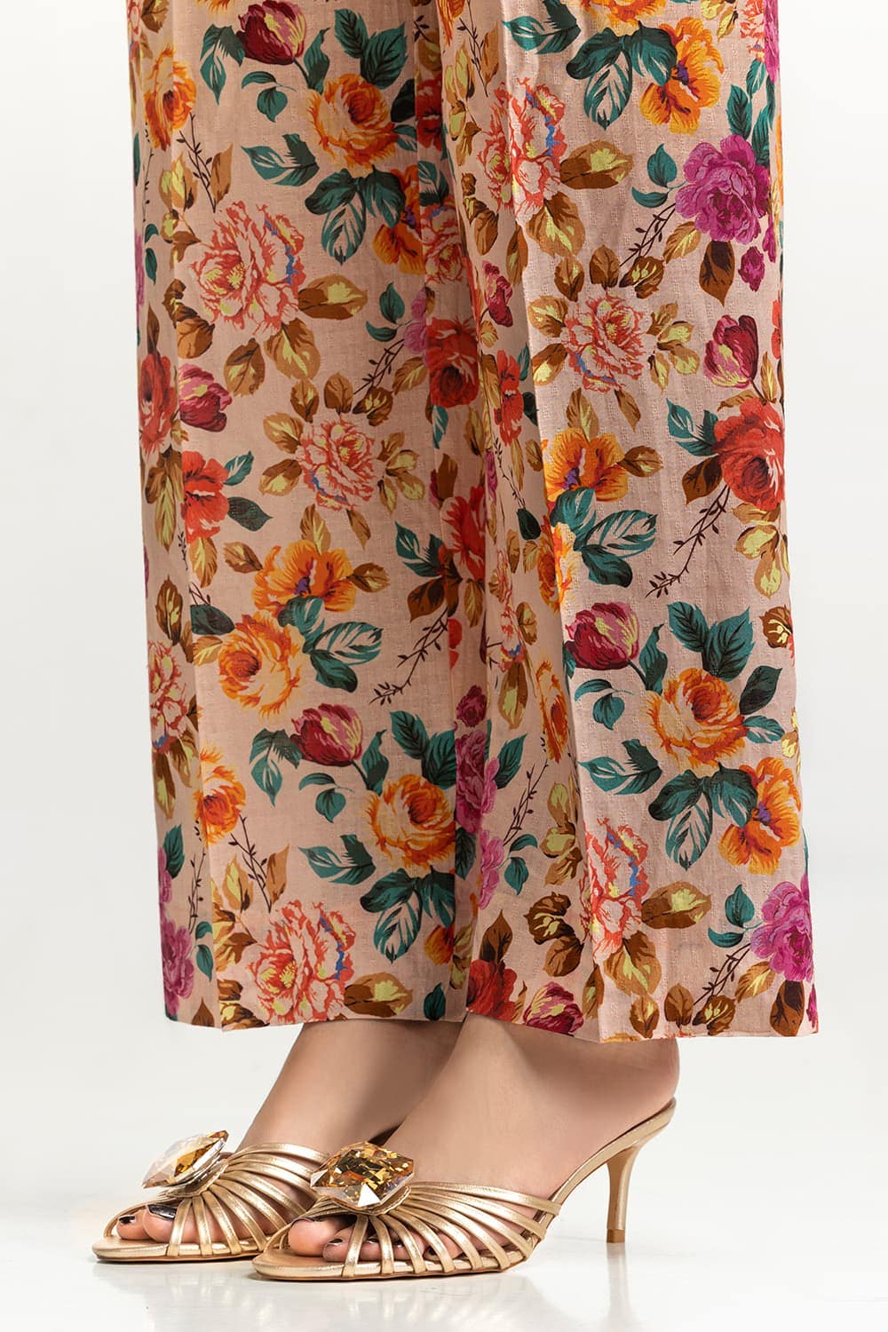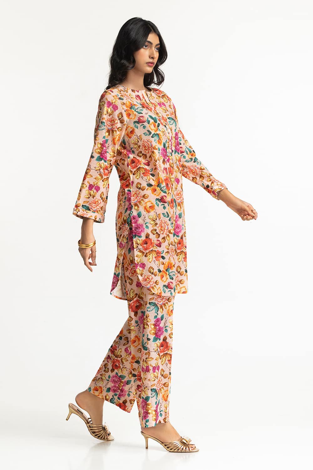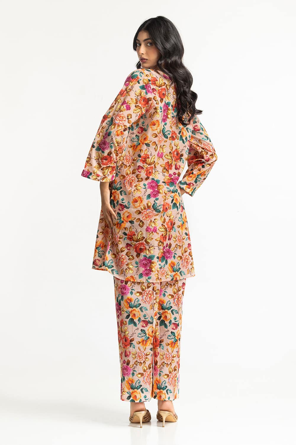 Ready to wear Add a touch of elegance with this 2PC floral suit, featuring a mix of vibrant flowers. The round neckline and flared sleeves enhance its charm, while the straight trousers ensure a flattering and comfortable fit.