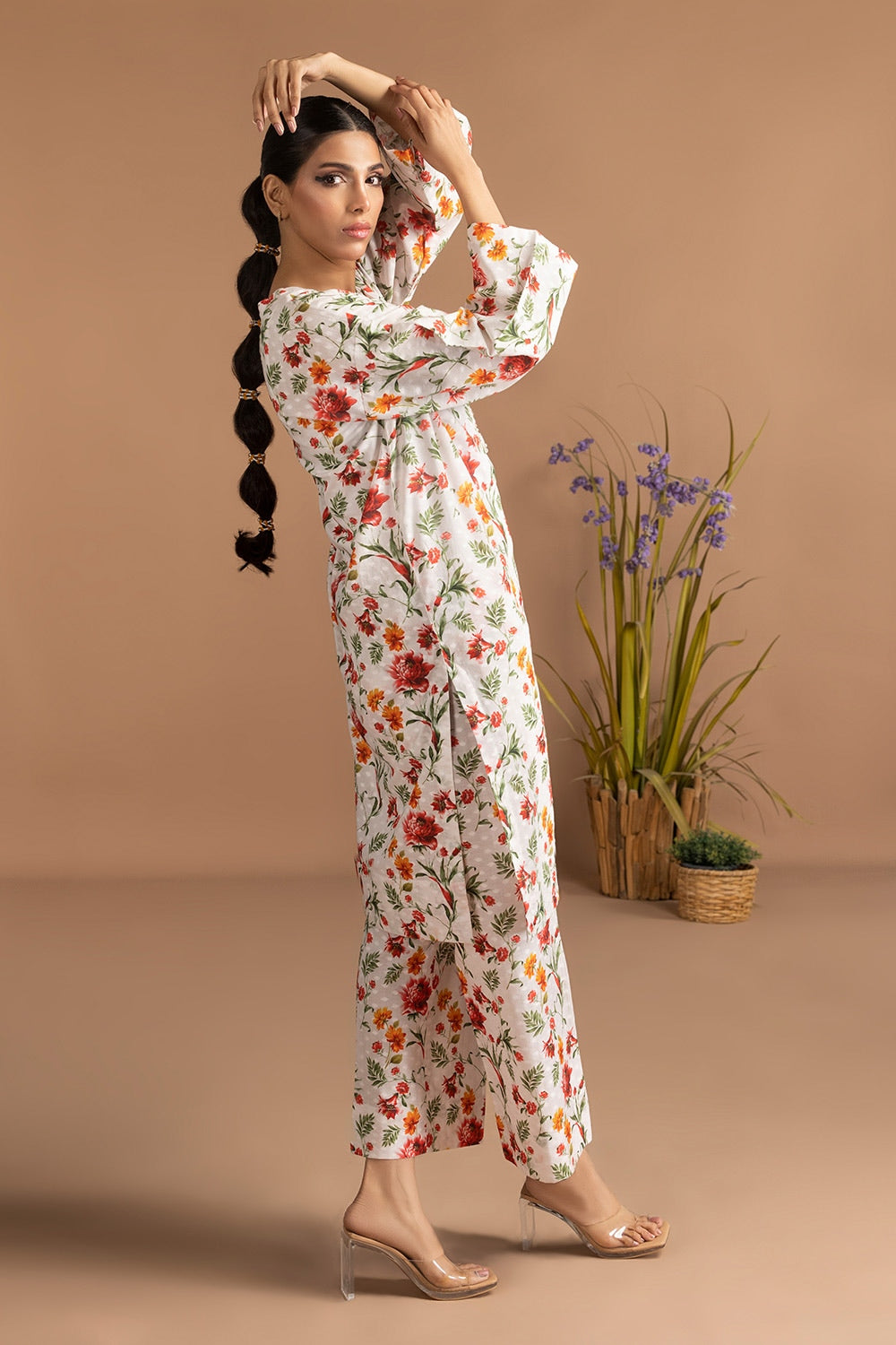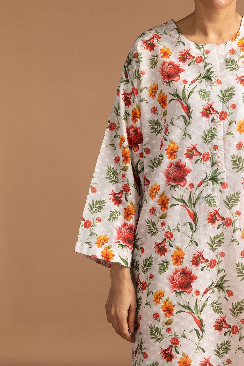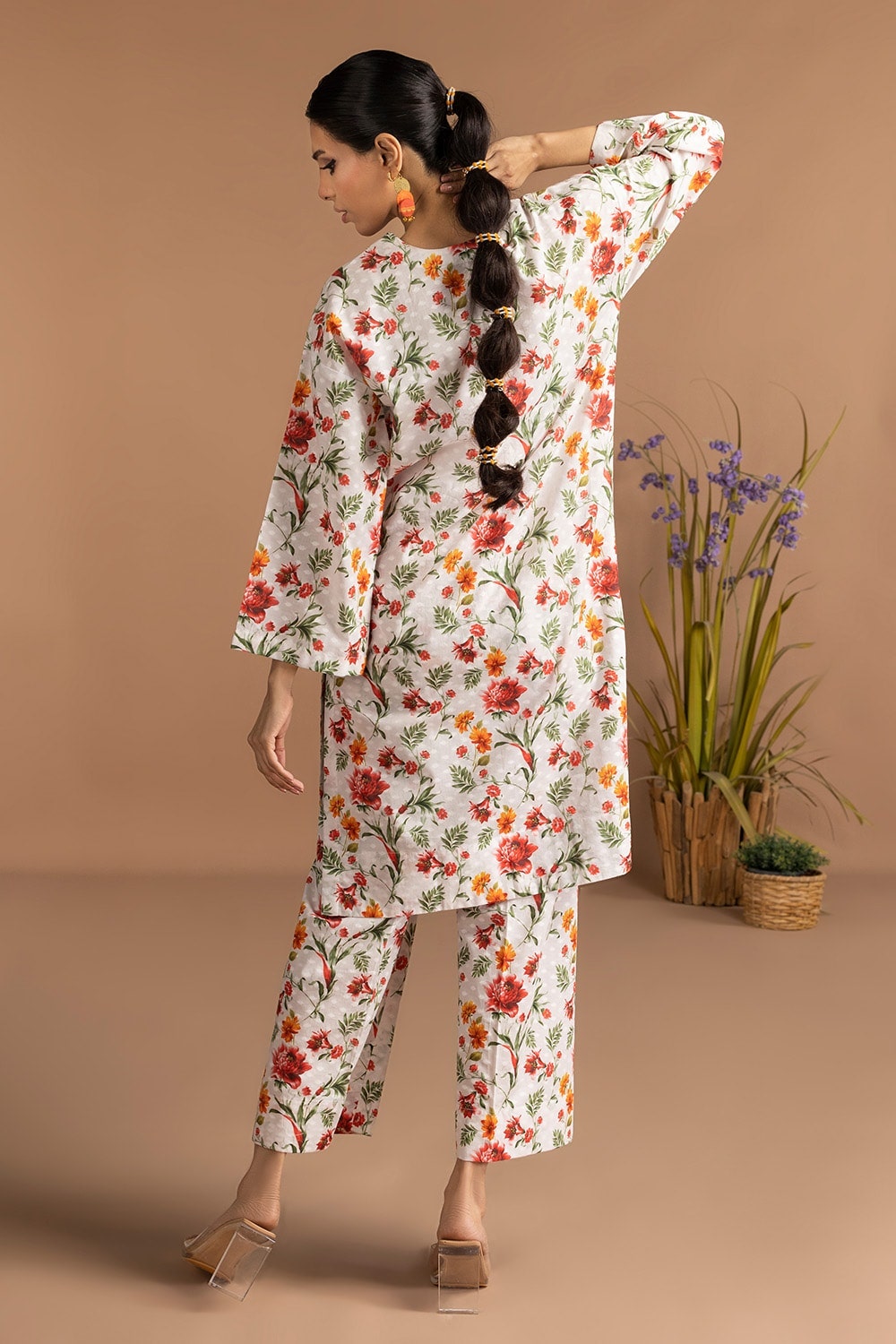Ready to wear Brighten your wardrobe with this charming 2PC floral suit. The white kurta is adorned with vibrant red and orange floral prints, paired with matching trousers for a cohesive and stylish look.