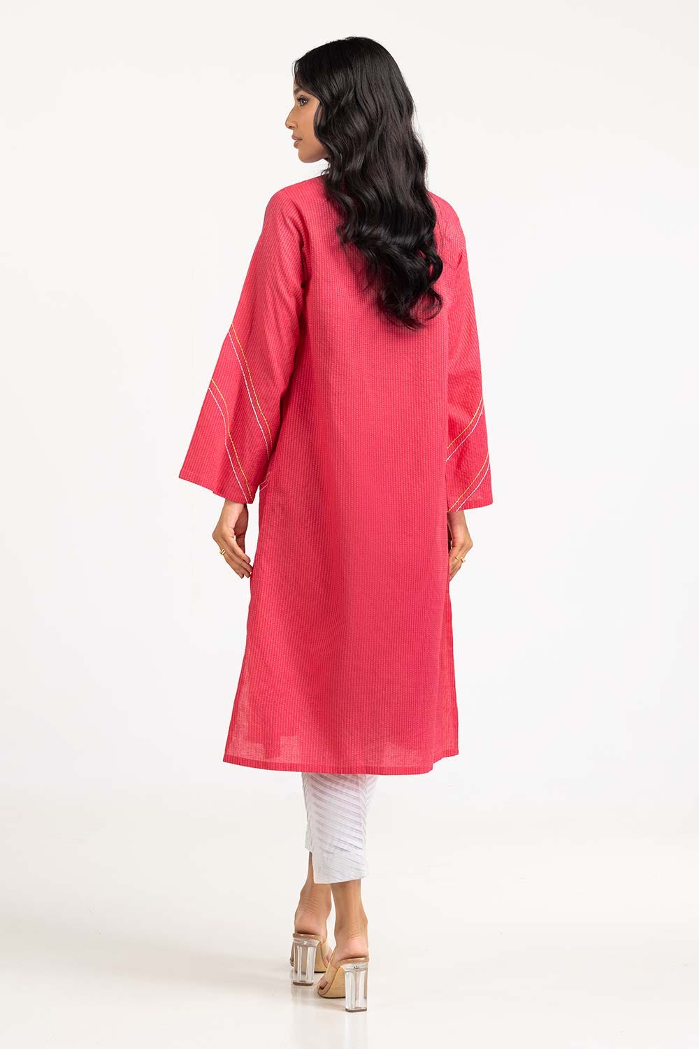 Ready to wear Pink Dyed Cotton Stripes Embroidered Print Shirt with band collar with a V, straight sleeves and a rectangular hem.