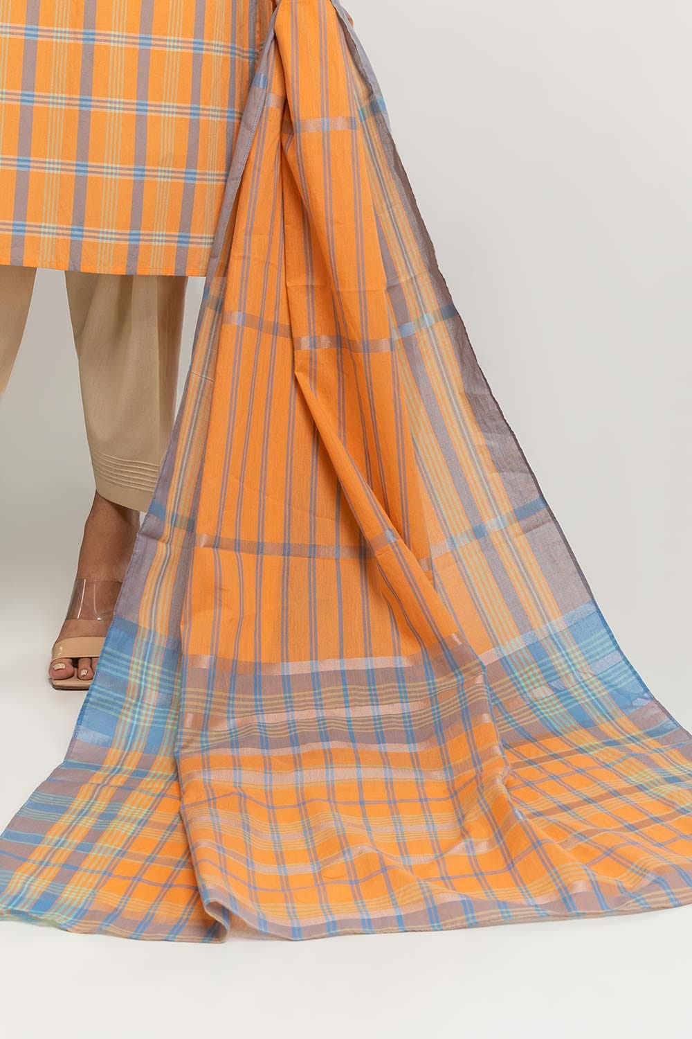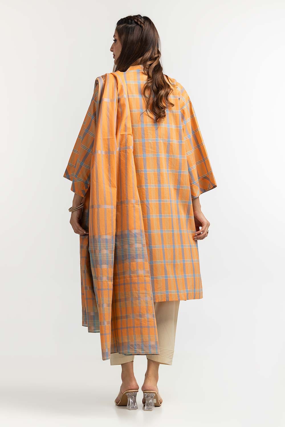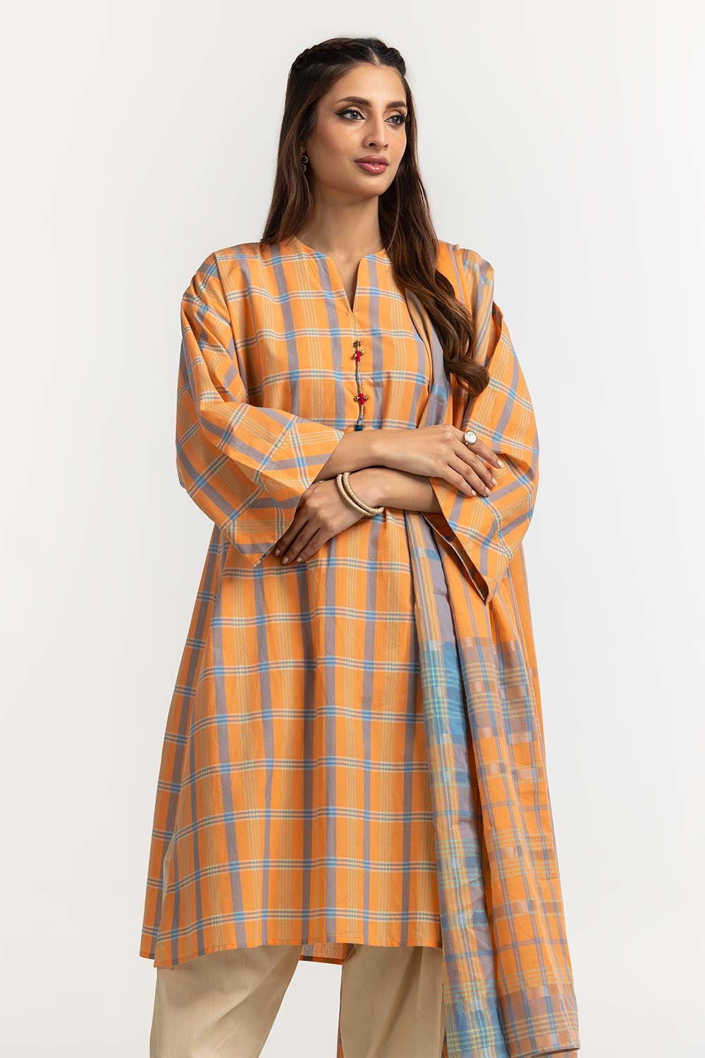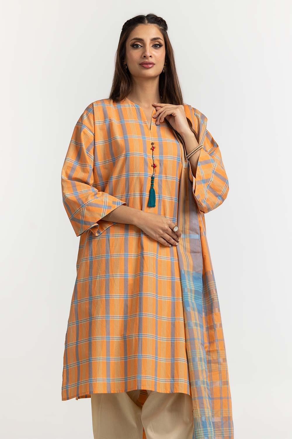 Ready to wear Add some charm to your summer wardrobe with this peach cotton yarn dyed shirt, featuring an elegant checkered print overall with a v-neck line and a tassle style embelishment on the placket paired with a matching dupatta to complete the elegant look.