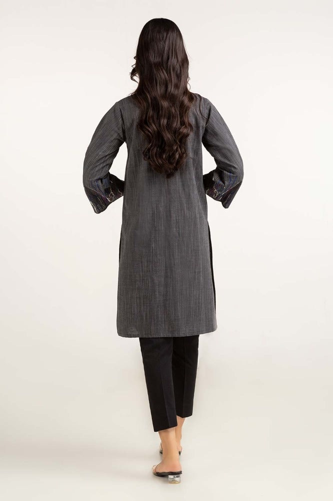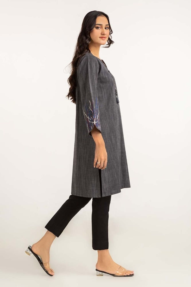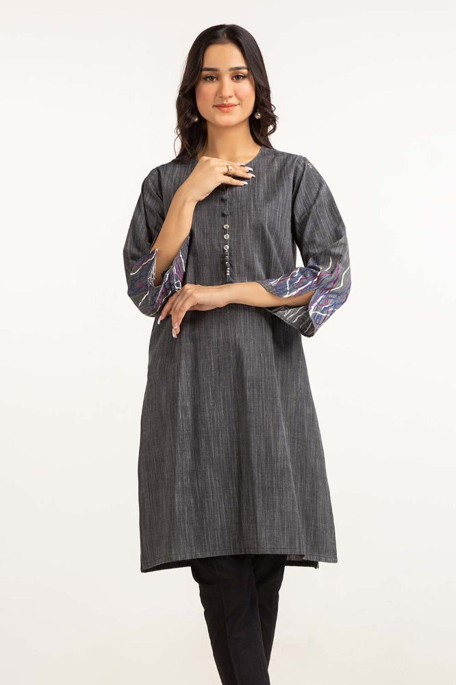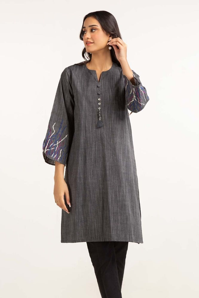 Ready to wear Dyed cotton yarn dyed shirt with v-collar followed by buttons. Embroidered hem, wide sleeves with a slit.