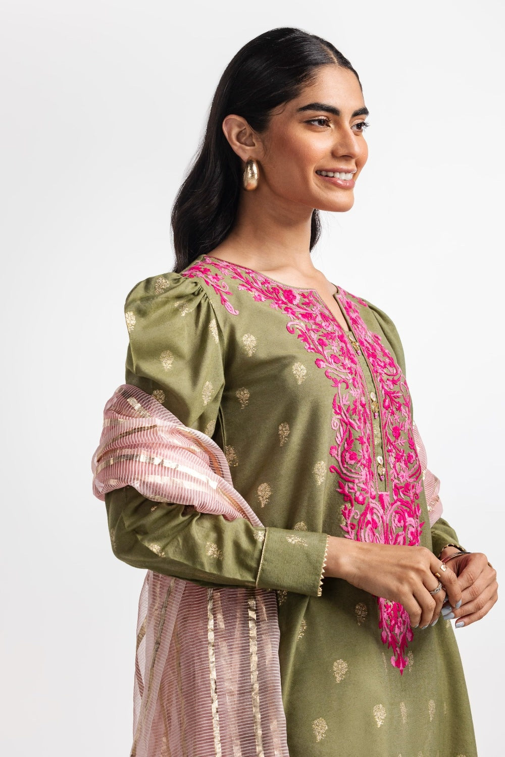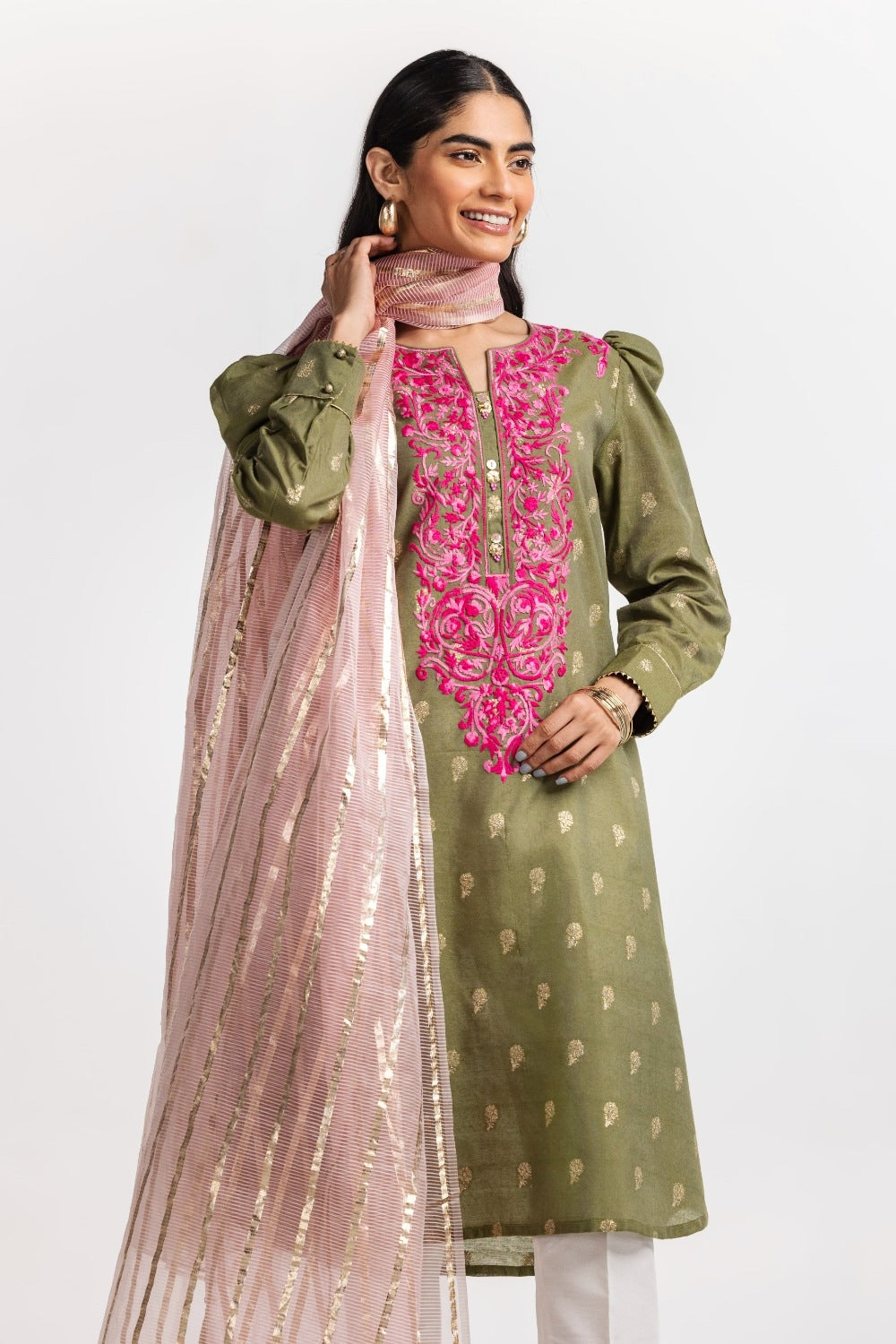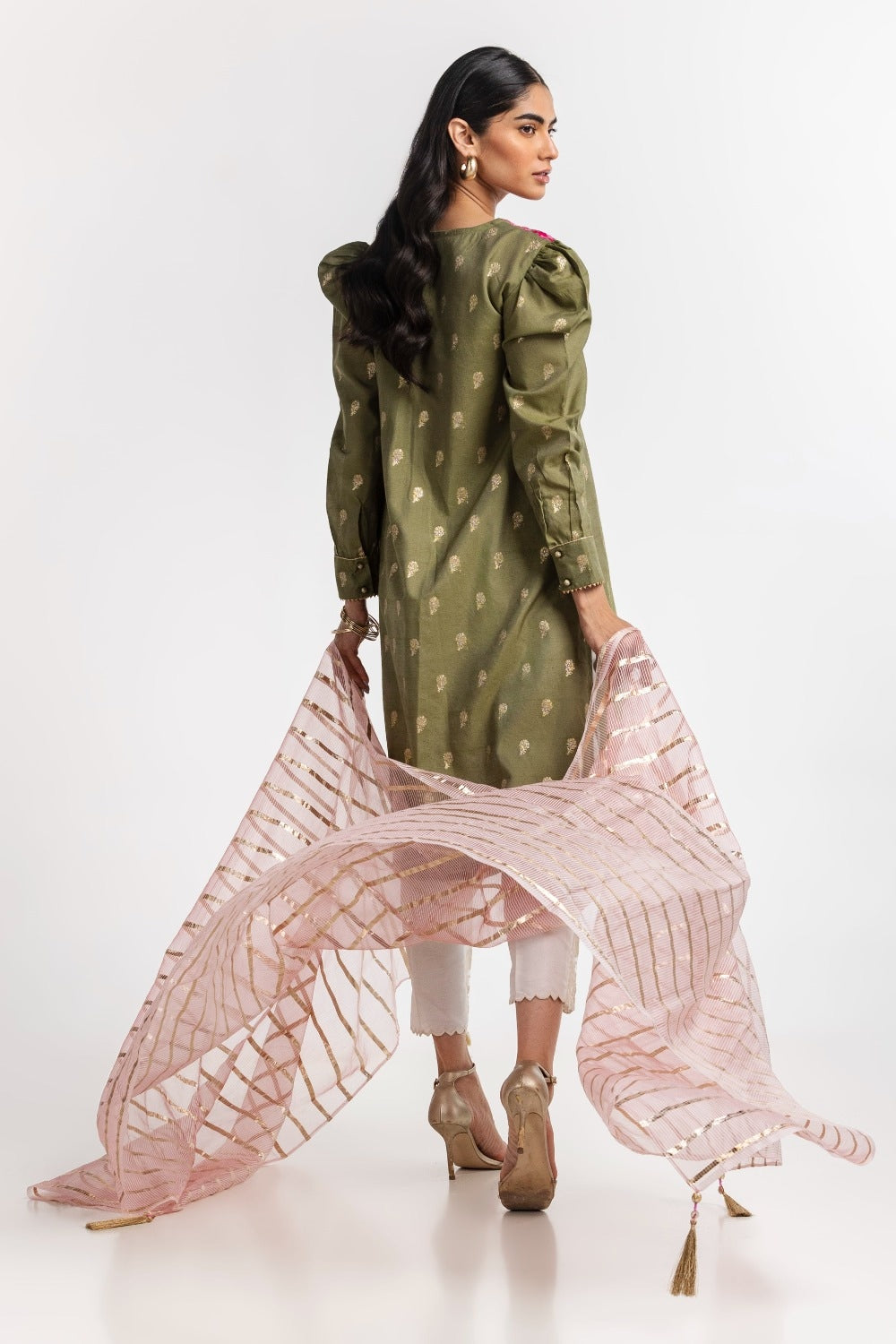 Ready to wear Make a bold statement with this stunning green kurta, featuring vibrant pink embroidery on the front and subtle gold motifs throughout. The full puff sleeves and round neckline add a dramatic touch, perfect for both casual and festive occasions.