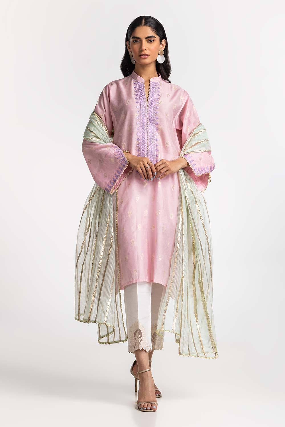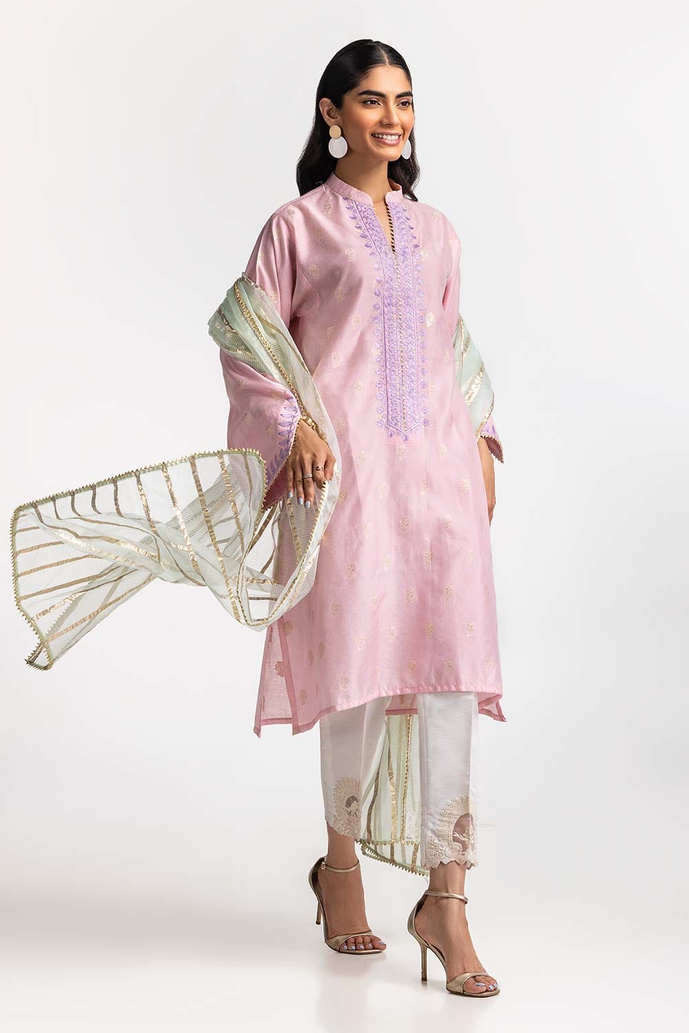Ready to wear Step into elegance with this lovely light pink kurta, featuring delicate lavender embroidery on the front and subtle gold motifs throughout. The full sleeves and round neckline provide a refined touch, making it perfect for both casual and festive occasions.