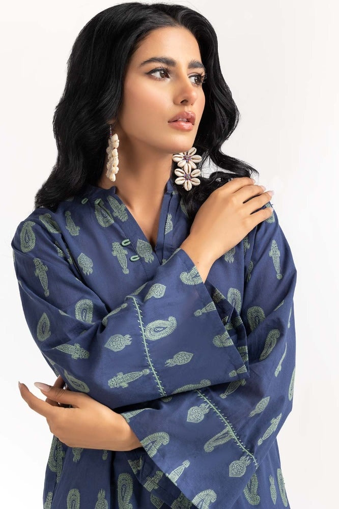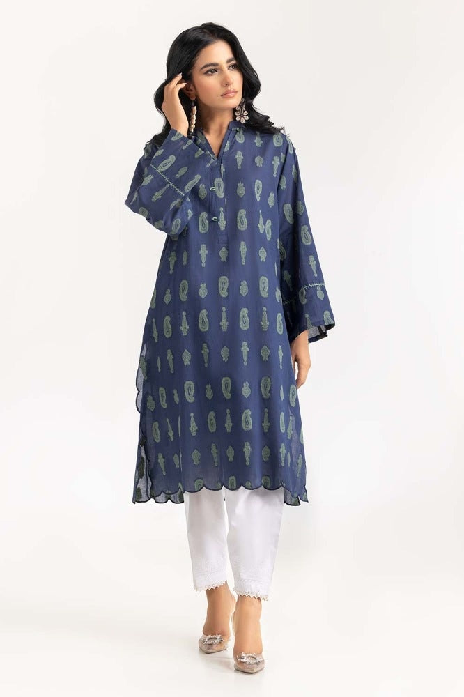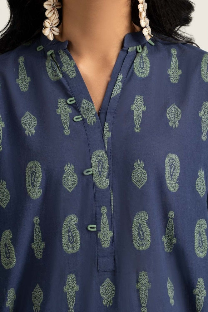 Ready to wear Dyed Jaccquard Shirt with V-collar, A-line sleeves with threaded pattern and a cutwork embroidered side-seam and hem."
