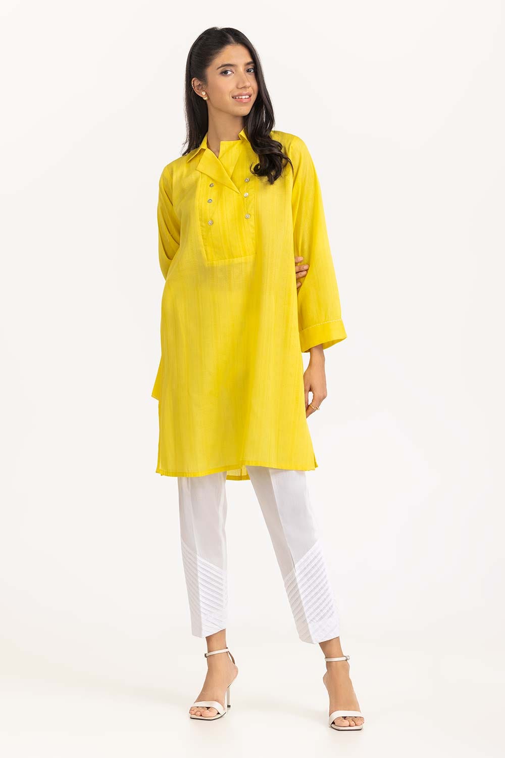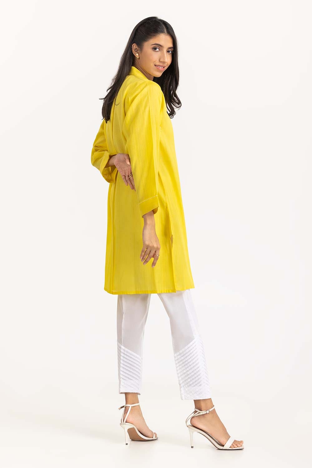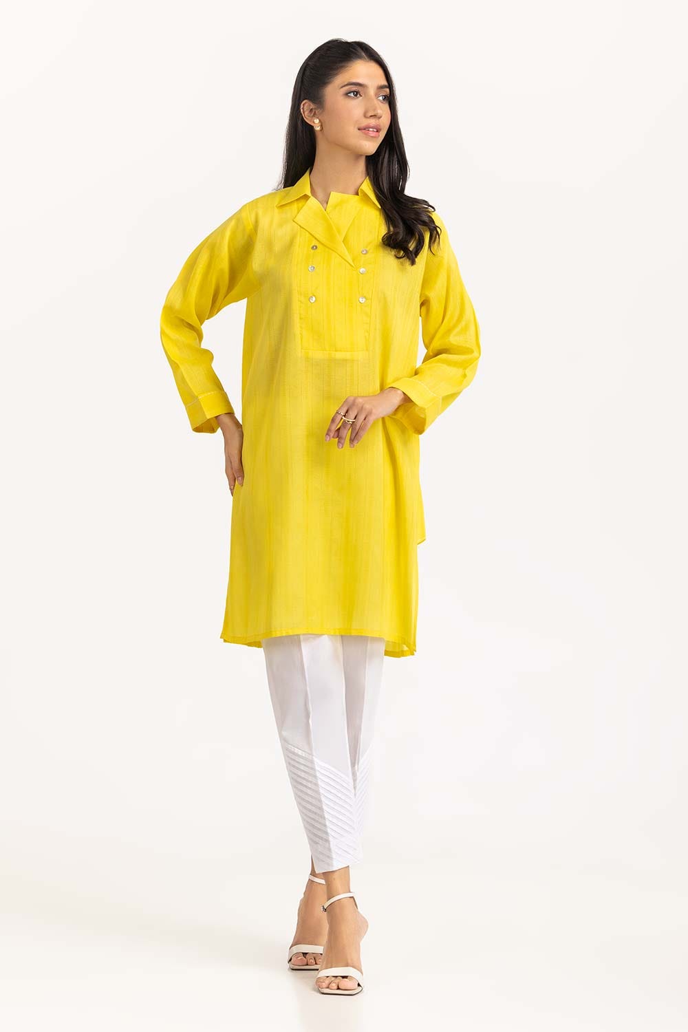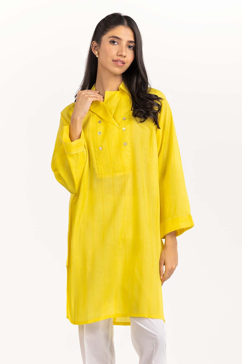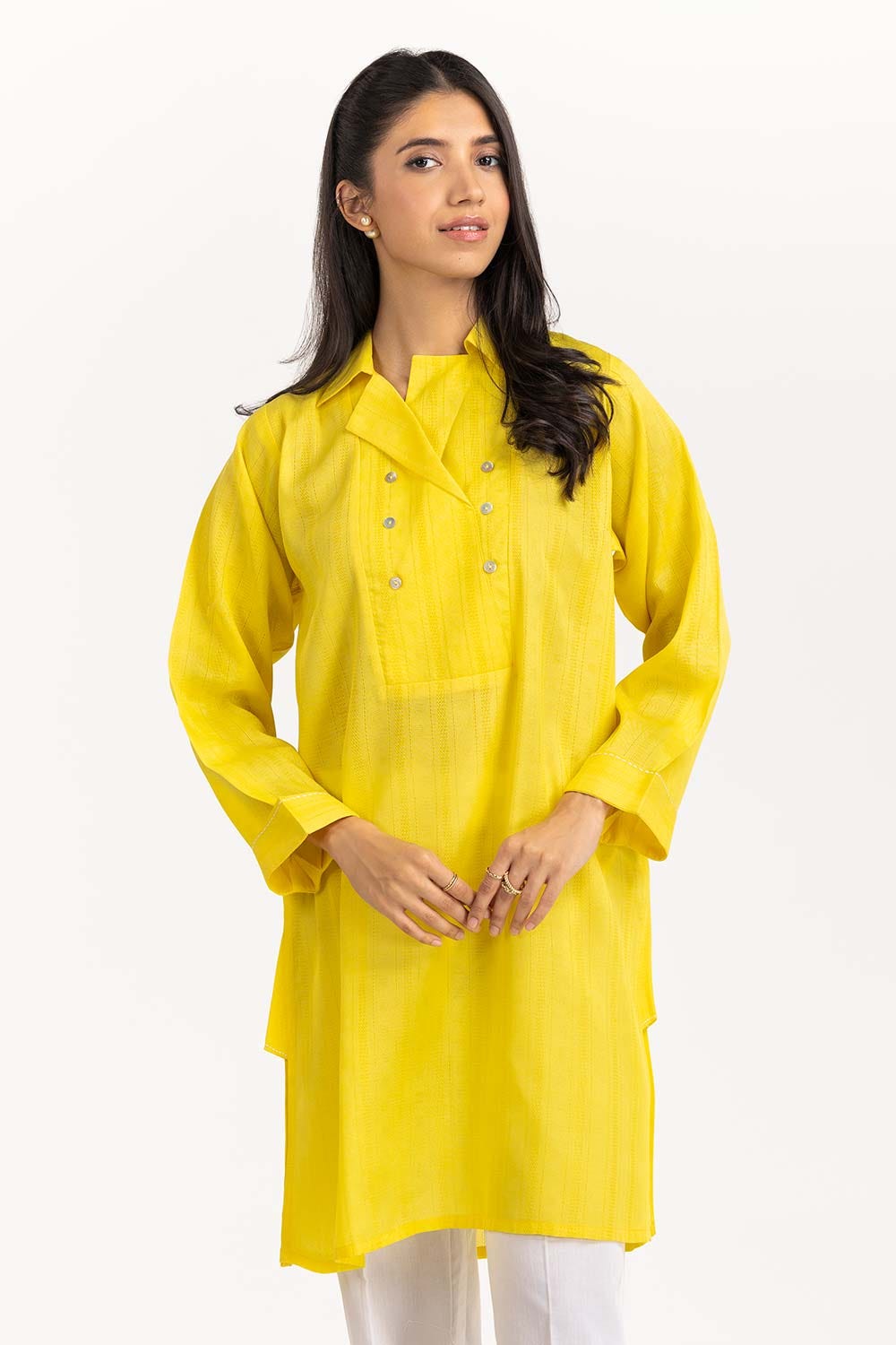 A yellow jacquard shirt featuring an overlapped collar with detailing, straight sleeves and a rectangle hem.".