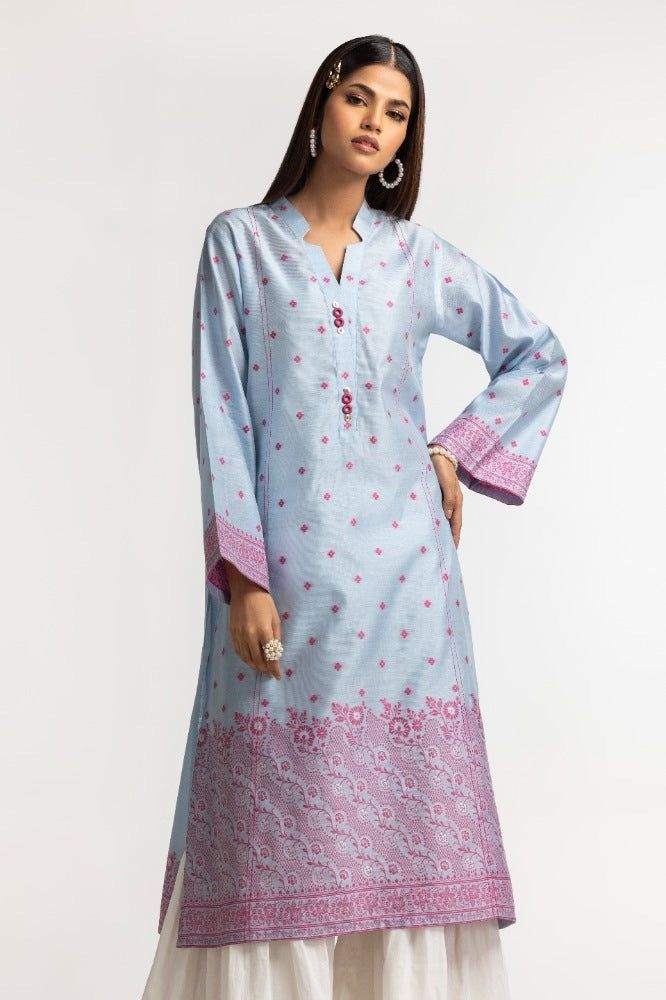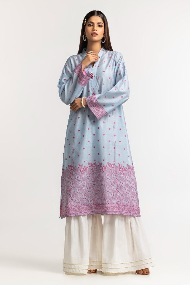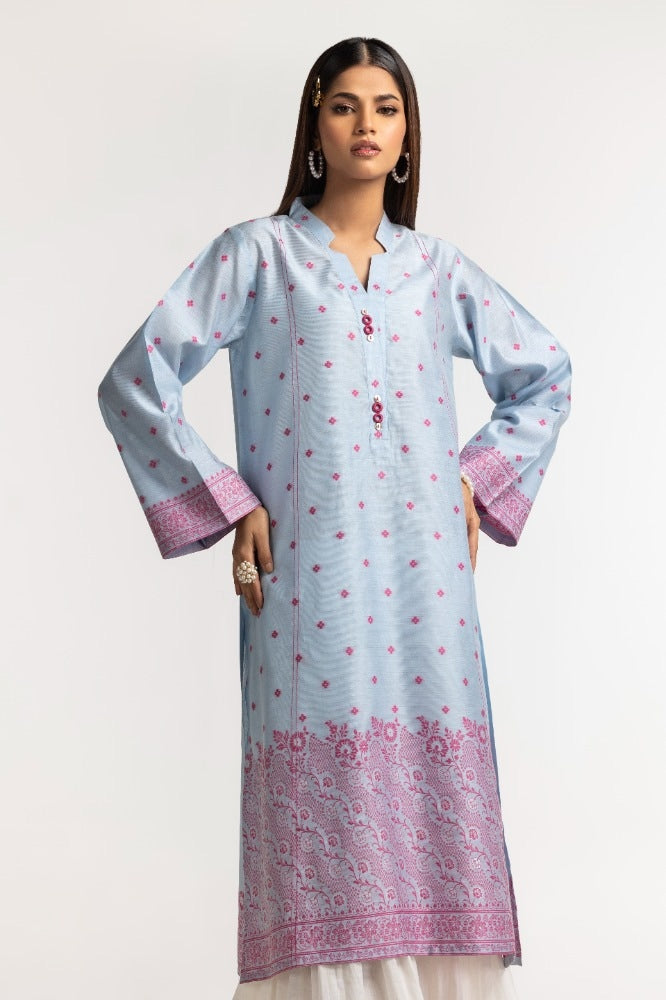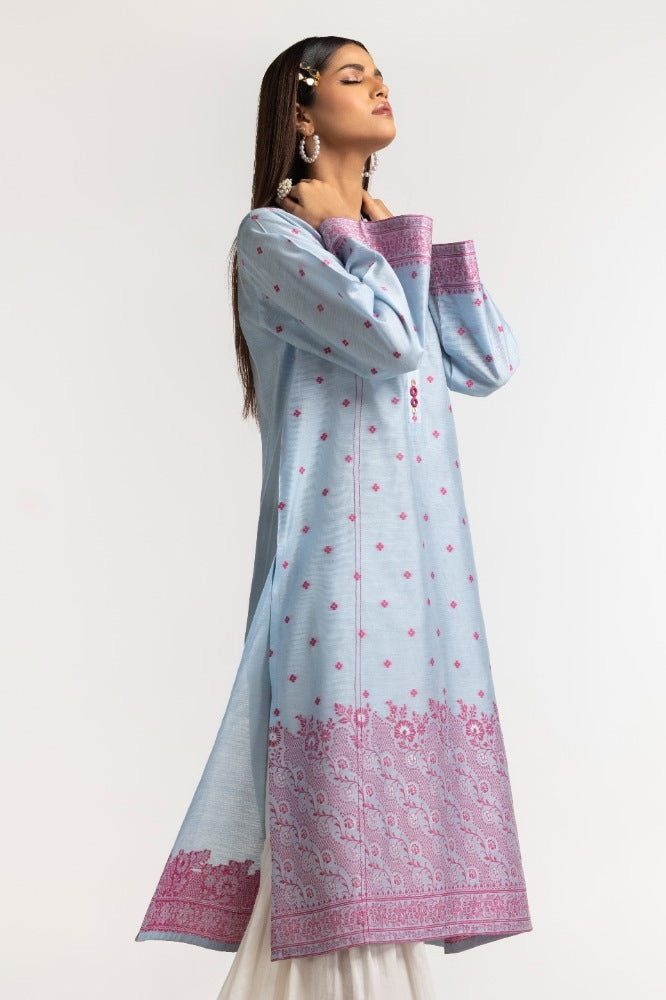 Ready to wear Elevate your style statement with this sky blue dyed khadi jacquard shirt, featuring a straight long shirt with a stylish cut v-collar, embellishments on the placket, and beautiful pattern work on the hem and sleeves, versatile for any day.