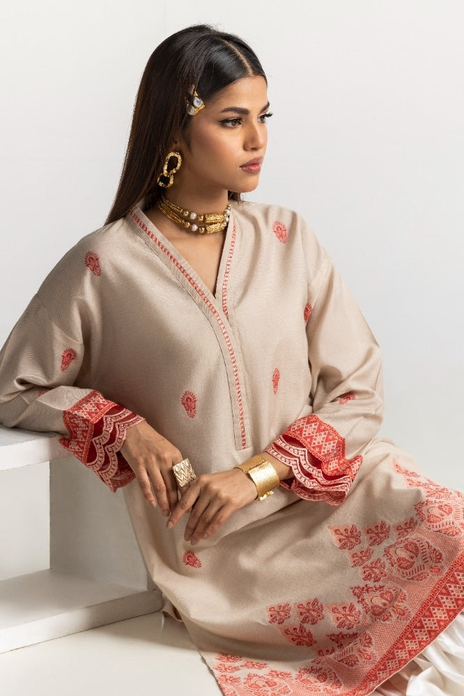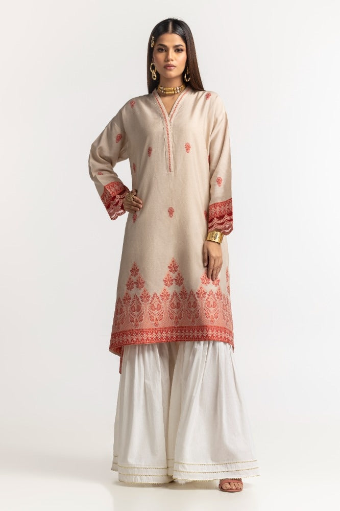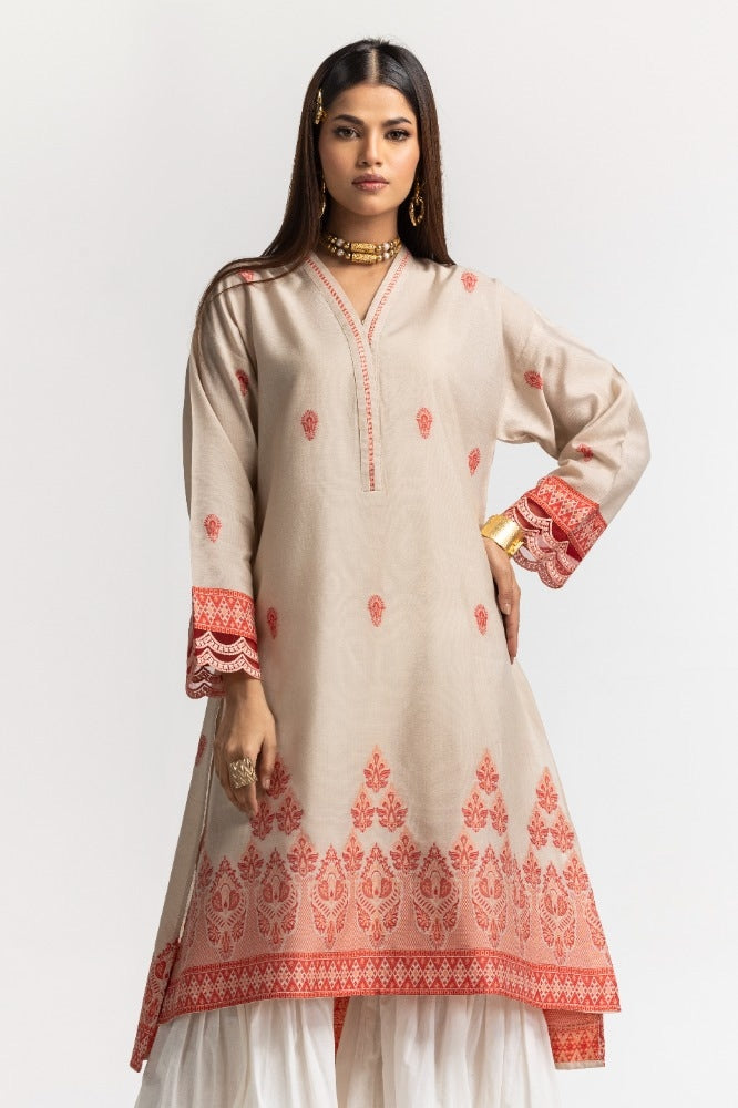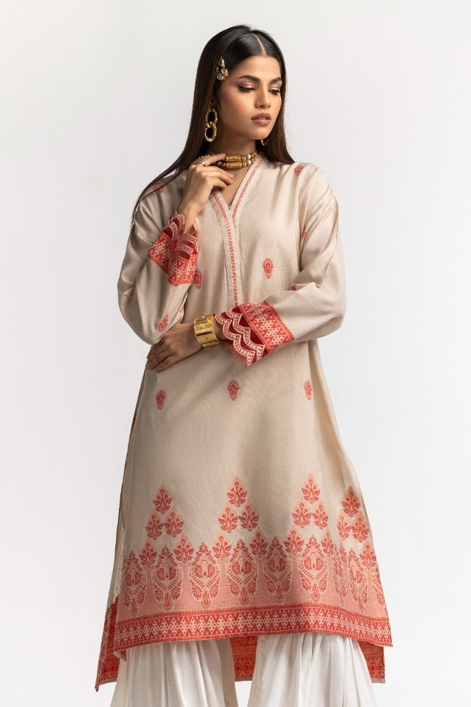 Ready to wear The perfect style for your festive look, this beige-dyed khadi jacquard shirt features an ethnic embroidered design embedded on the front and at the hem, a v-neckline, and intricately designed cuffs just to set you apart at any occasion.