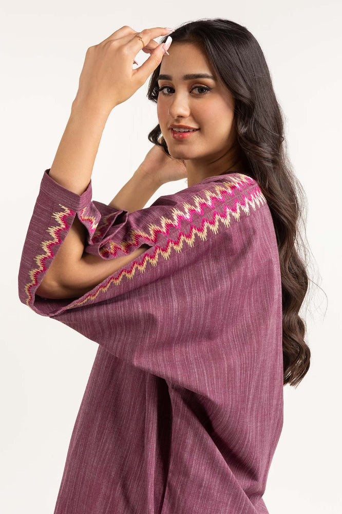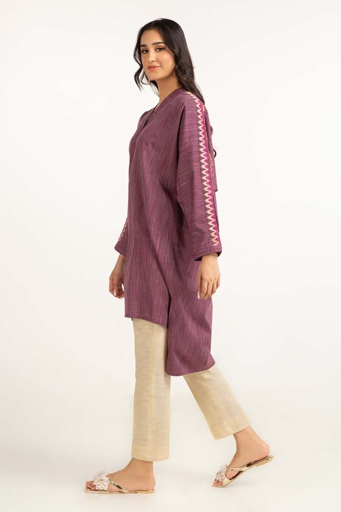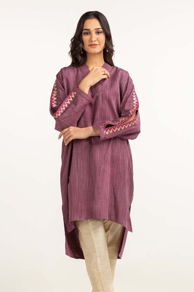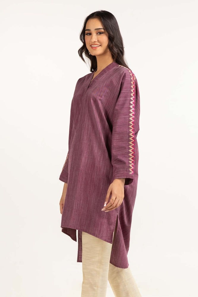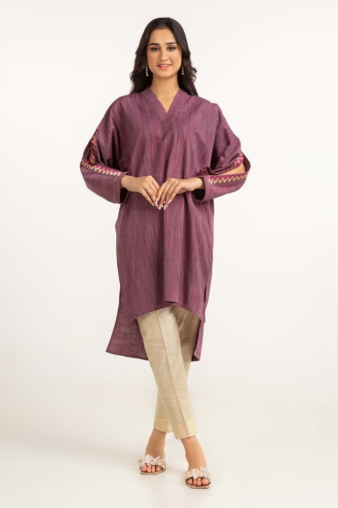 Ready to wear Dyed yarn cotton raglan cut shirt with a V neckline, featuring embroidered sleeves with slit and an asymmetrical hem line.