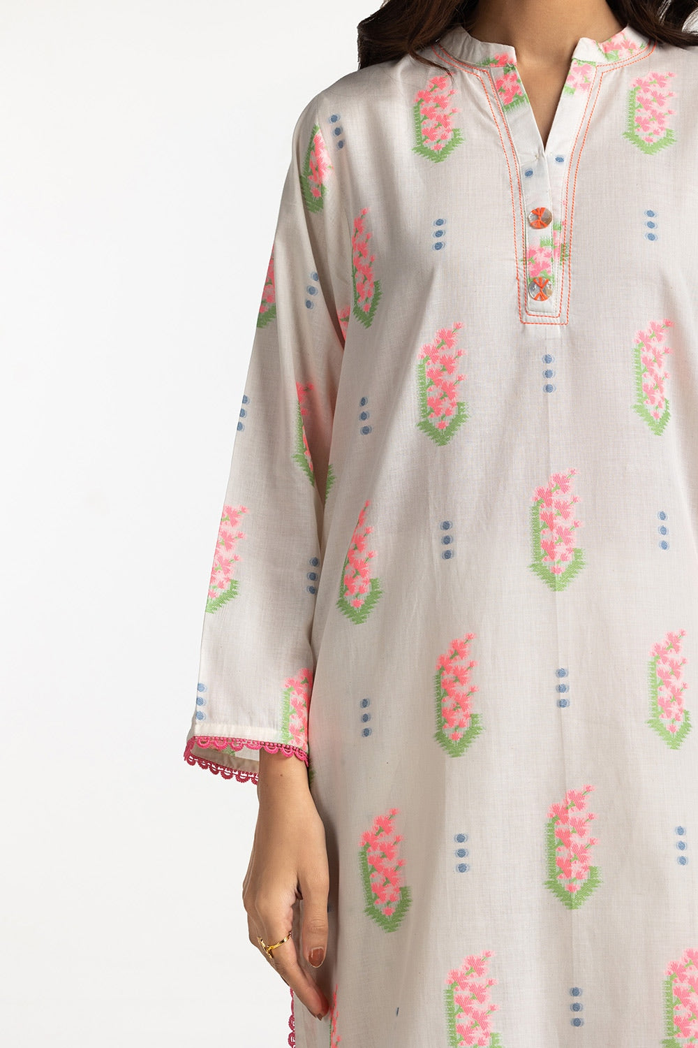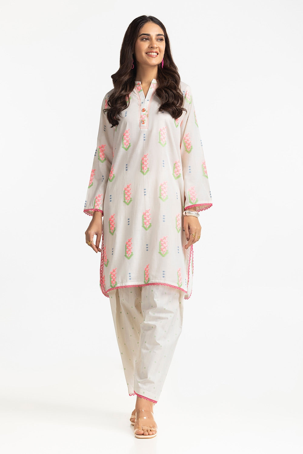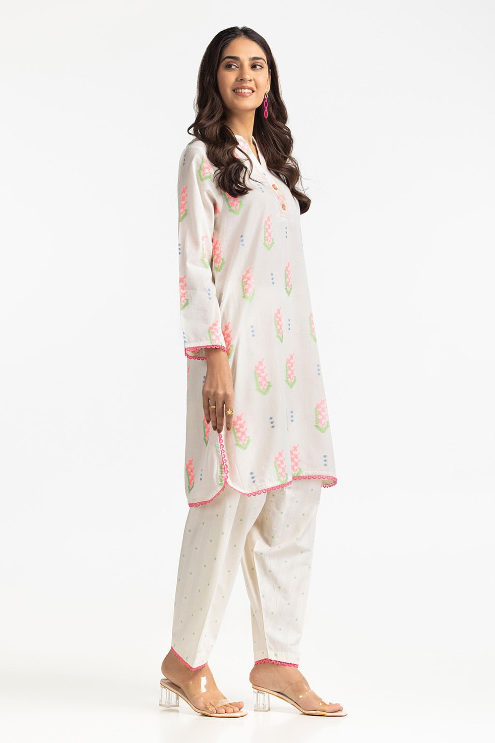 Ready to wear Stay effortlessly chic in this 2PC off white kurta set, highlighted by delicate pink details and paired with relaxed-fit shalwar. Ideal for a casual yet stylish day out.