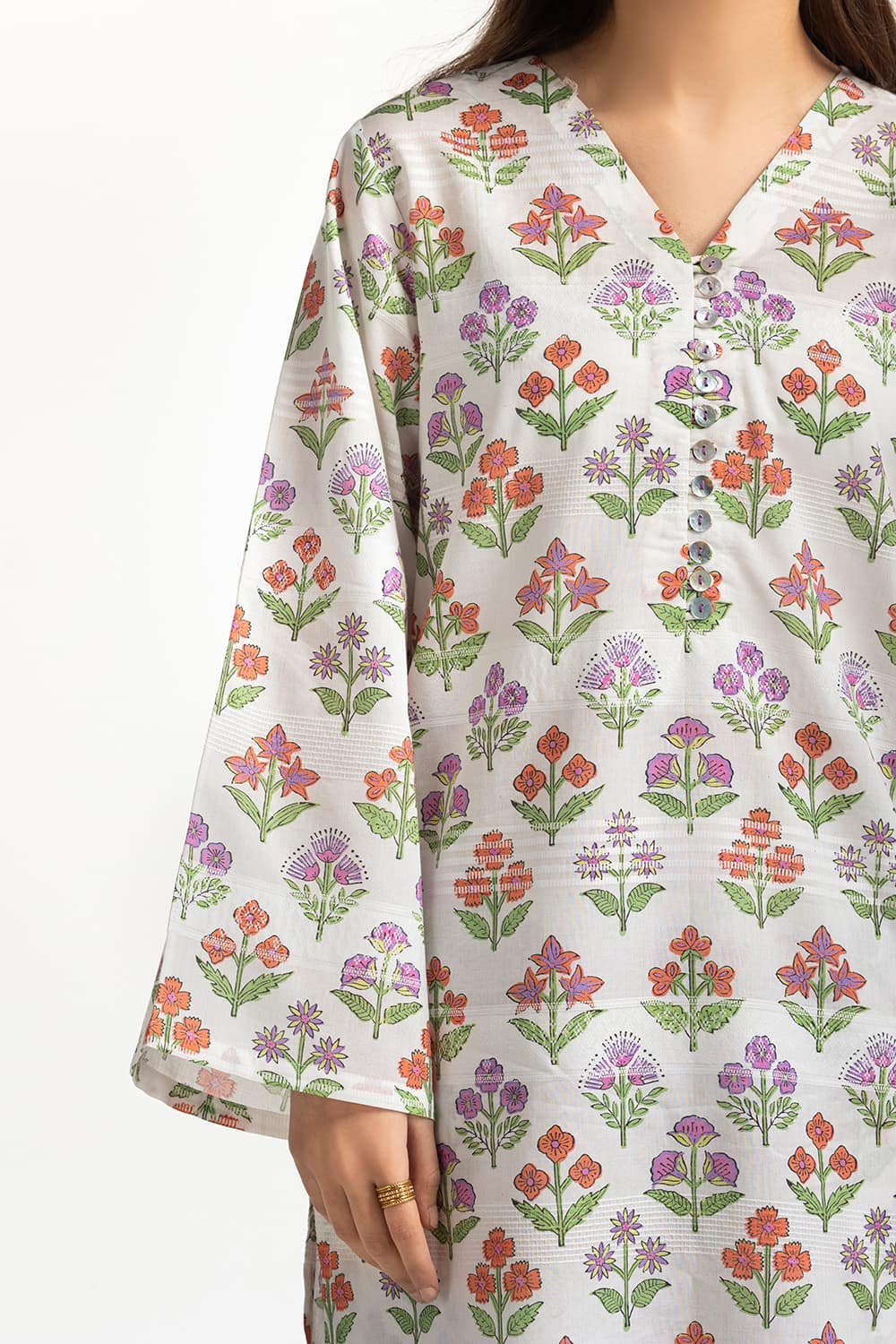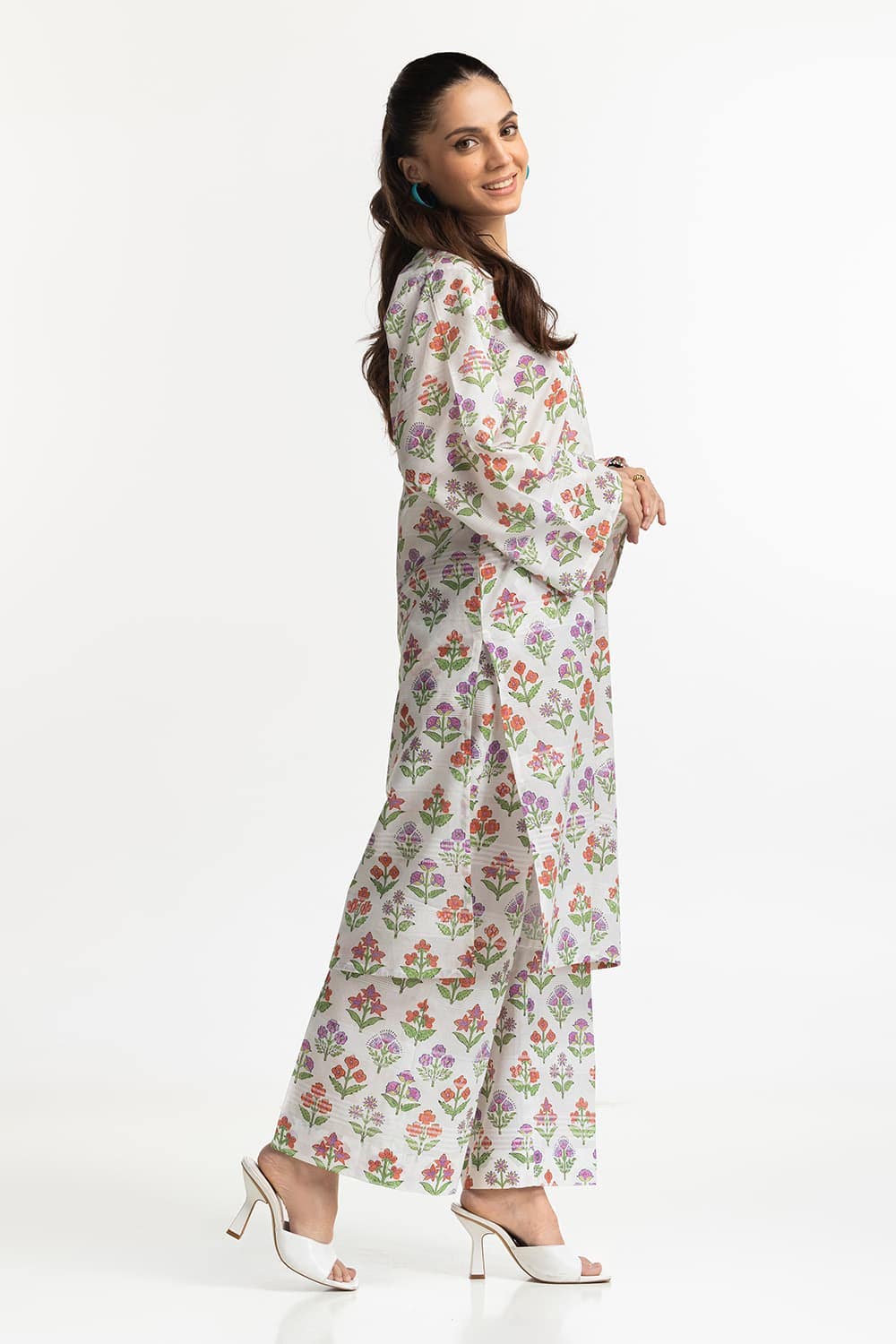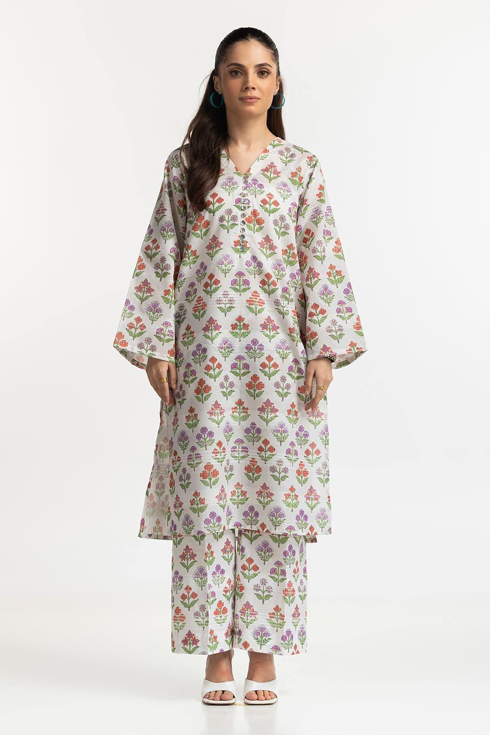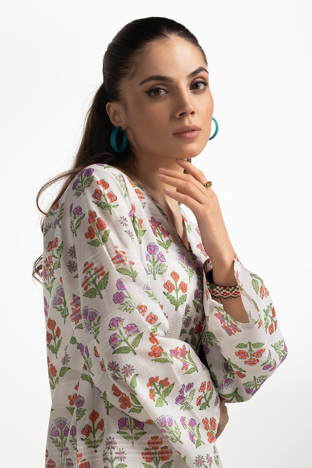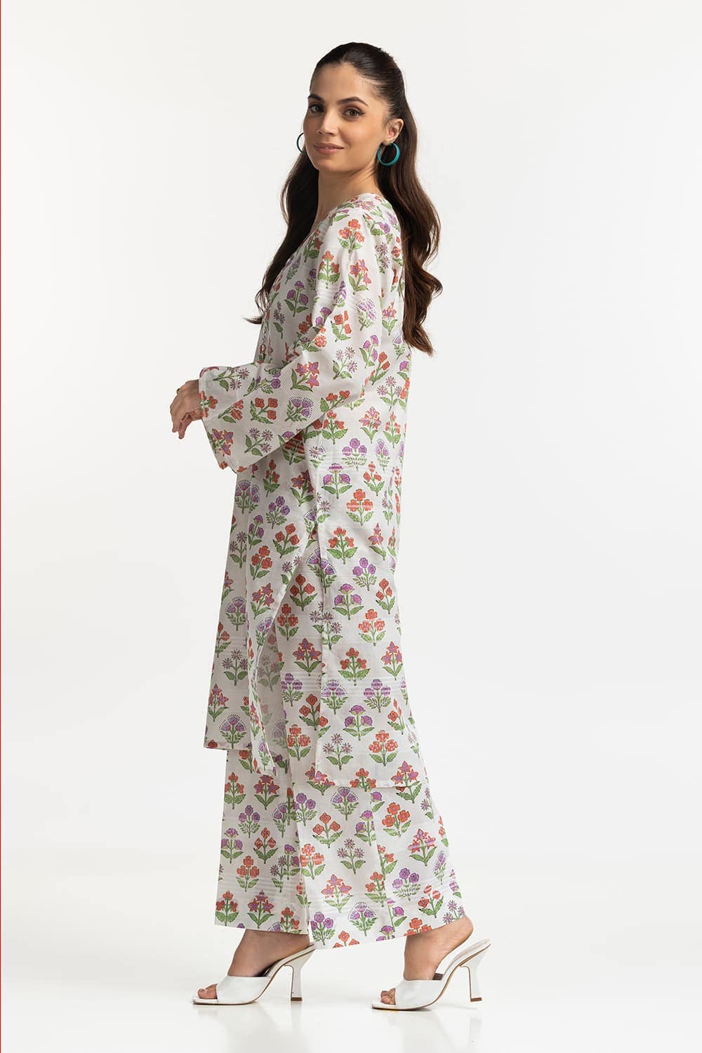 Ready to wear A refreshing off white kurta adorned with a vibrant floral work. The long sleeves and straight-cut design provide a comfortable fit, paired with wide-legged trousers for a chic, laid-back style.