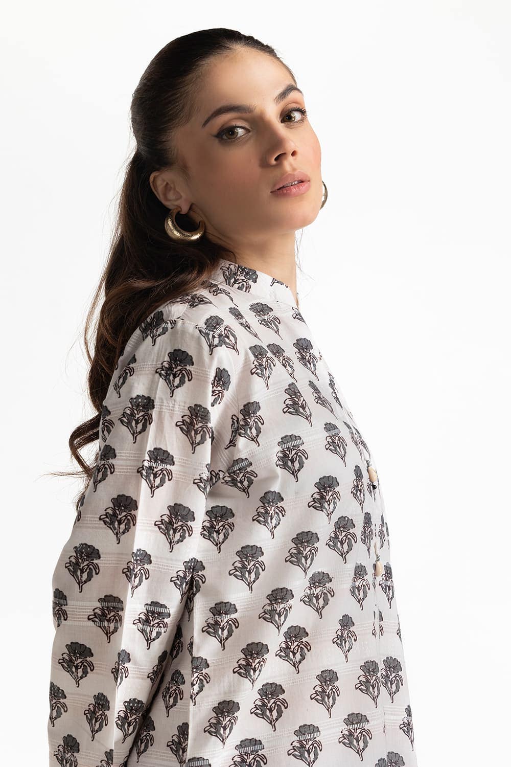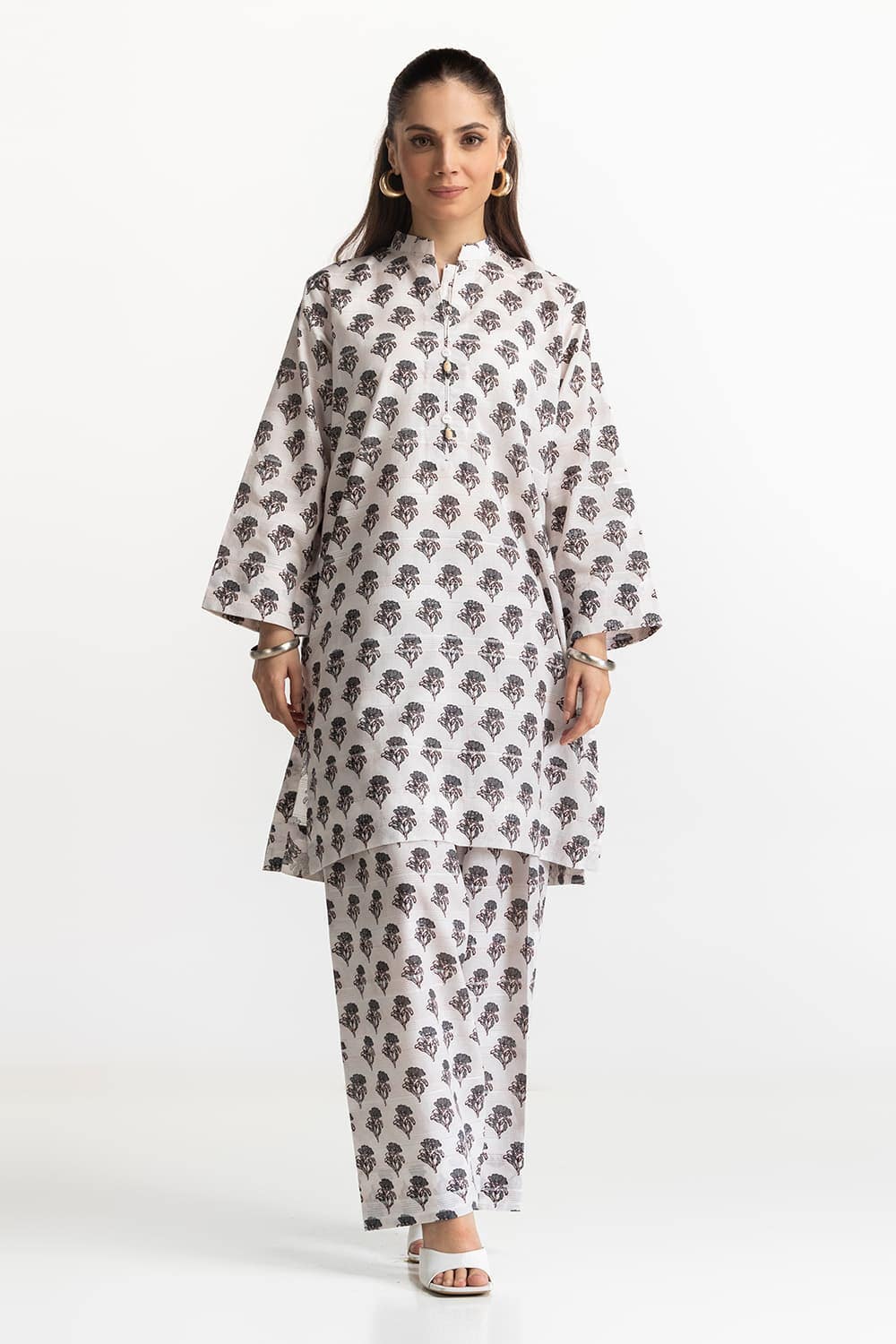 Ready to wear This white kurta set features a striking black tree motif print, offering a classic contrast. The loose silhouette and matching printed pants ensure a comfortable yet fashionable look.
