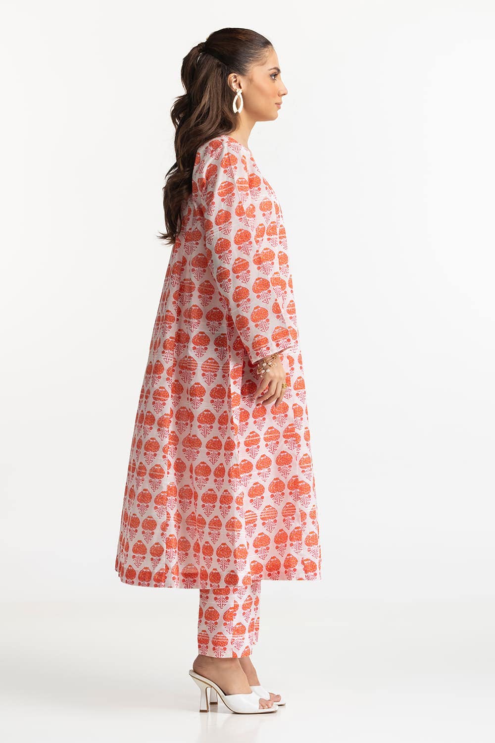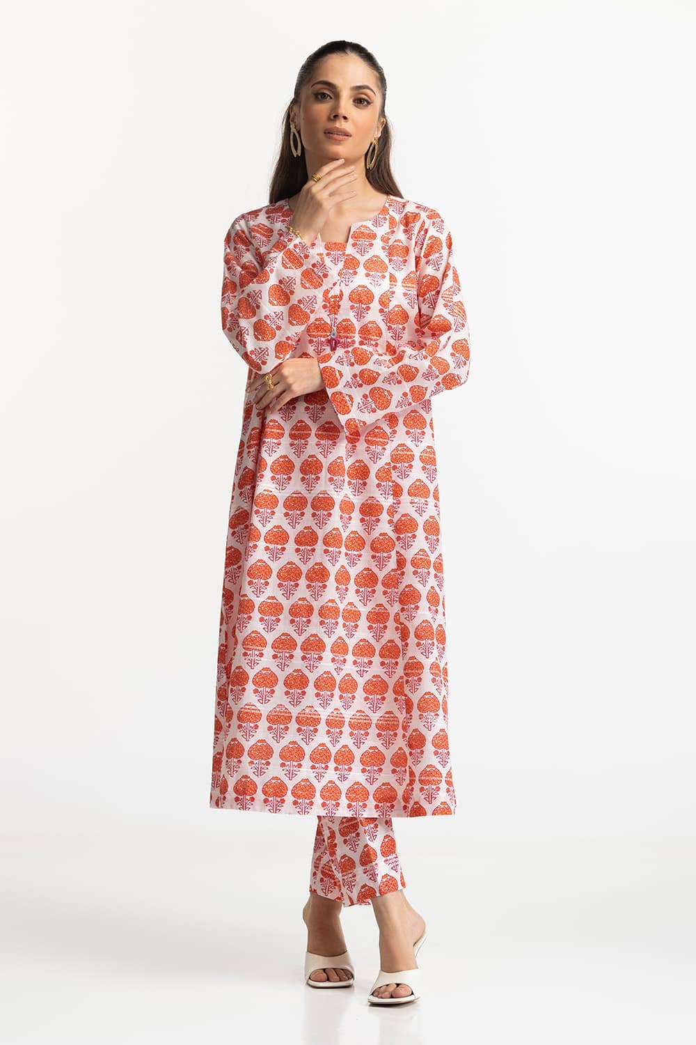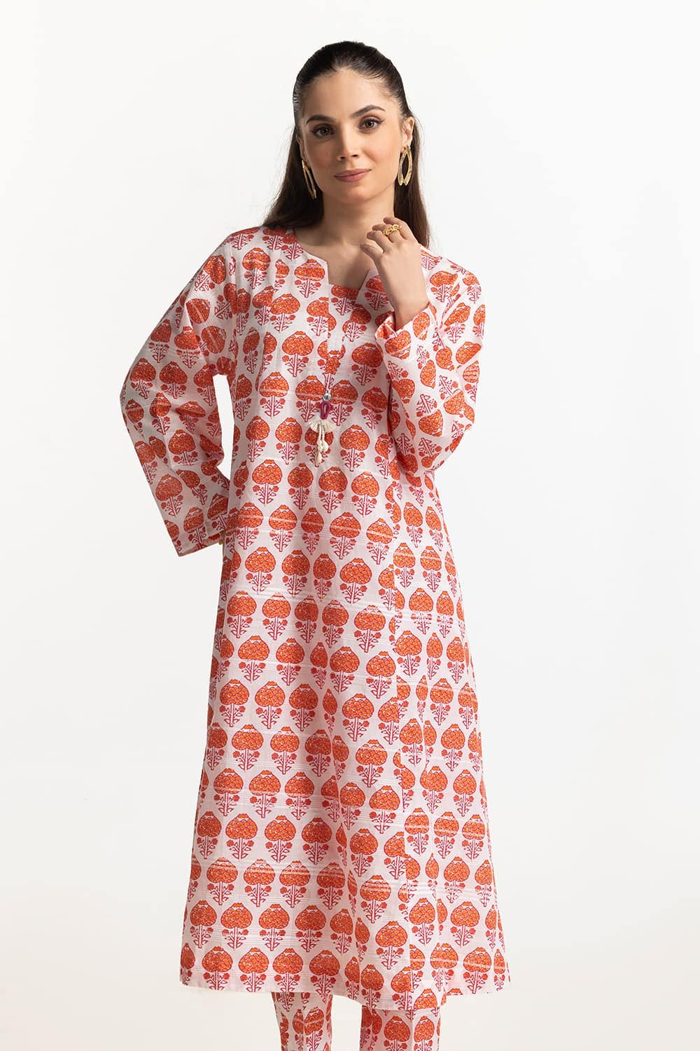 Ready to wear A vibrant off white kurta set with a bold tree motif print. The long kurta and matching slim trousers create a visually striking ensemble, perfect for making a statement.
