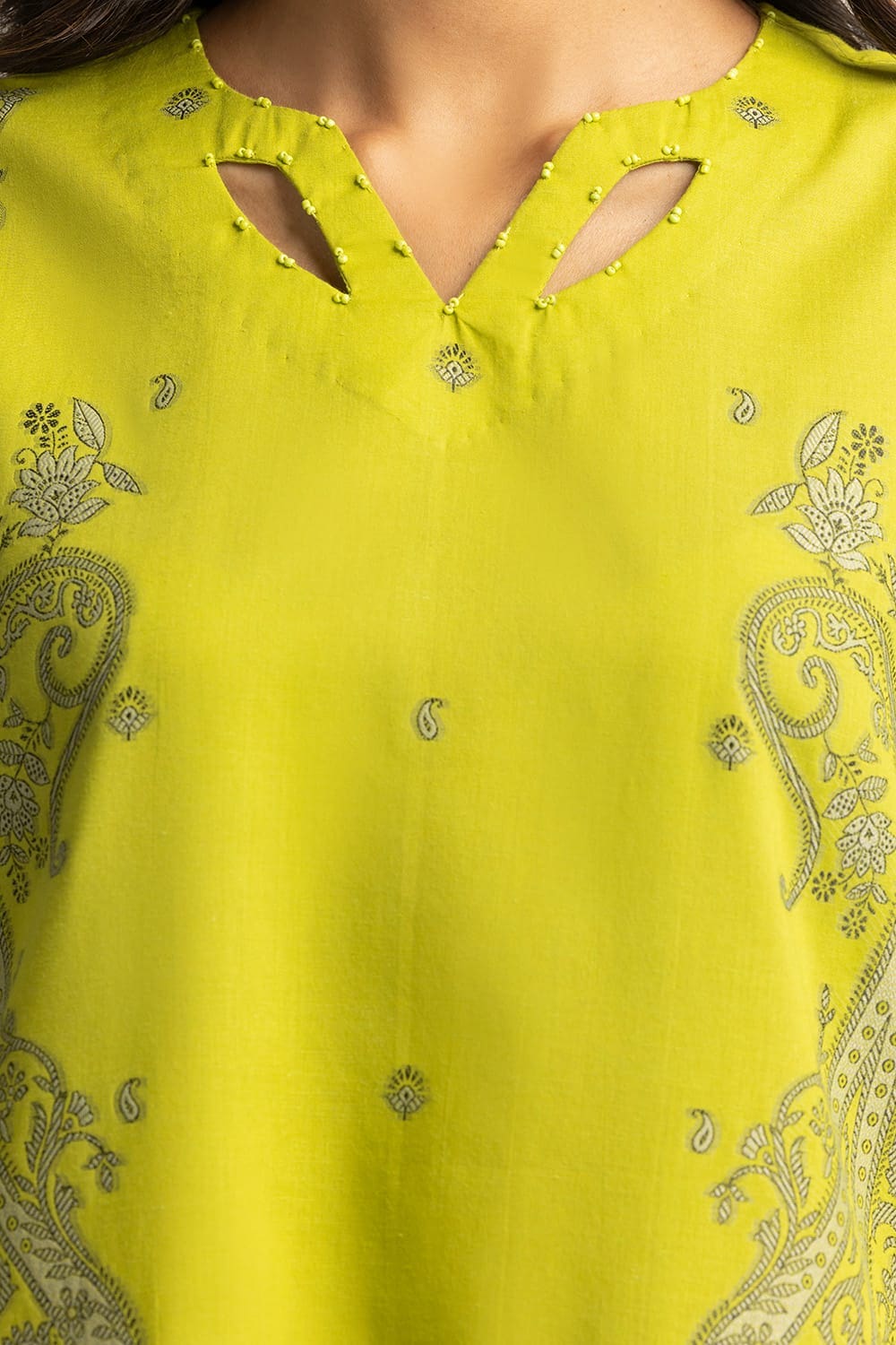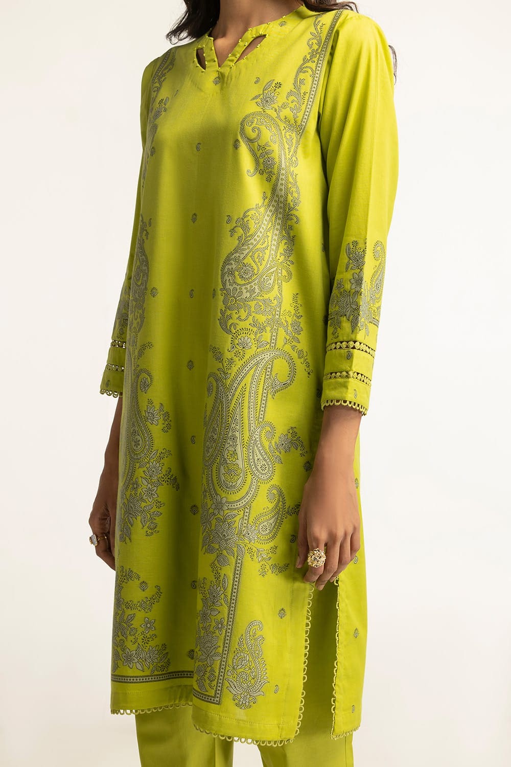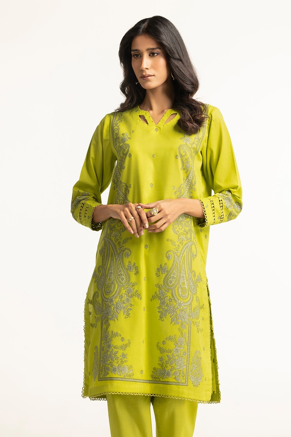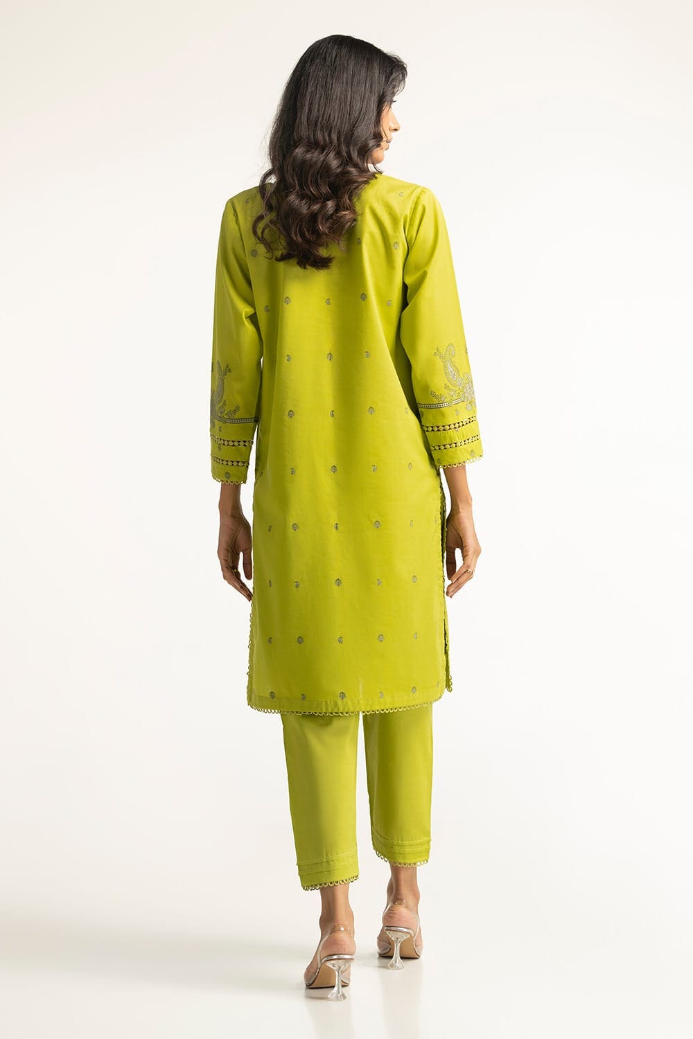 Ready to wear Elevate your style with this striking 2PC suit. The vibrant lime green kurta features intricate silver paisley and floral design adding a touch of elegance. Paired with matching trousers for a cohesive look.
