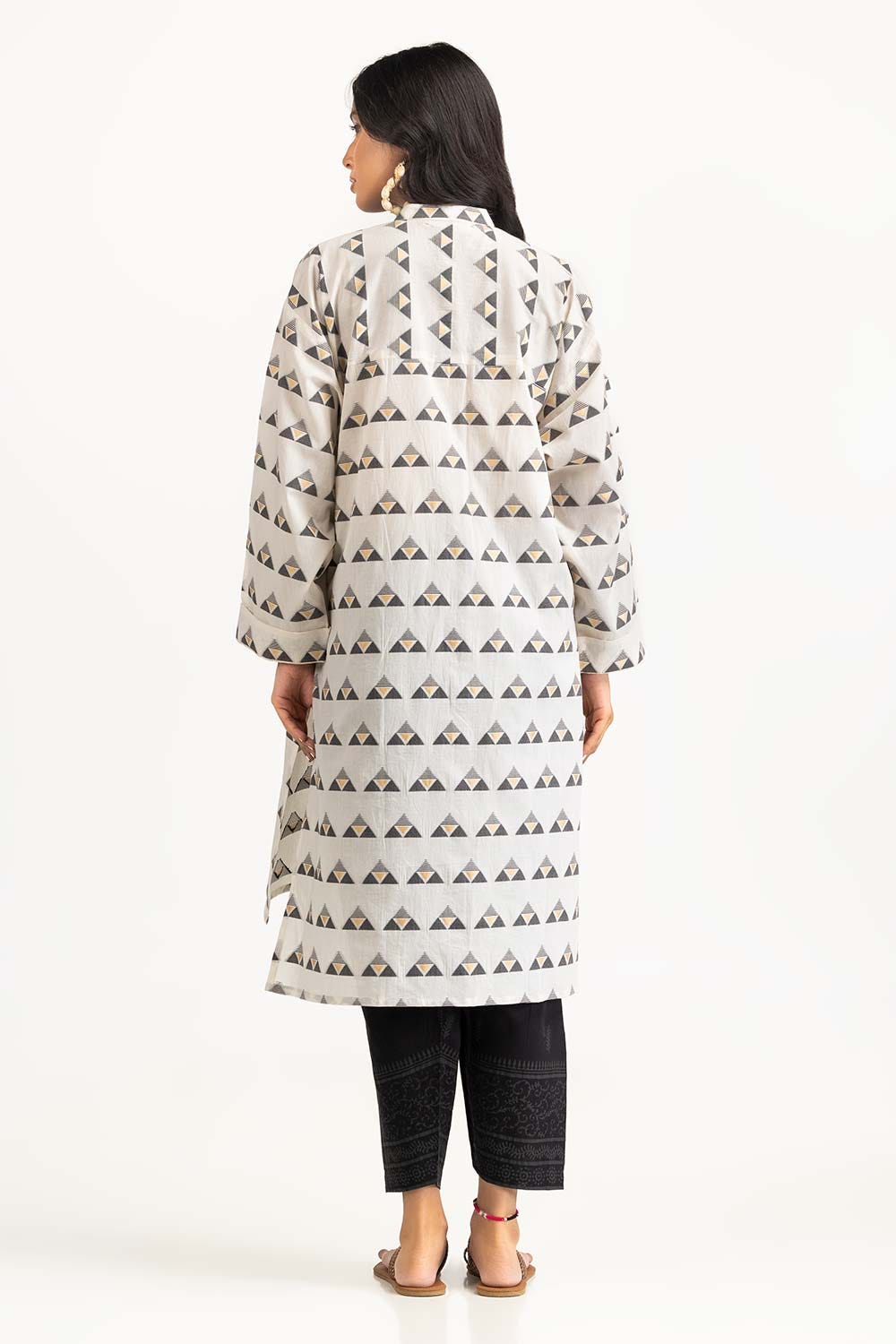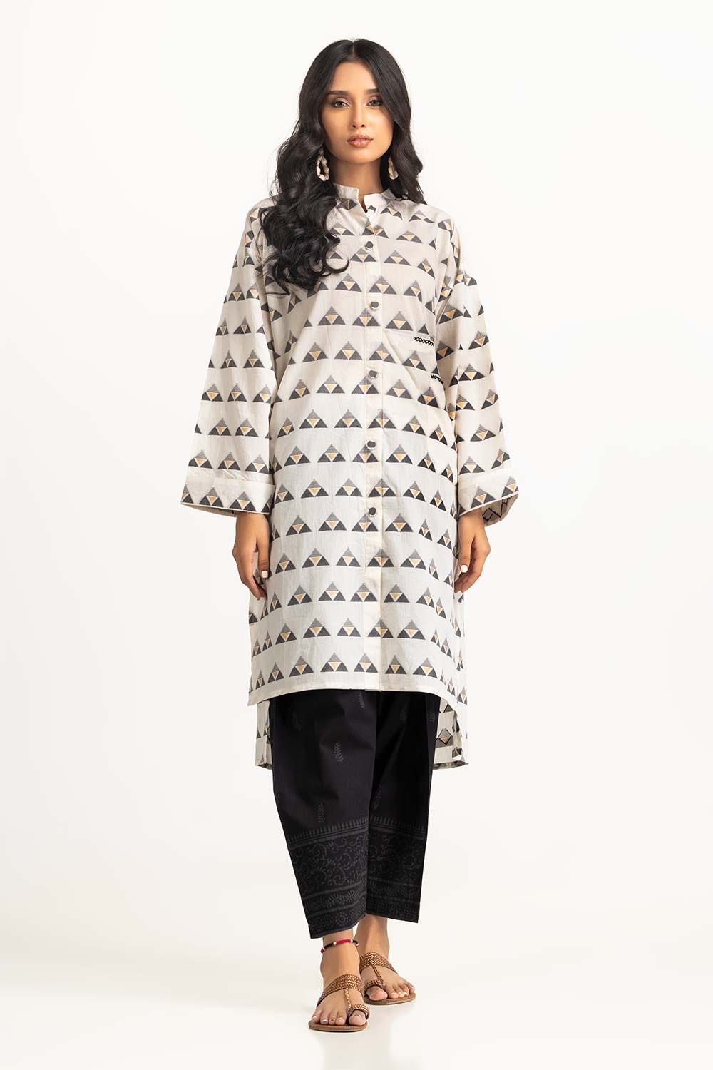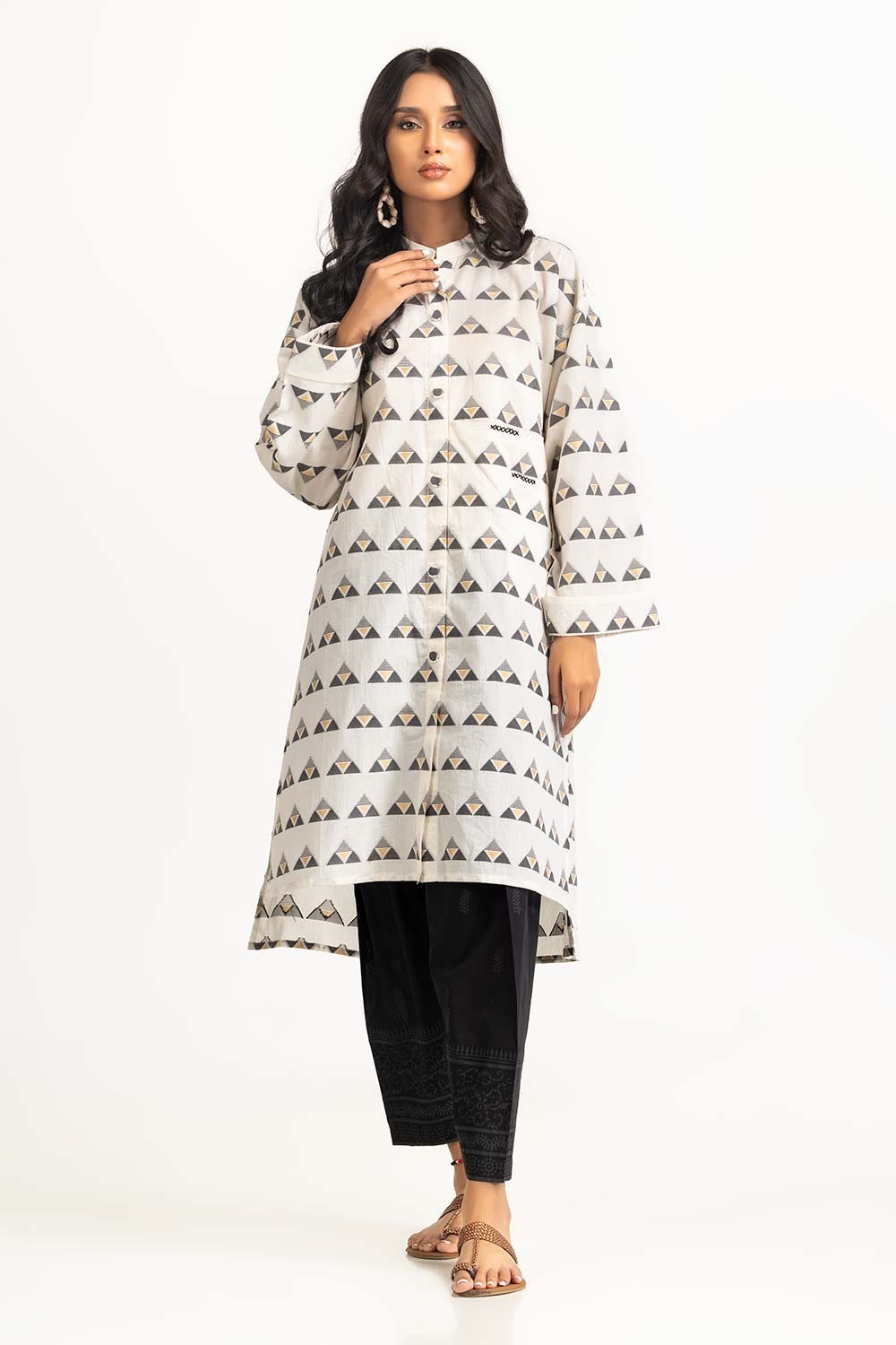 Ready to wear Off-white jacquard shirt featuring a band collar with detailing, straight sleeves and an assymetrical hem."