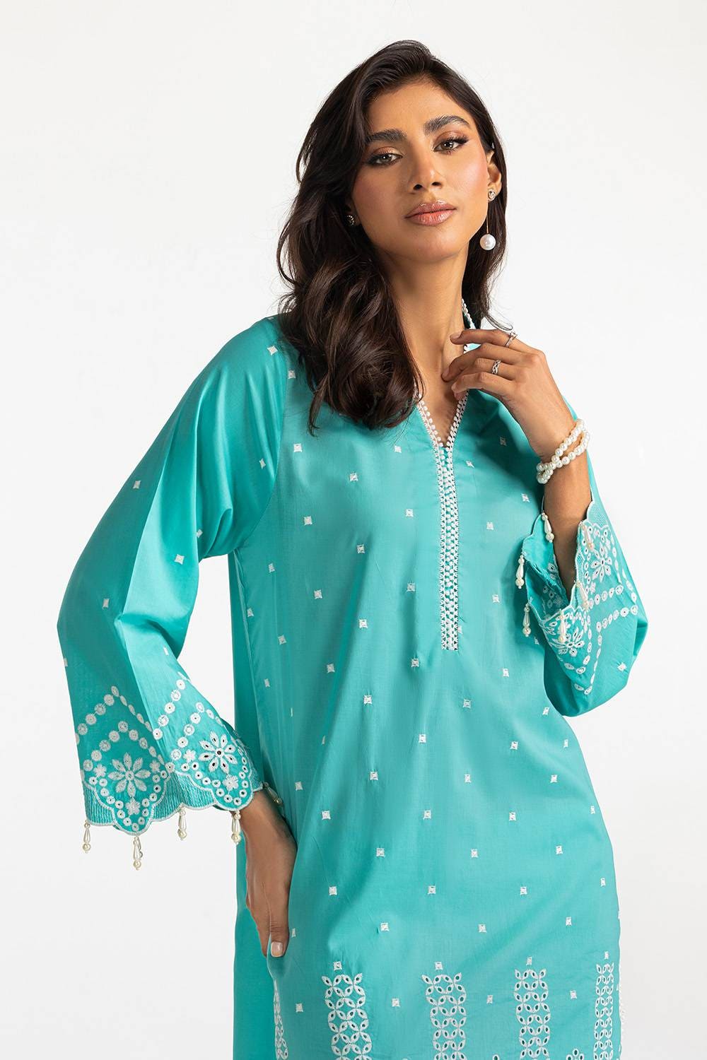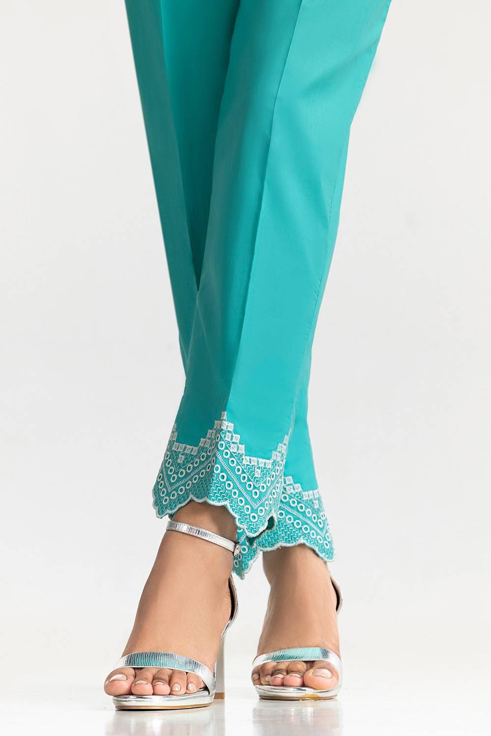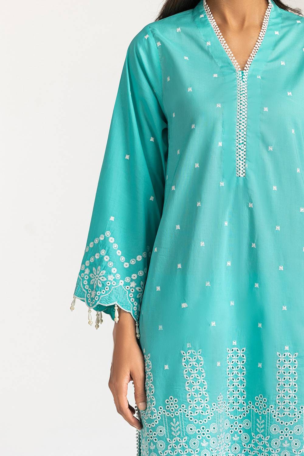 Ready to wear This sea green 2PC suit with white embroidery features V-neckline, and embroidered cuffs on full sleeves. Paired with matching trouser, perfect for summer events.