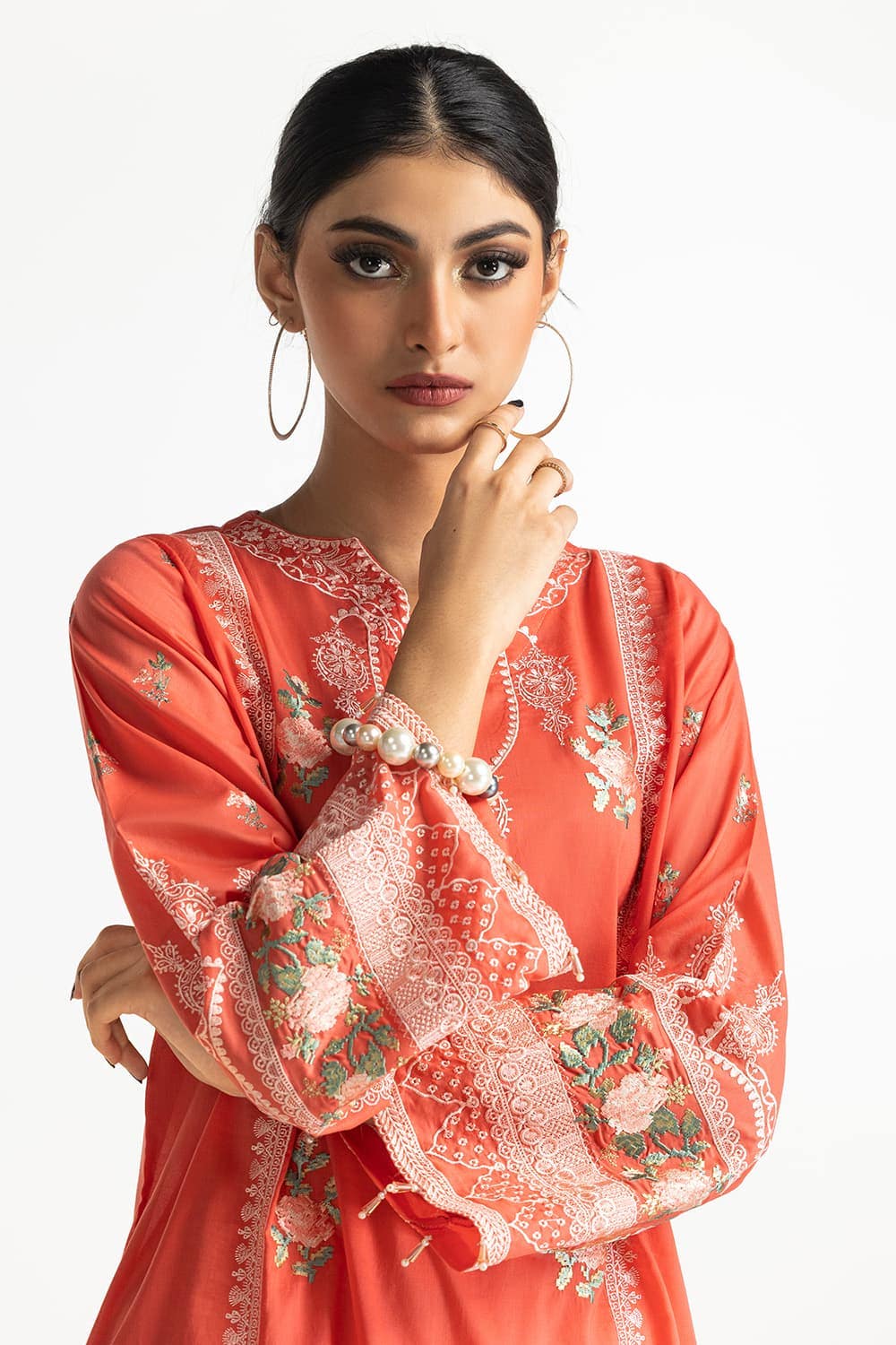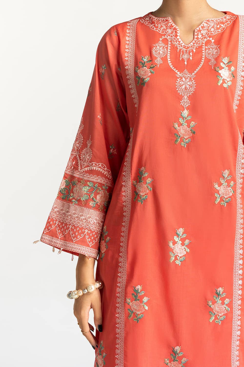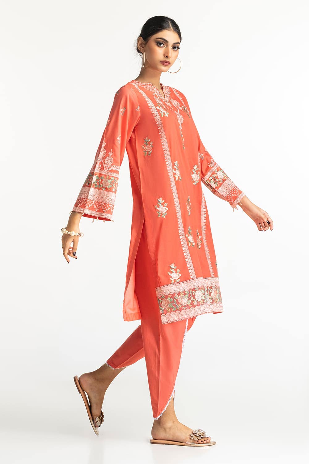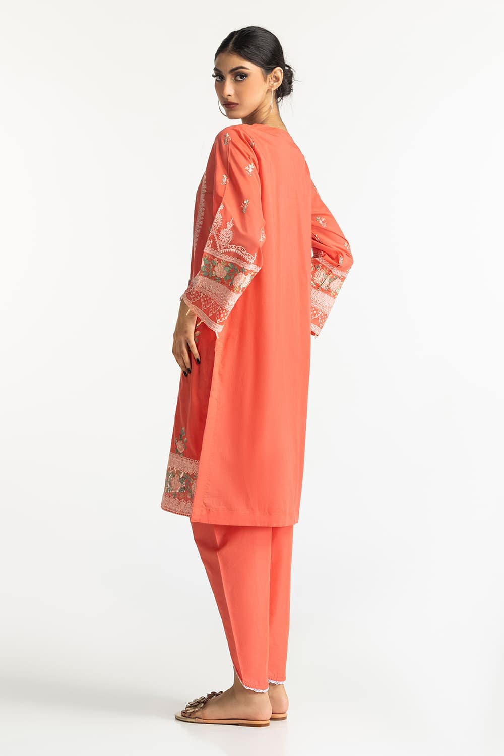 Ready to wear Bright and cheerful, this 2PC orange  kurta is decorated with intricate embroidery and motifs. The sleeves are embellished with detailed patterns, and the hem features a beautifully embroidered border. The round neckline with subtle accents enhances the overall charm, with a tulip shalwar completing the look.