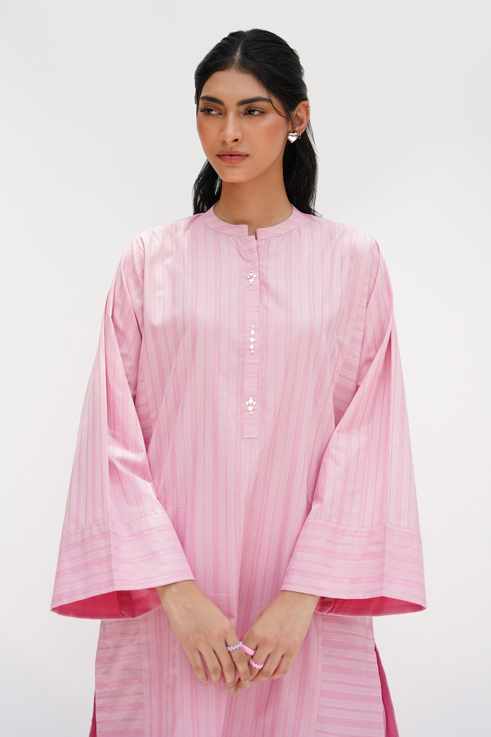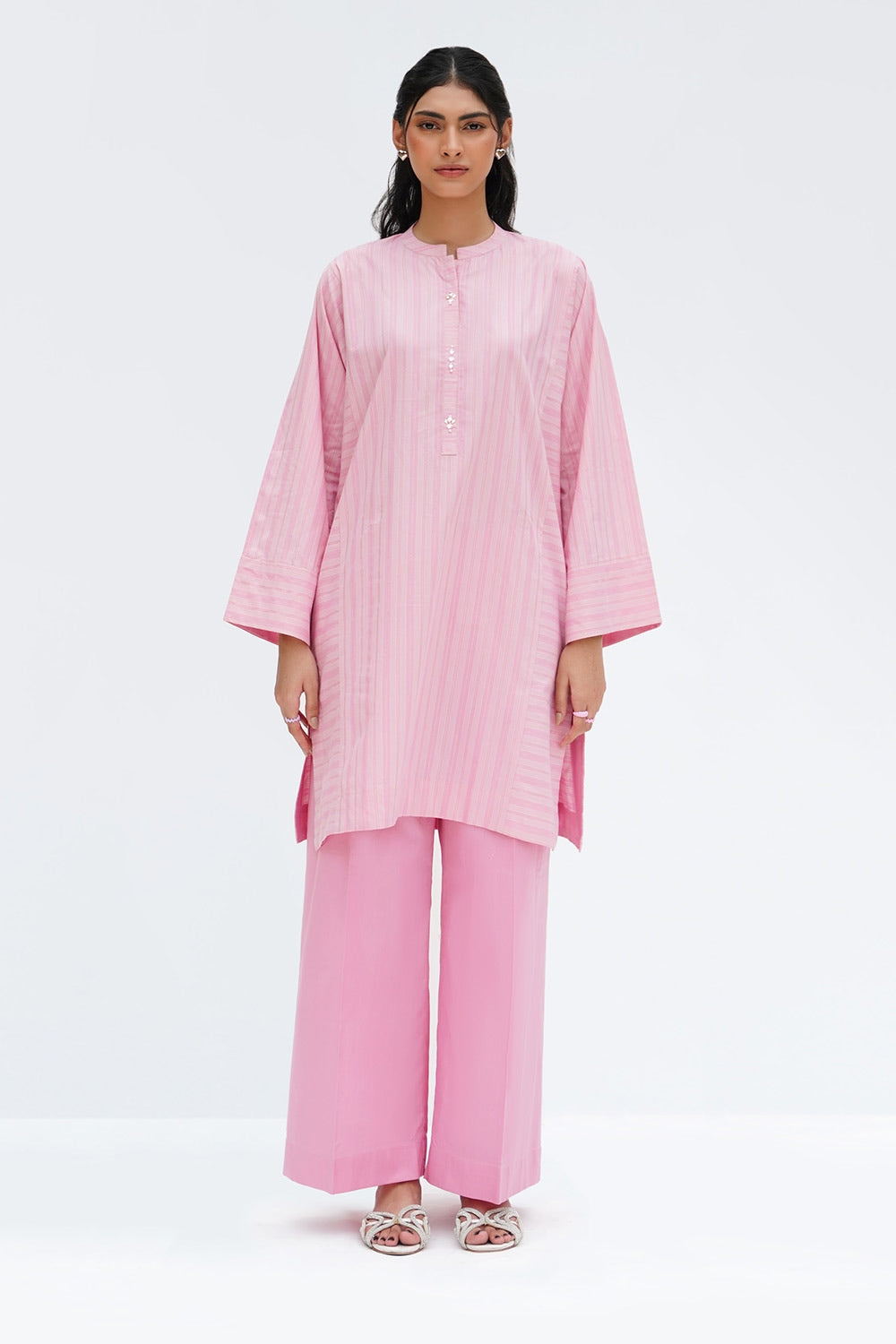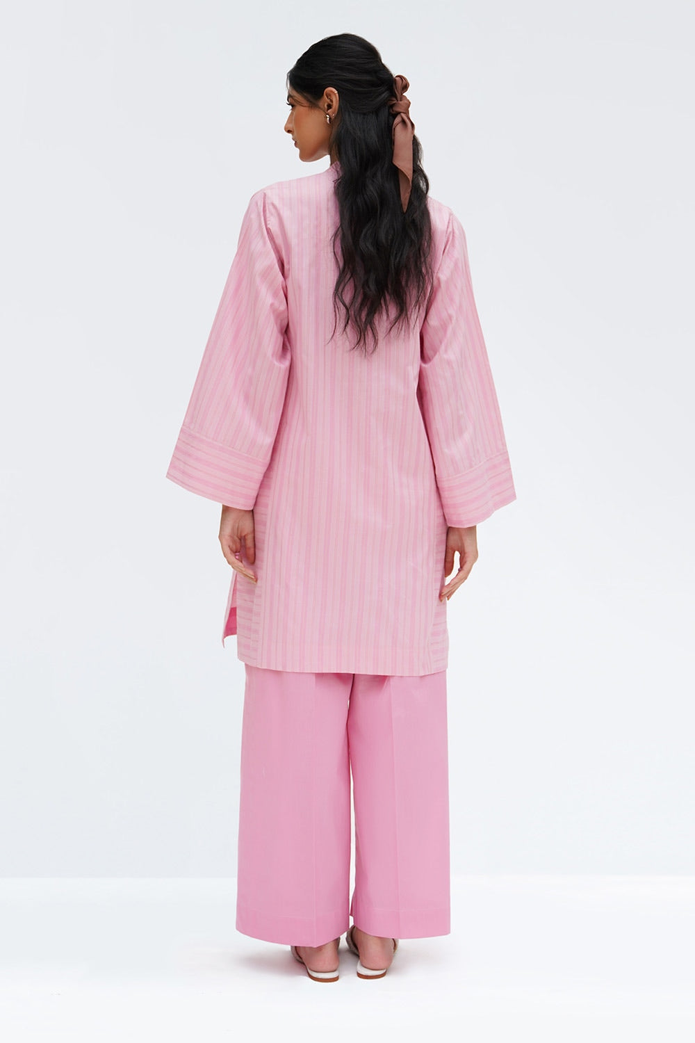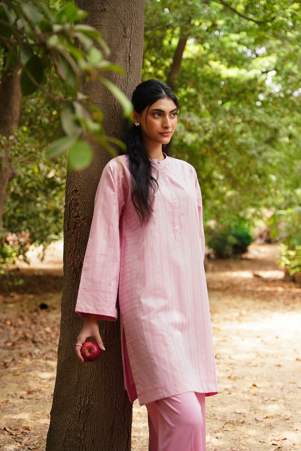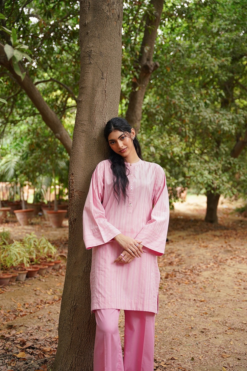 Ready to wear Embrace soft hues with this pink striped kurta set. The round neckline and wide-leg trousers offer a relaxed fit, while the lightweight fabric ensures comfort. Ideal for casual wear and effortless style.