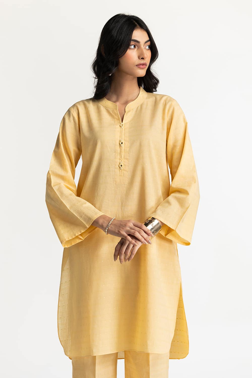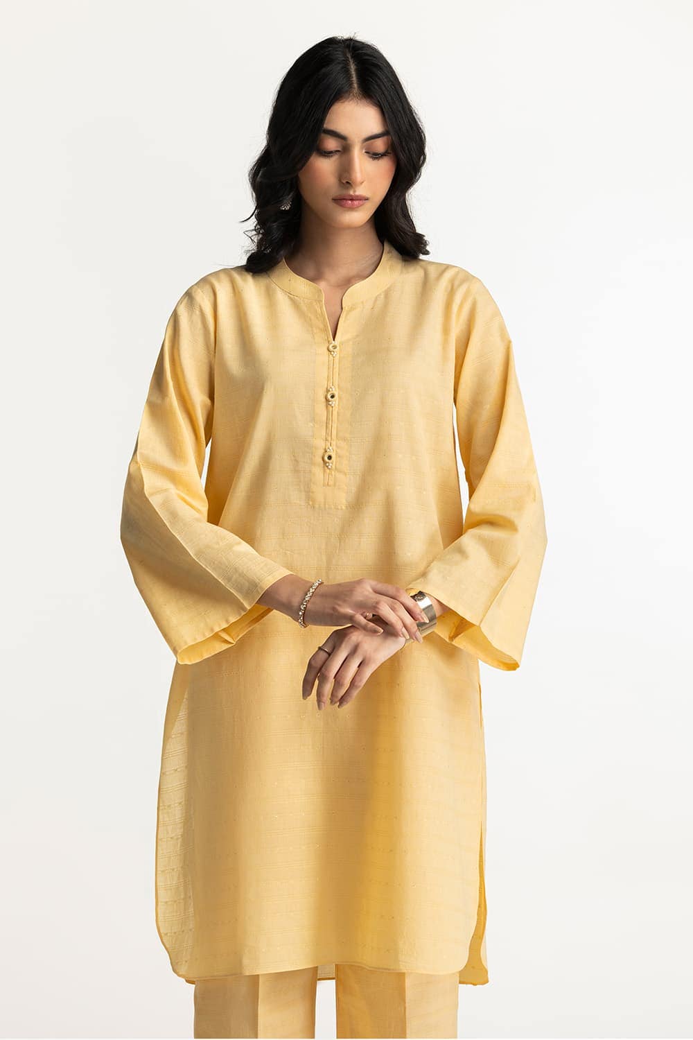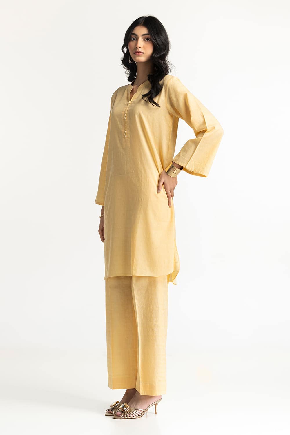 Ready to wear Brighten your day with this 2PC yellow solid suit, featuring a round neckline and relaxed sleeves. The straight-cut kurta pairs with wide-leg trousers, ensuring both style and comfort.