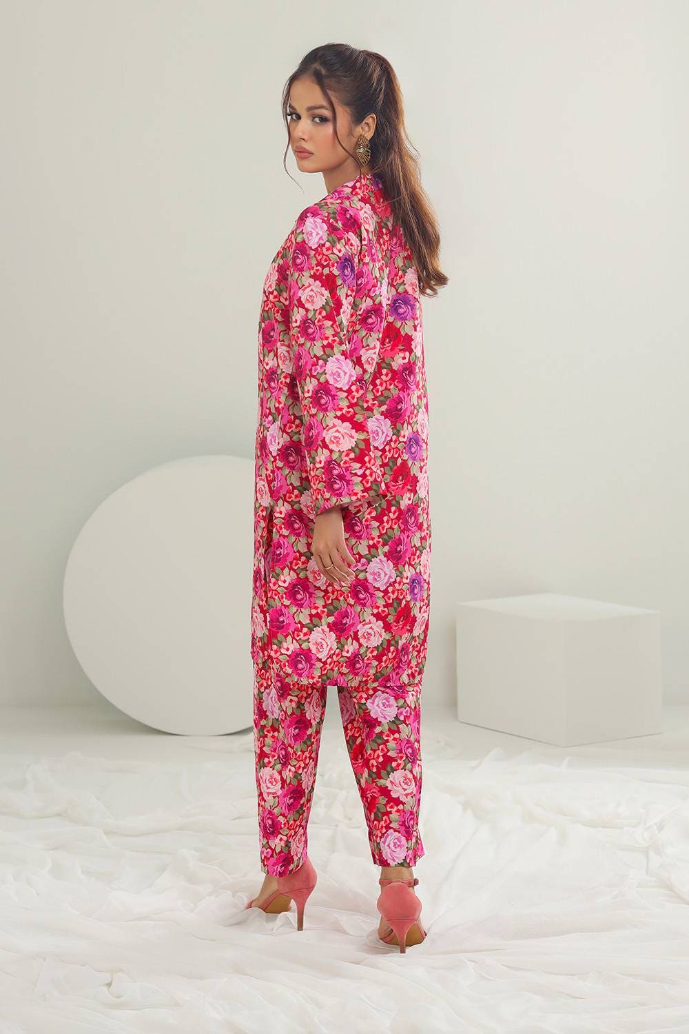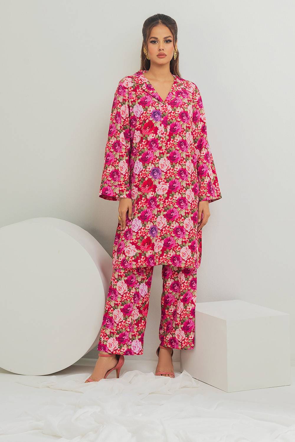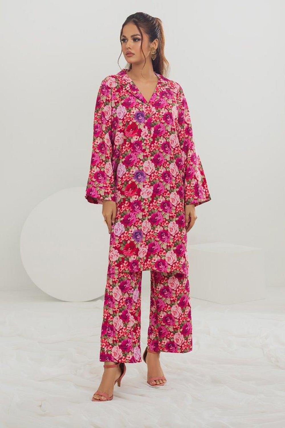 Ready to wear Step into style with this 2PC floral co-ord set, highlighted with an intricate floral pattern. The safari style collar and broad sleeves offer a modern touch, paired with loose-fit trousers for effortless fashion and comfort.