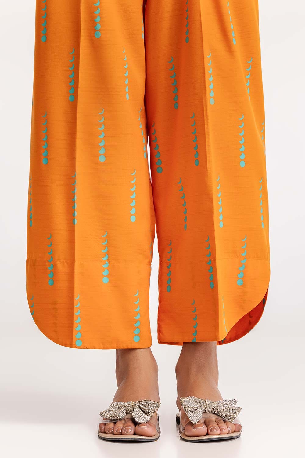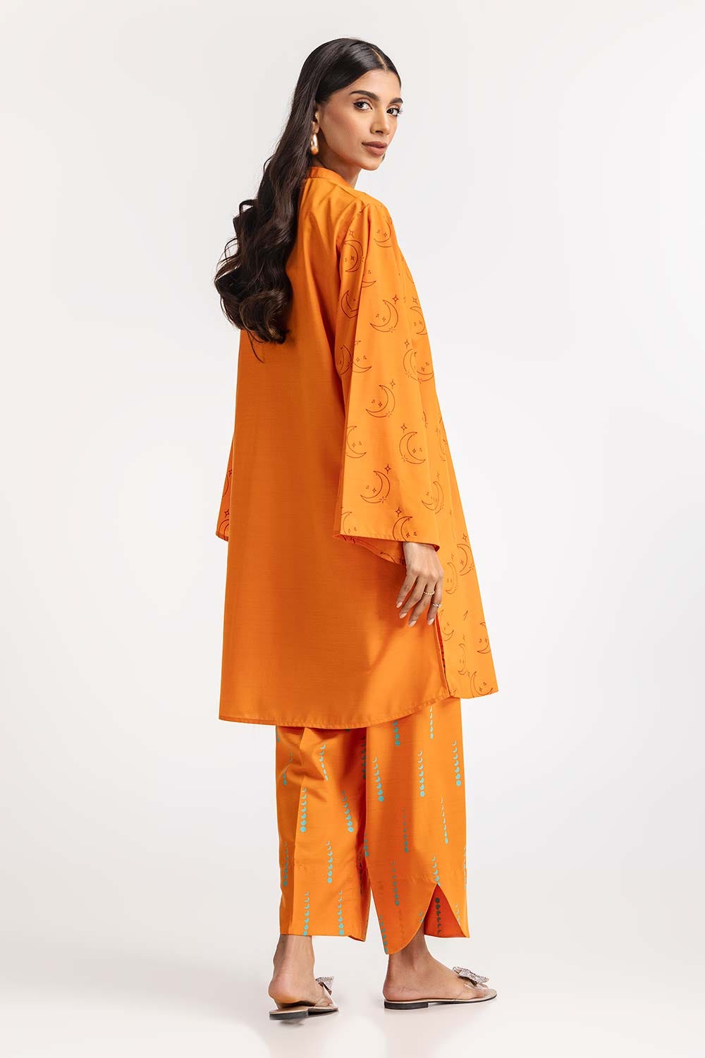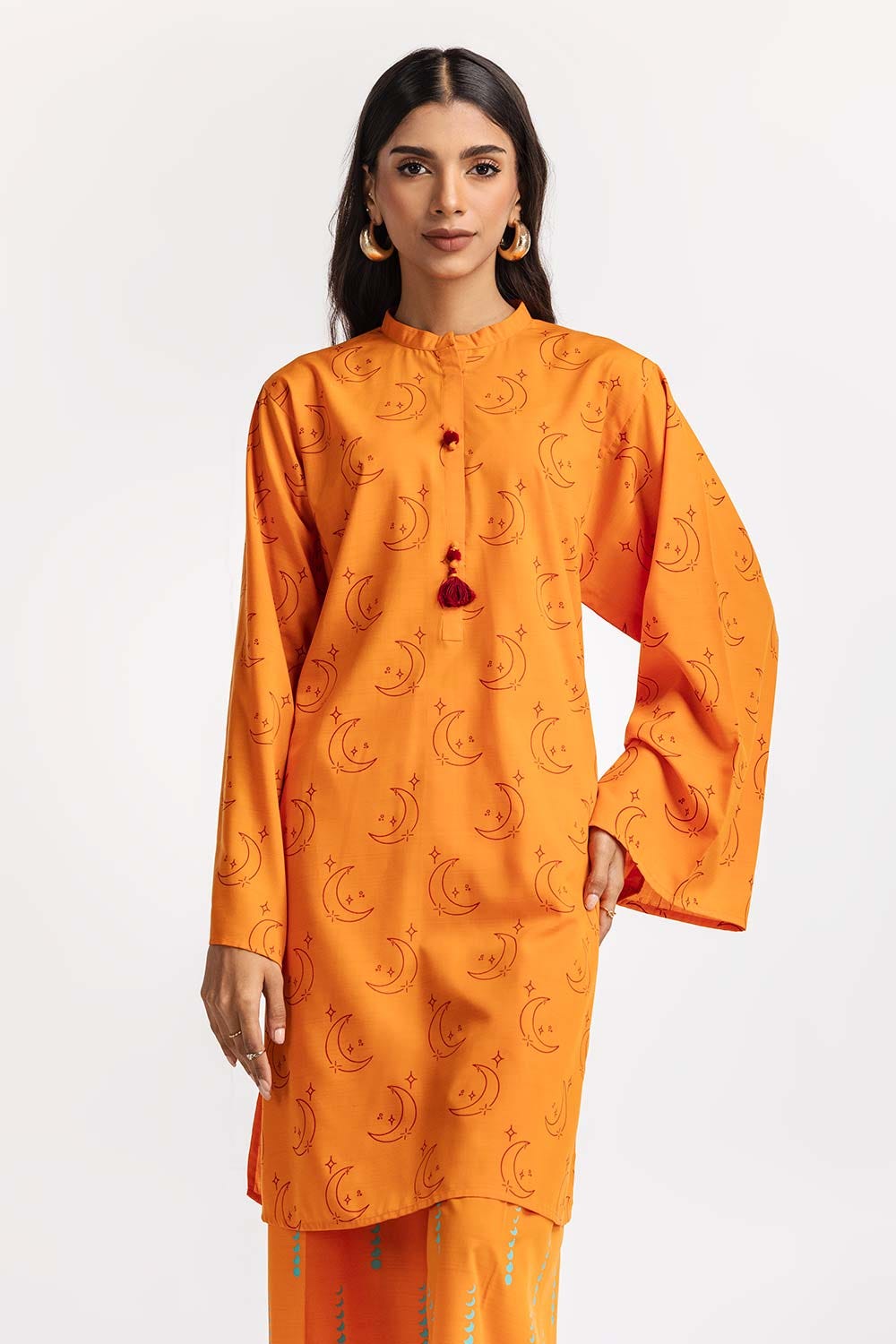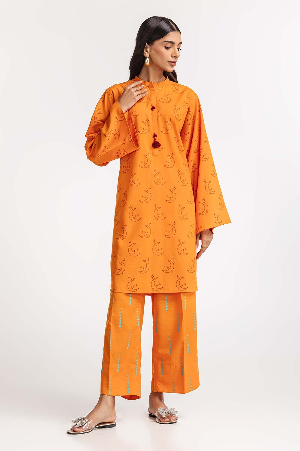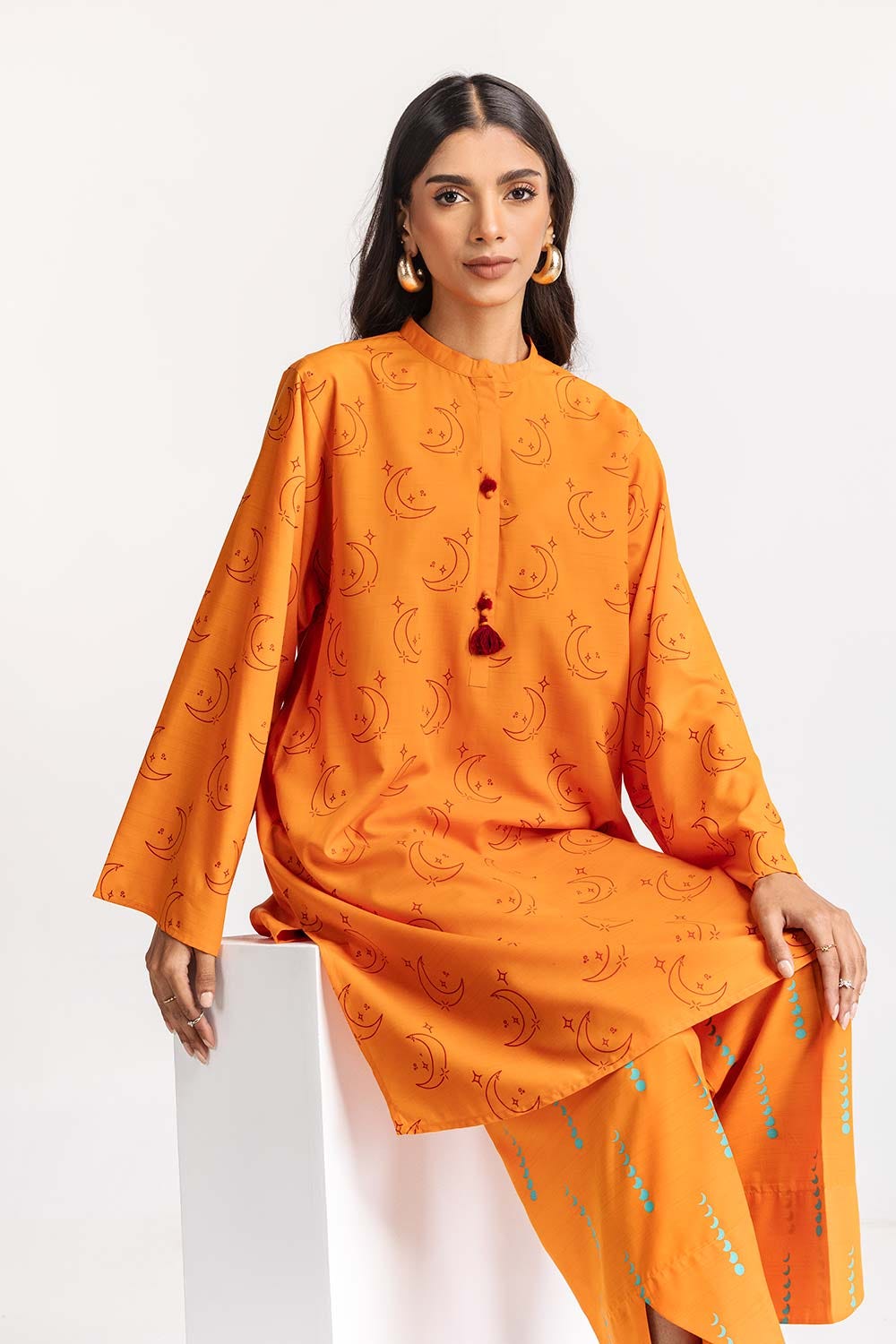 Ready to wear Discover the elegance of this 2PC vibrant orange kurta set. It features a high neckline with button details and long sleeves. The coordinating pants complete the look with matching patterns.