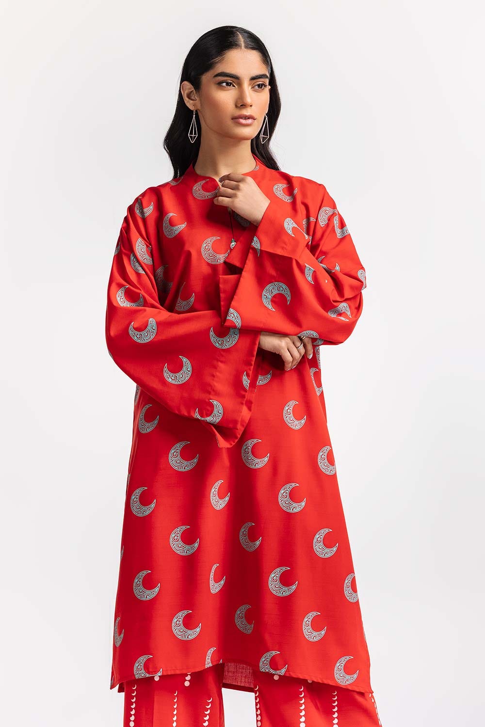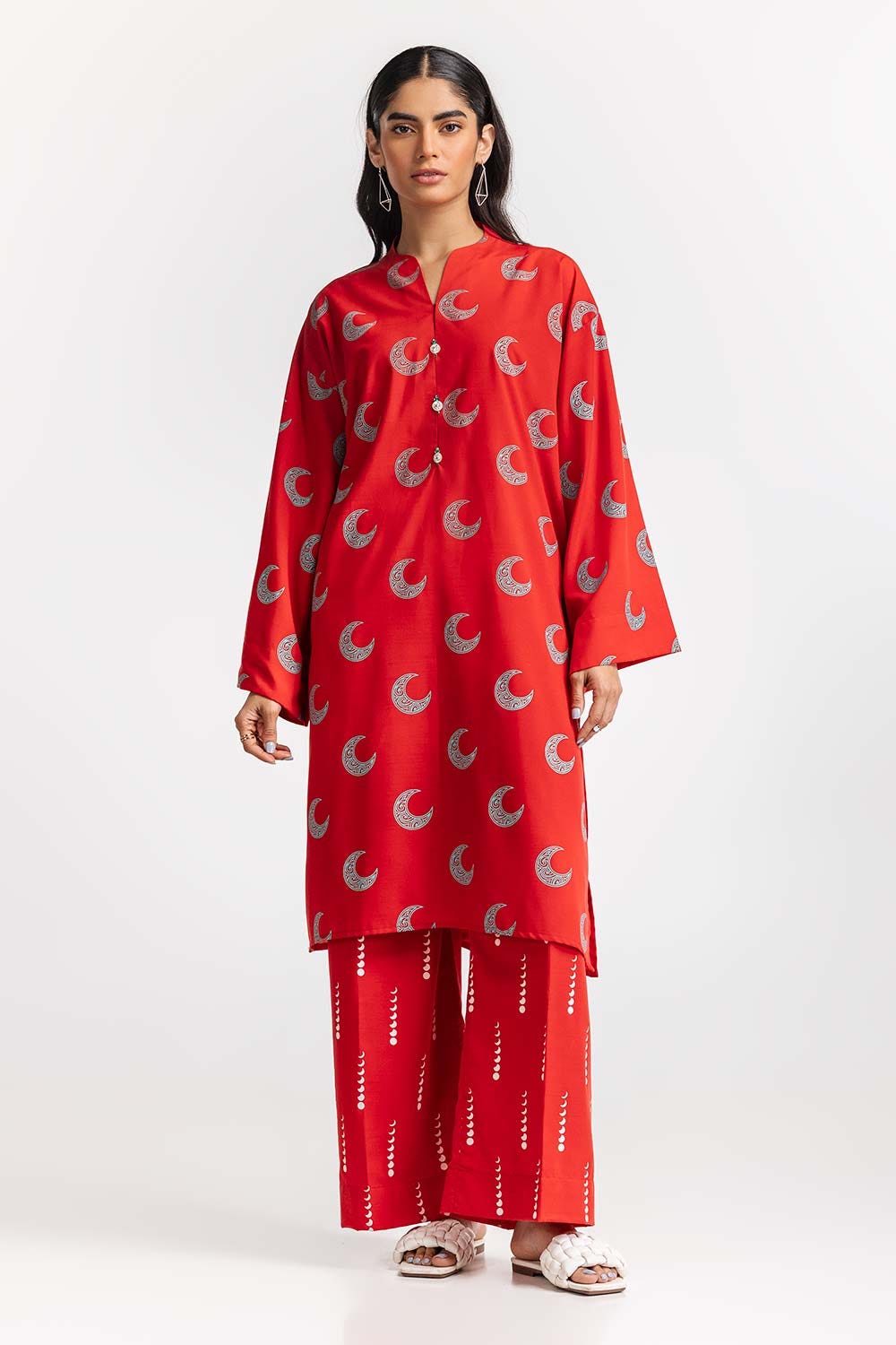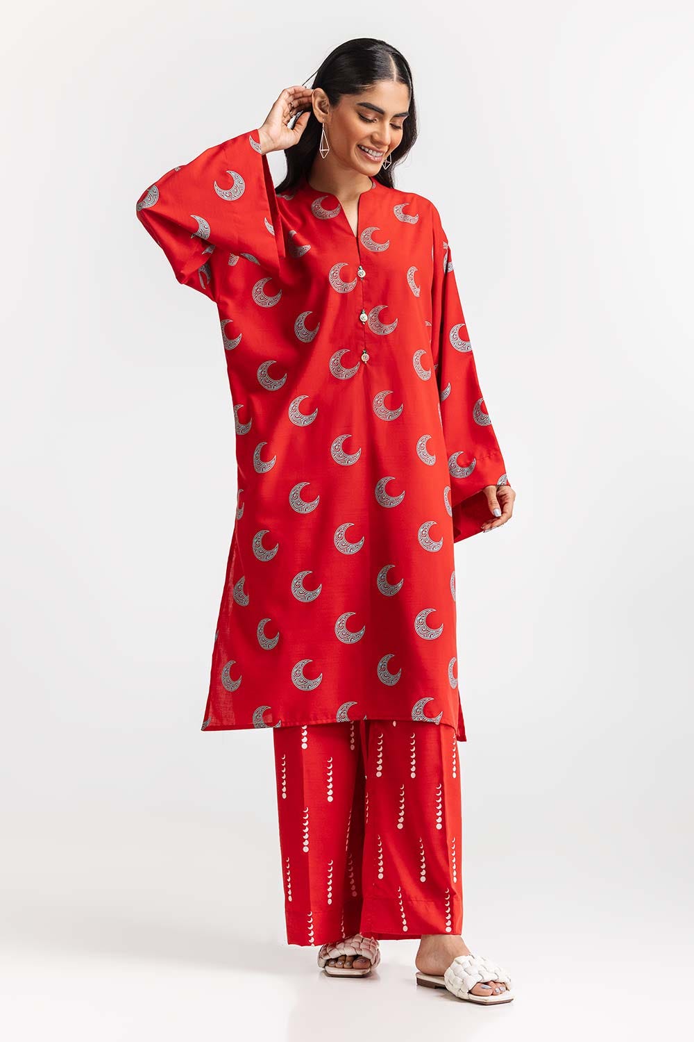 Ready to wear Stand out in this 2PC striking red kurta set. The  kurta is decorated with moon motifs and features a V-neckline with full sleeves. The matching pants complement the kurta with a similar pattern.