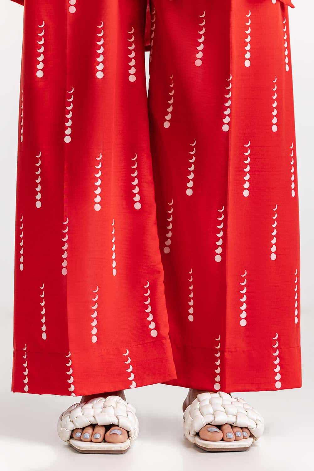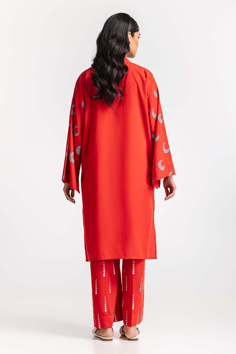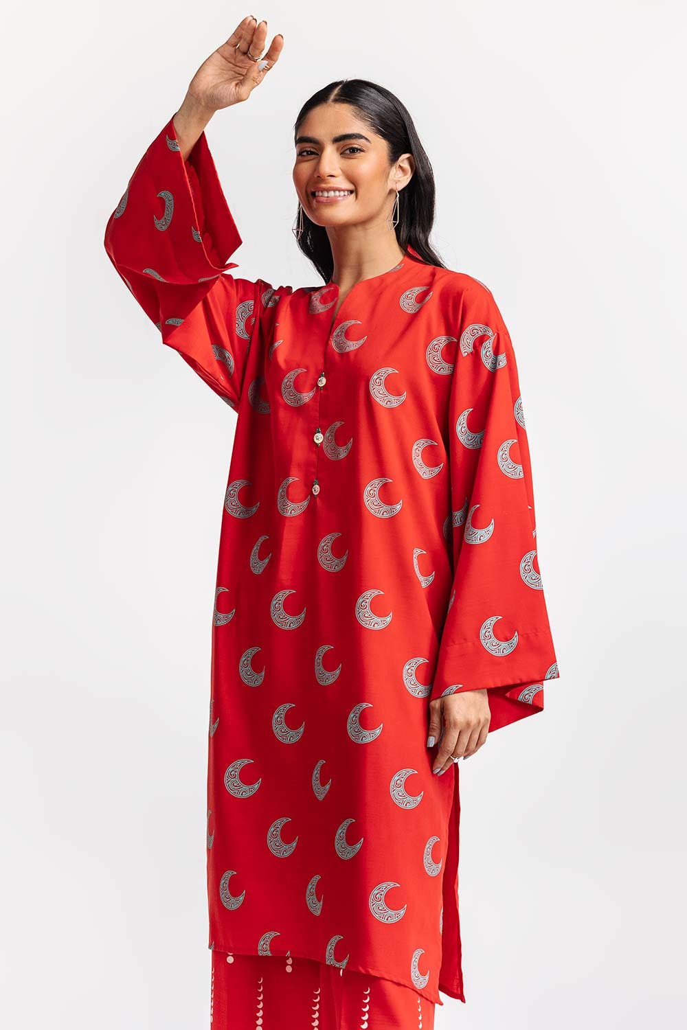 Ready to wear Stand out in this 2PC striking red kurta set. The  kurta is decorated with moon motifs and features a V-neckline with full sleeves. The matching pants complement the kurta with a similar pattern.