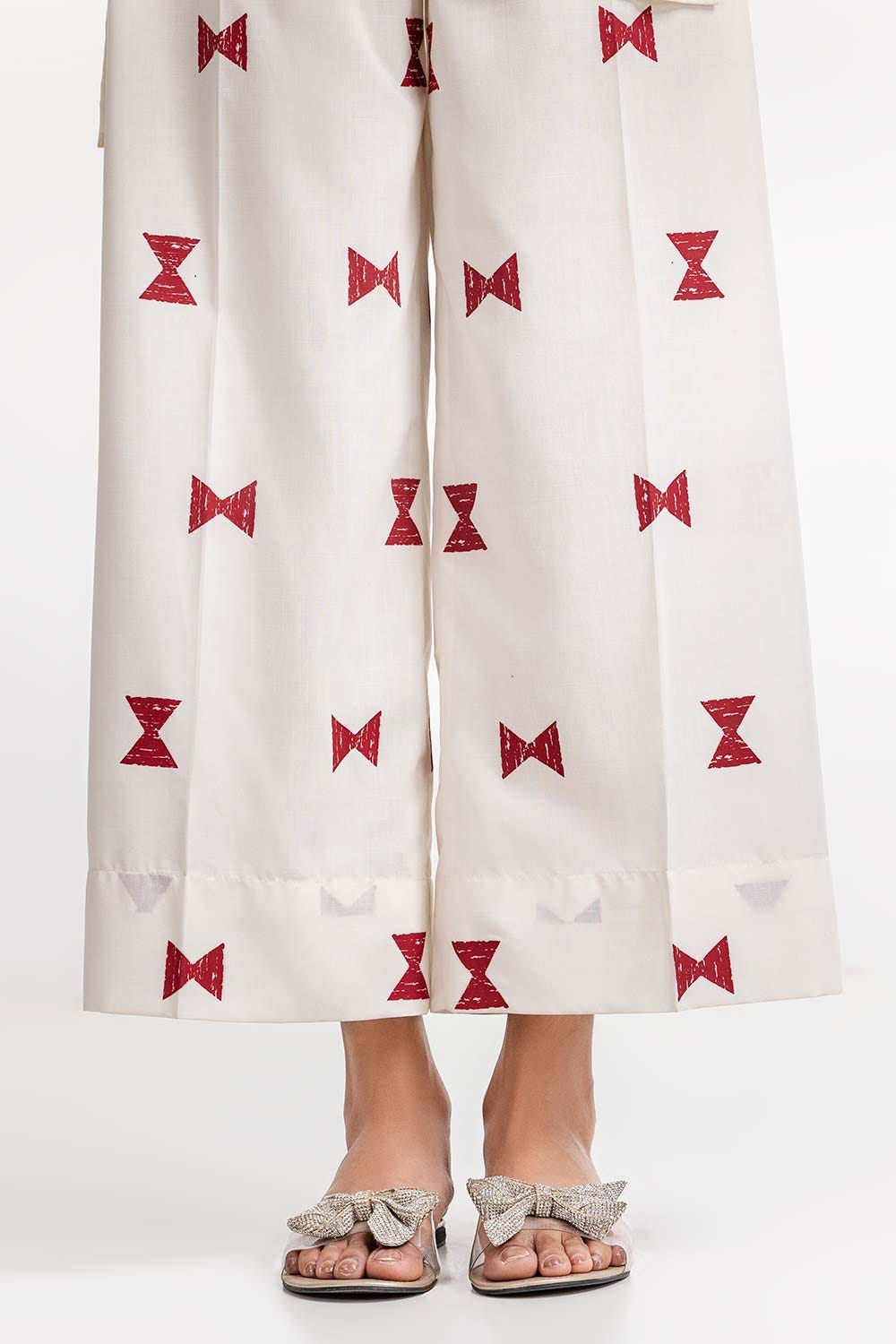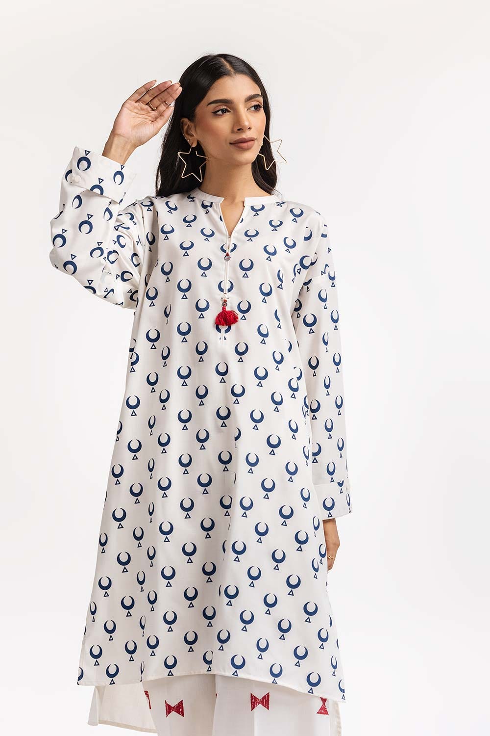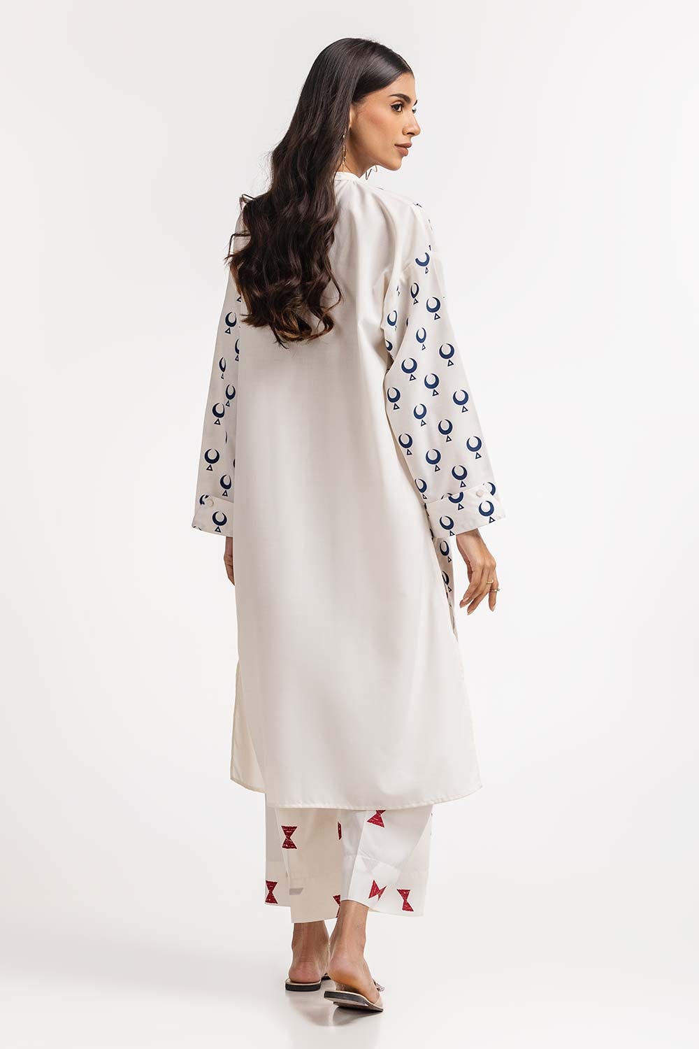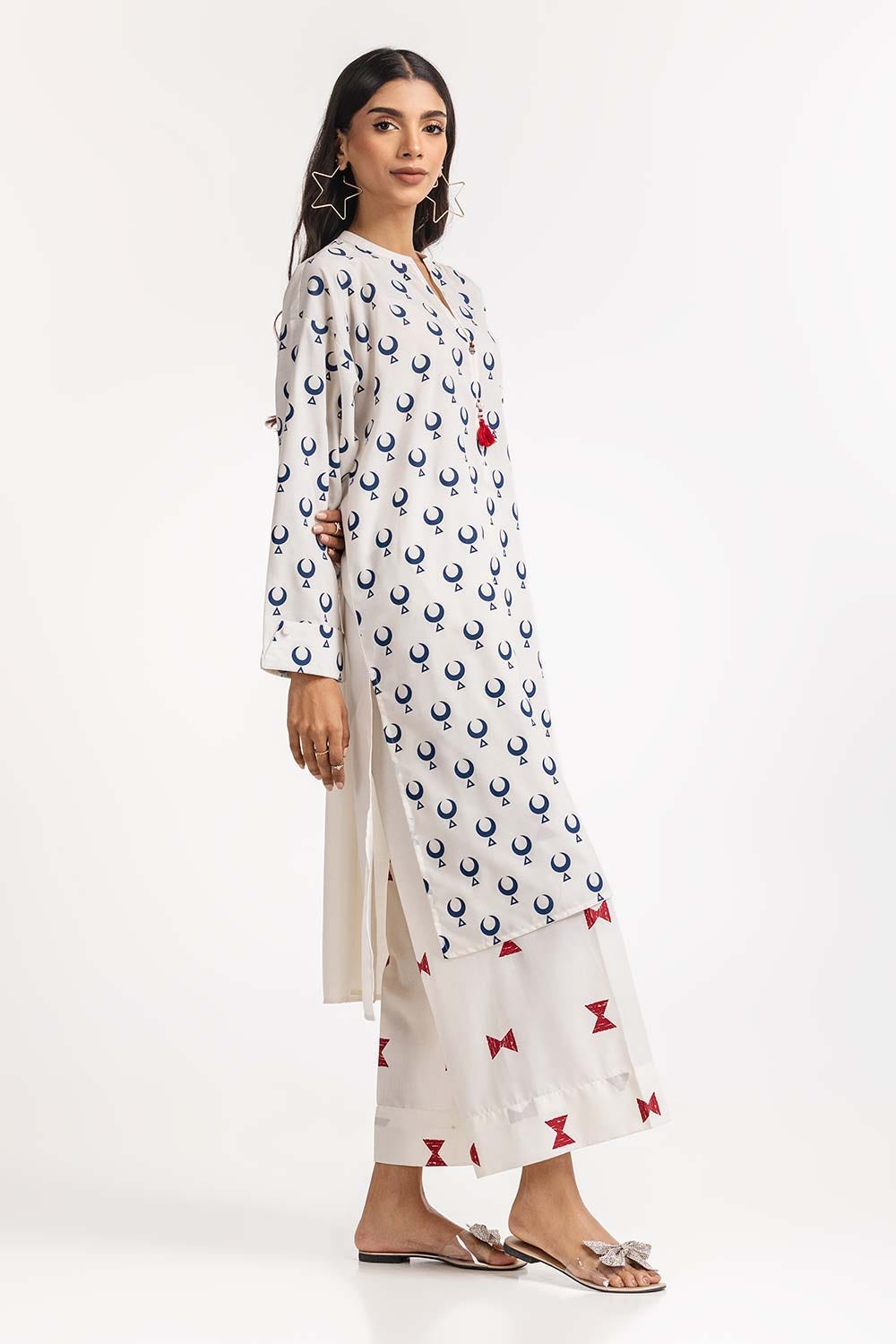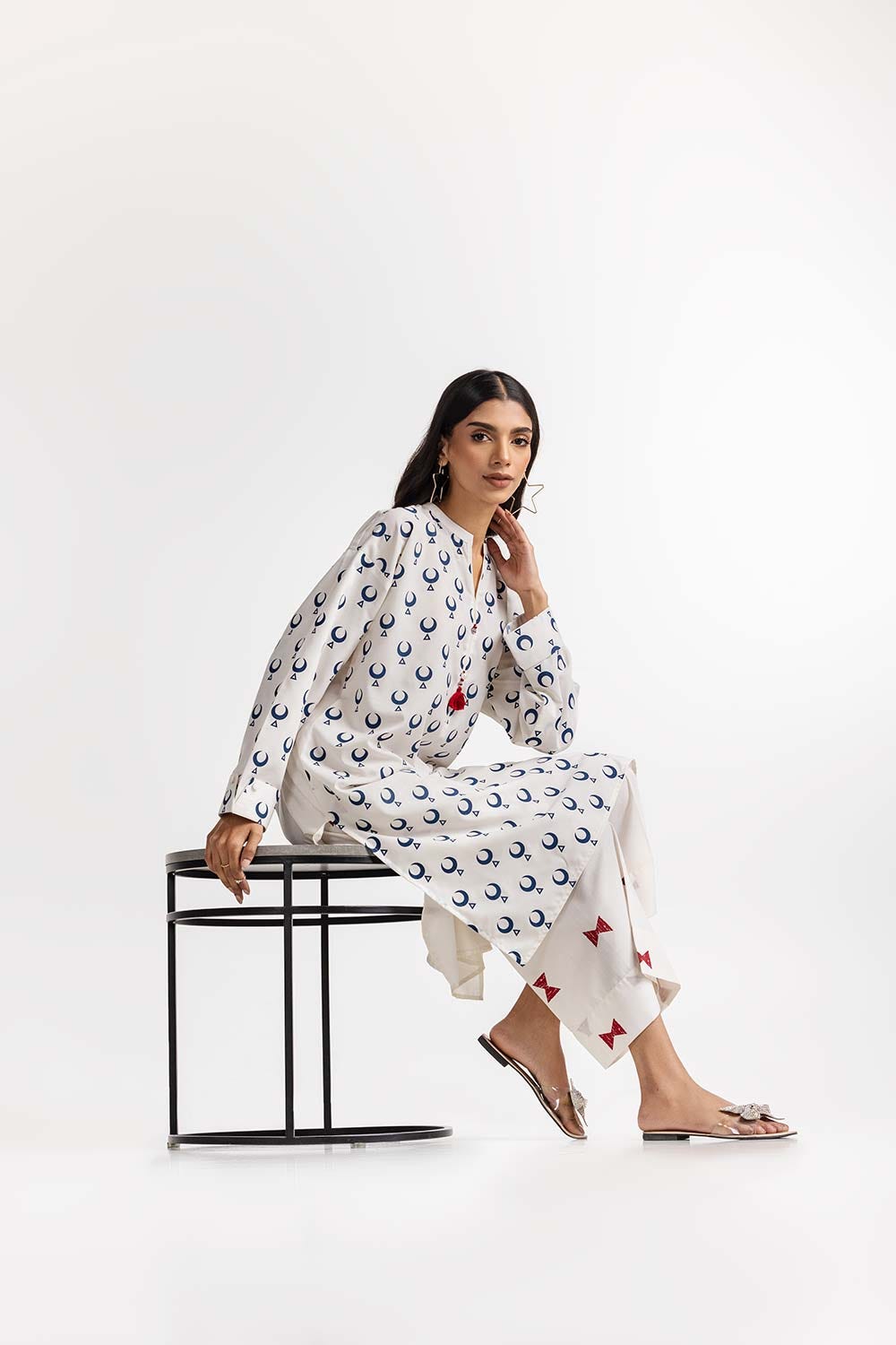 Ready to wear Opt for a unique style with our 2PC off white kurta set. Featuring blue abstract prints, this white kurta comes with a round neckline and full sleeves. Paired with pants showcasing red designs for a unique look.