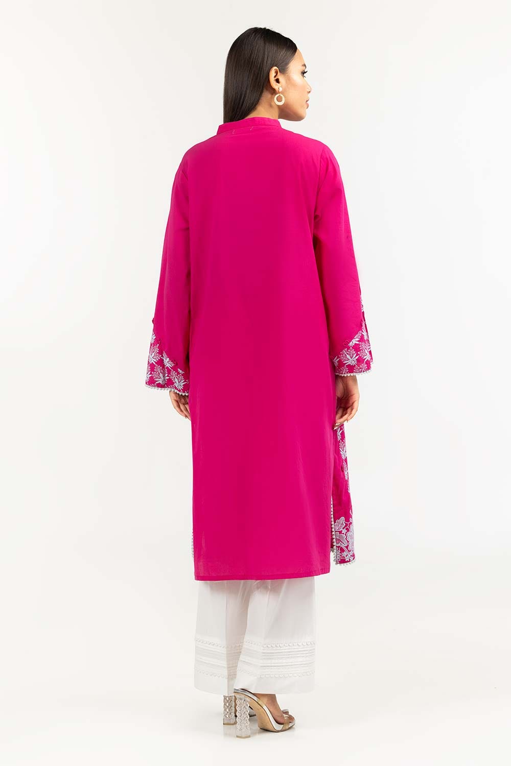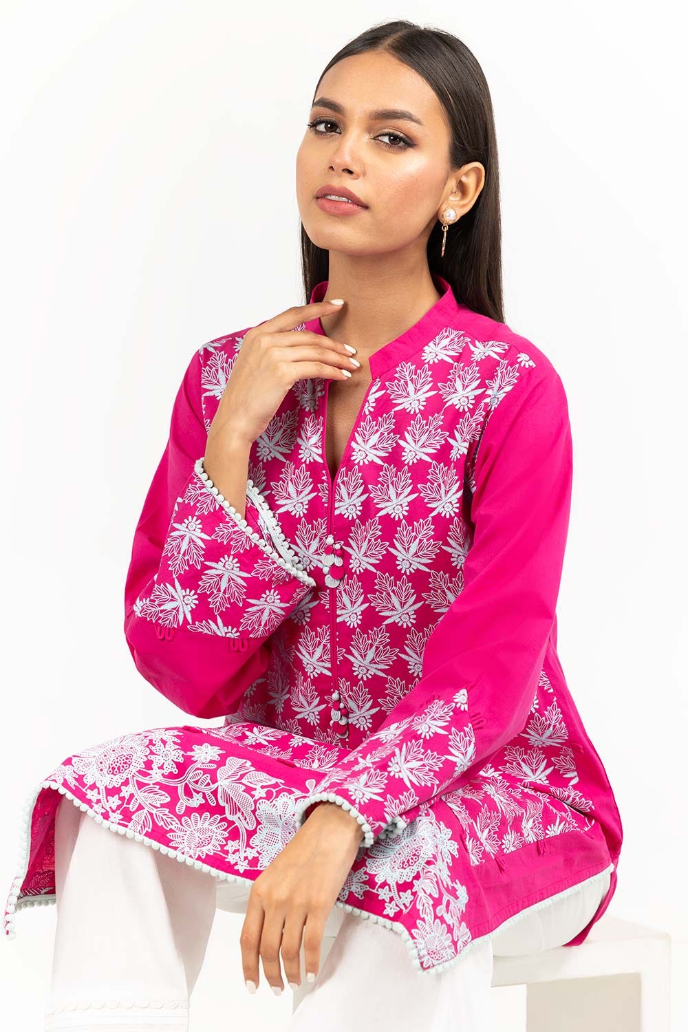 Pink cambric cotton shirt with schiffli-inspired screen printed front with lace embellishment on the hemline, band collar with piping decorated placket topped with beads and buttons, dyed back, and screen printed sleeves with hand work and lace embellishment.