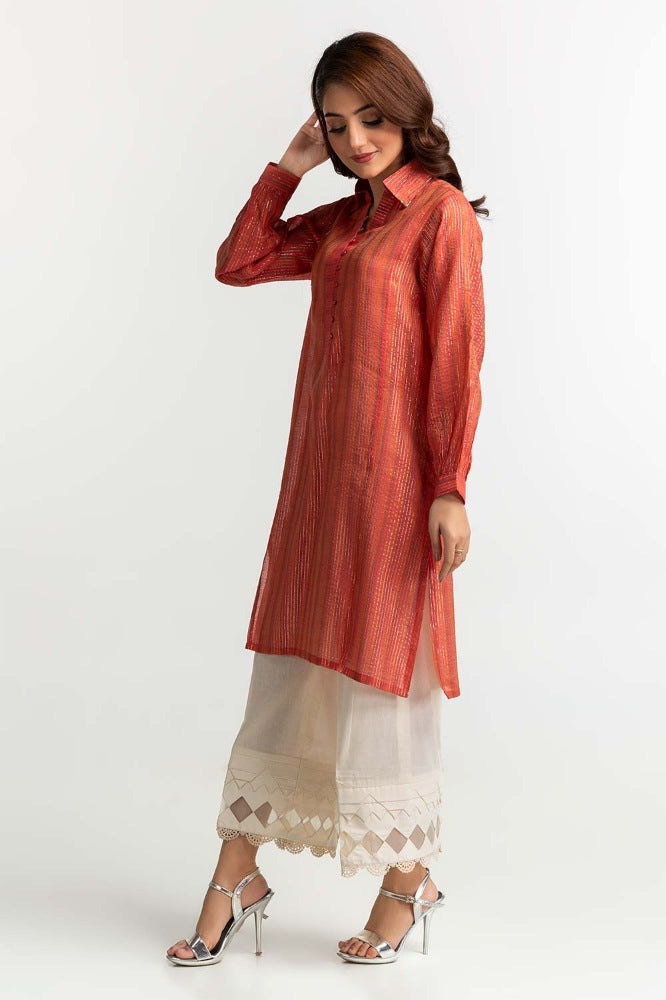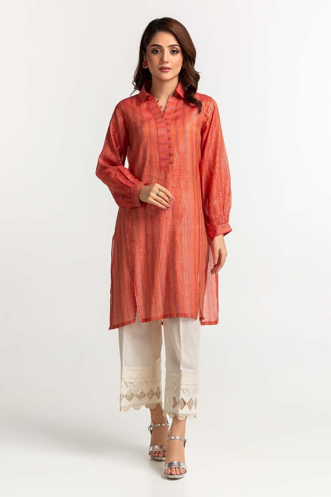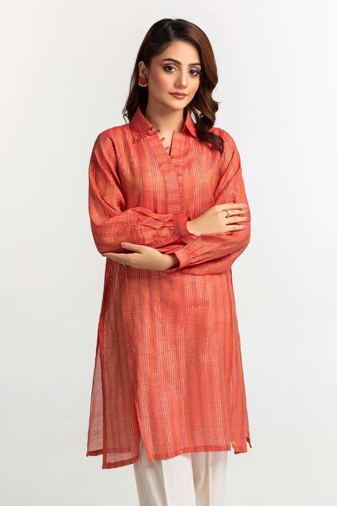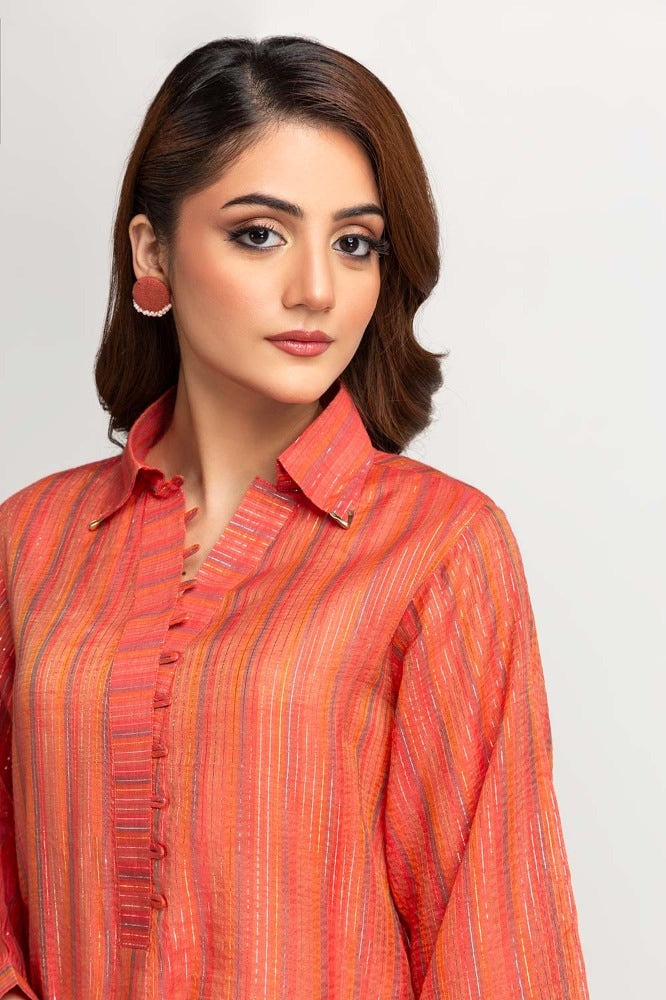 Ready to wear Style your confidence with this chic peach-yarn-dyed embellished shirt. The article features a shirt collar, cuffed sleeves, and intricate design on the placket, creating a perfectly wow look.