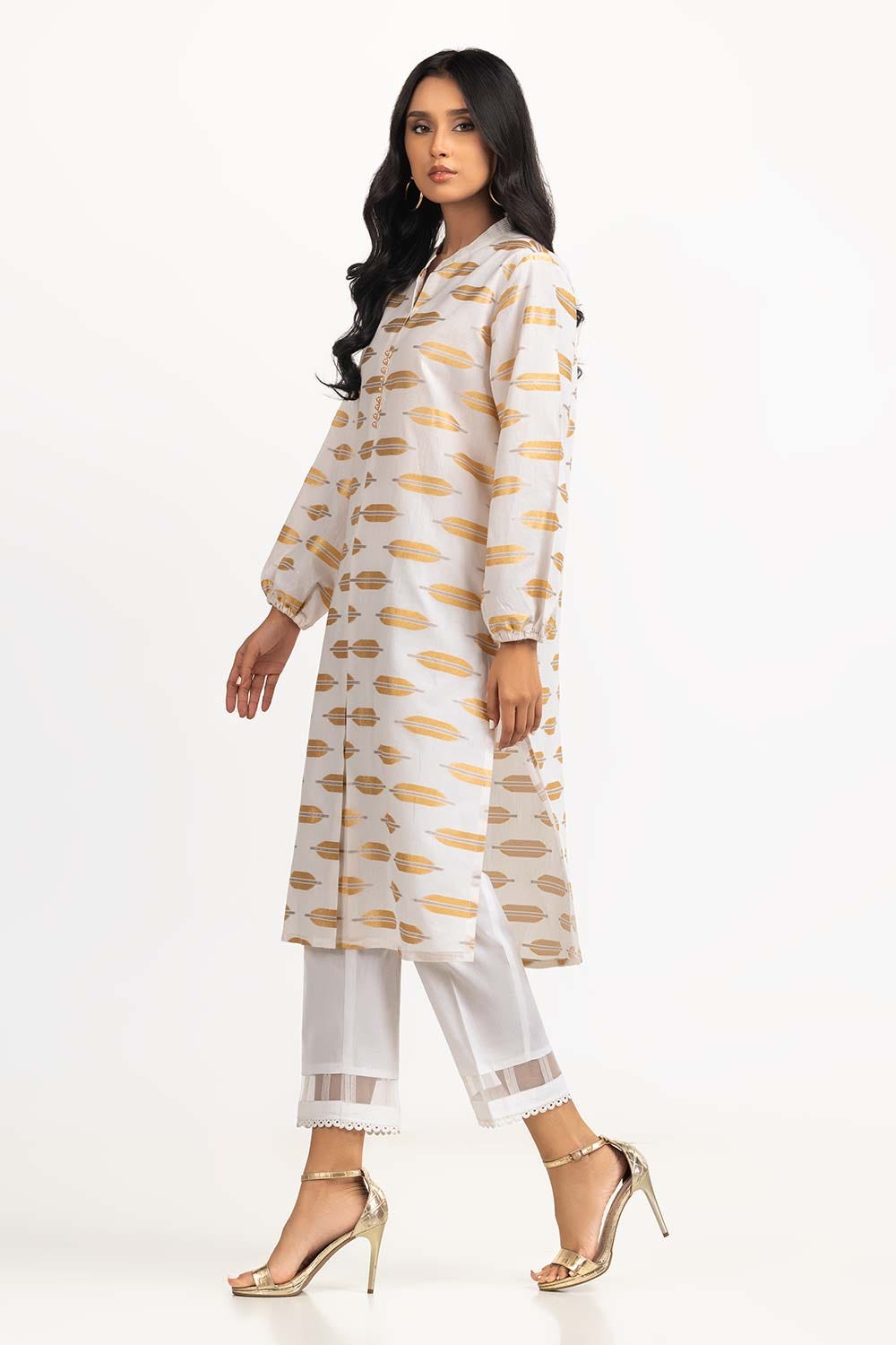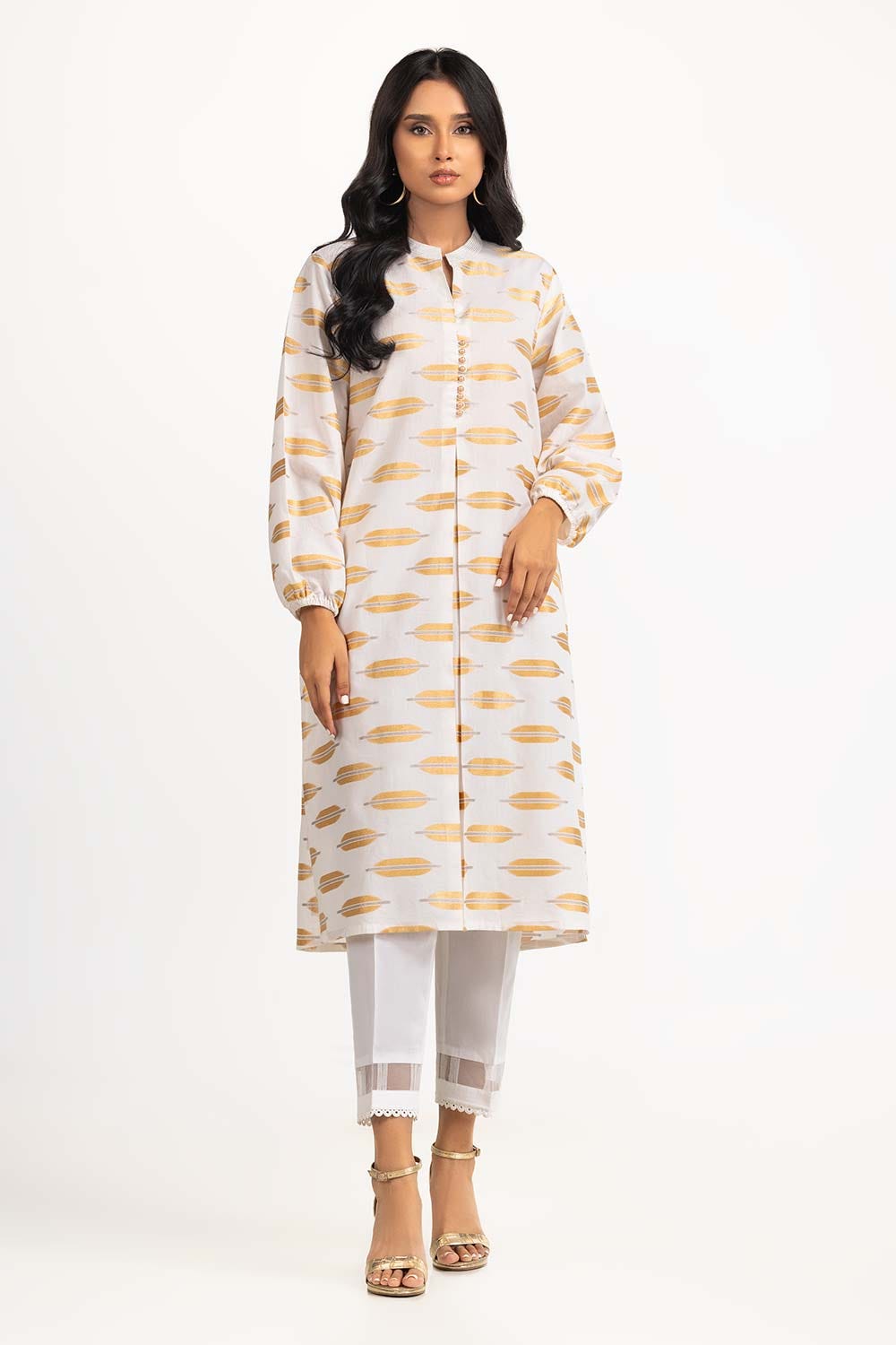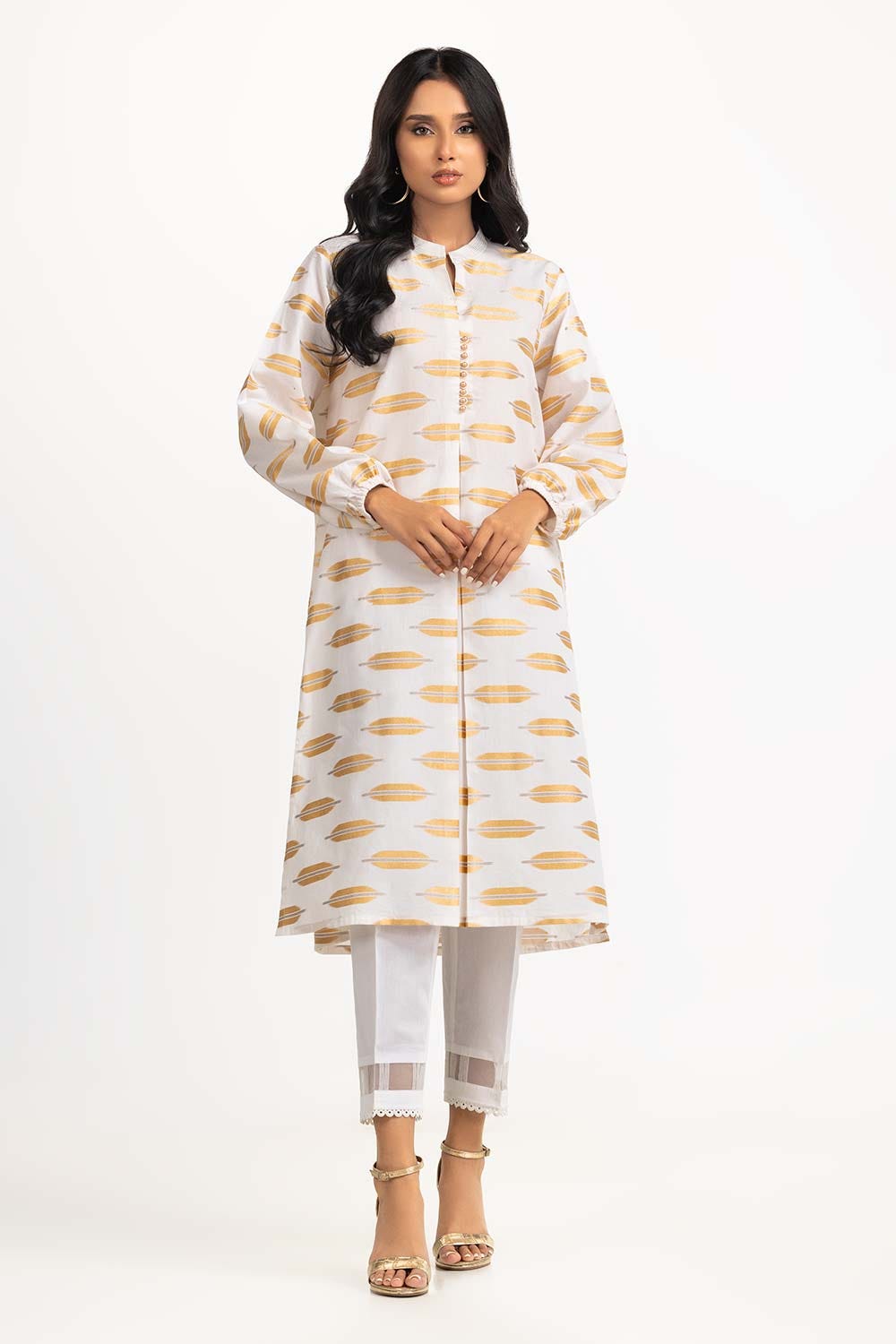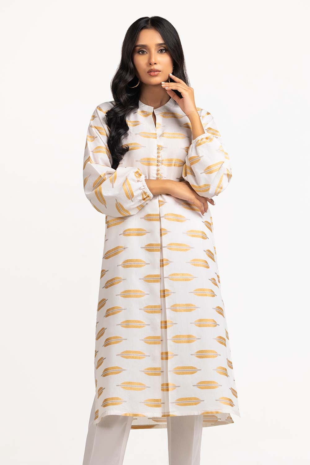 Ready to wear Off-white jacquard shirt featuring a band collar with detailing, gathered long sleeves and a rectangular hem.