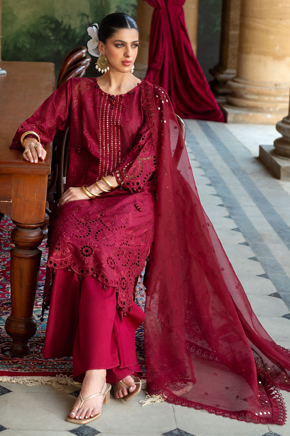 3 Piece Schiffli Embroidered Lawn Suit with Sequins Neckline and Net Dupatta FE-52015