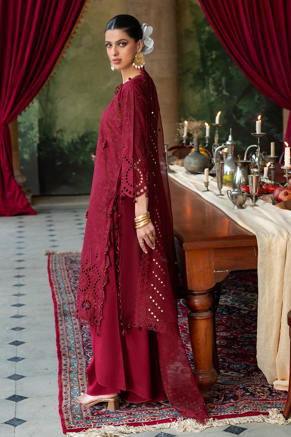 • Schiffli Embroidered Lawn Shirt Front with Sequins Embroidered Neckline on Organza. Embroidered Lawn Sleeves. Dyed Lawn Back - 2.28 Meters