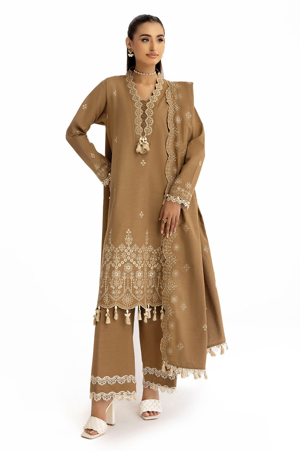 3 Piece Embroidered Khaddar Suit with Organza Neckline and Dupatta K-52034