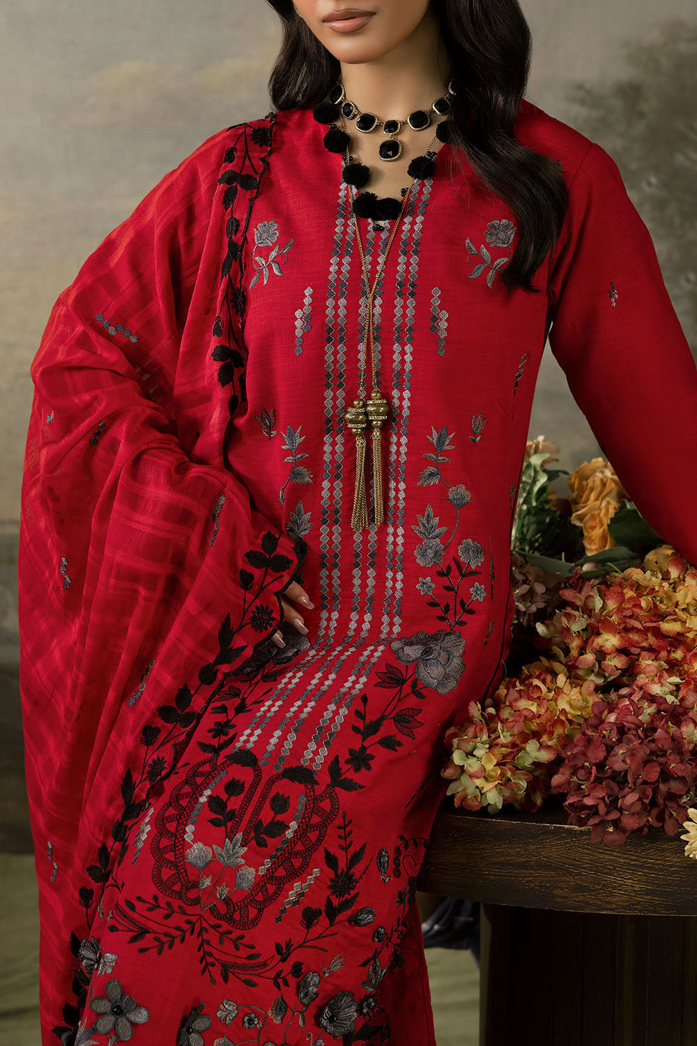 • Embroidered Khaddar Shirt Front & Sleeves with Handwork. Embroidered Lace for Sleeves. Dyed Khaddar Back. - 3.15 Meters