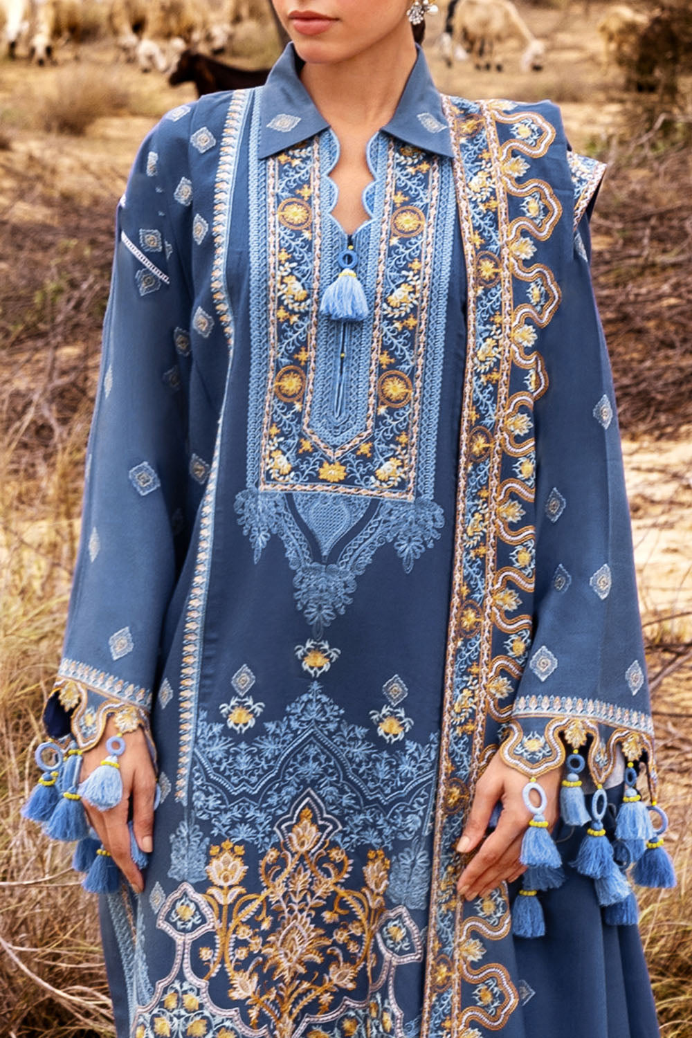 • Embroidered Borders for Front and Back. Dyed Pashmina Back - 1.74 Meters
