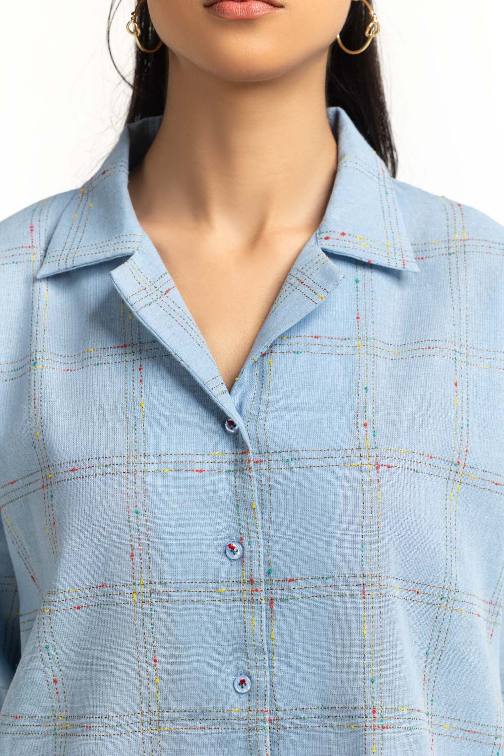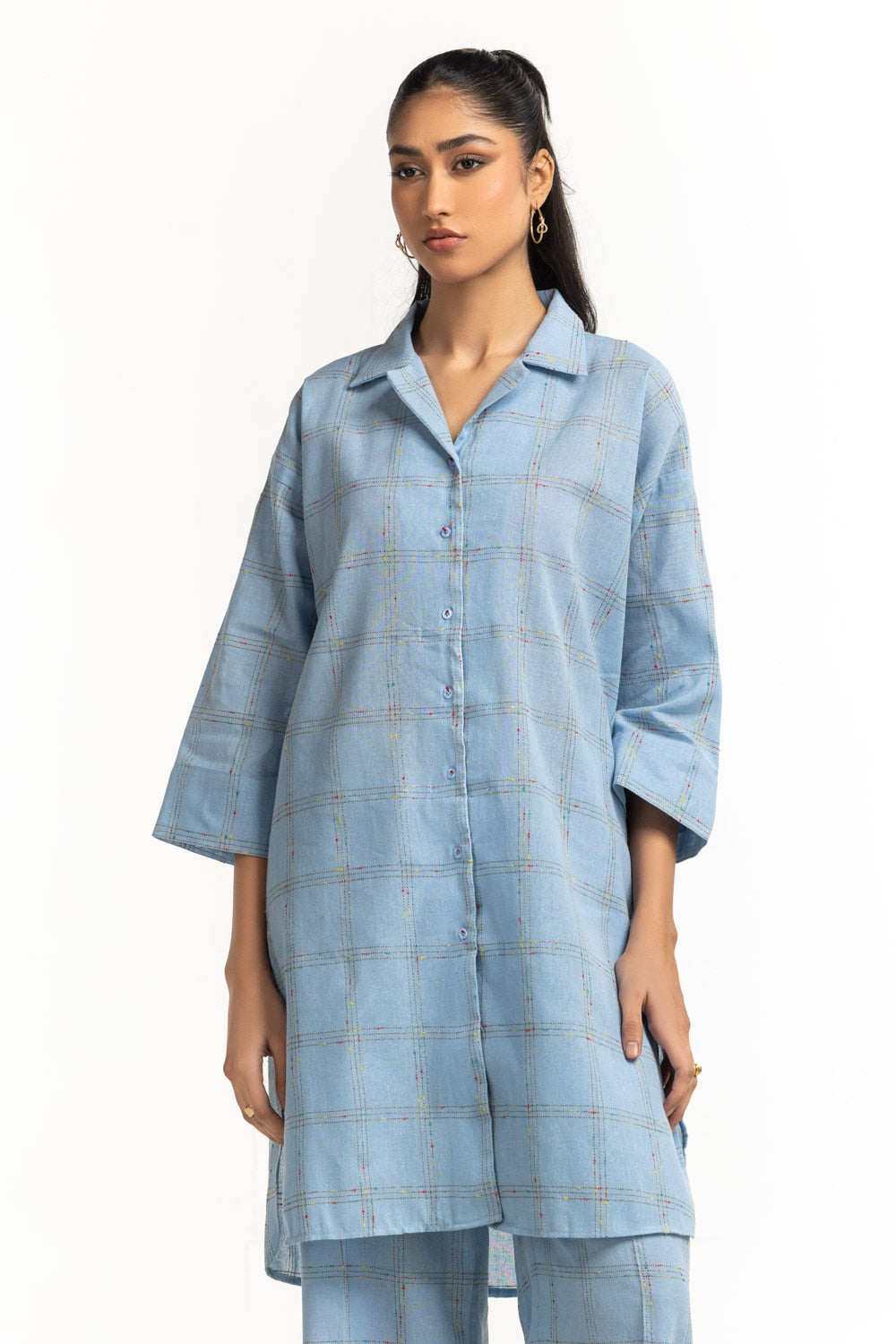 Product Description: Elegant co-ord set with a front-open button-down design. Tailored in yarn-dyed textured fabric featuring a checkered pattern make a strong style statement. Details: Checkered texture shirt with Notched â“ Collar and front open design and two side pockets with a matching trouser. Seasonality: Summer Occasion: Work wear Color: Sky Blue Fit & Sizing: Model Size: The model is 5 Feet 8 Inches and wears a size S Fit: Drop Shoulder, Relaxed fit shirt and Relaxed fit trouser Material & Details: Fabric: Yarn-dyed Composition: 100% Cotton Work Detail: Textured Care Instructions: Do Not Bleach Tumble Dry Low Iron at Normal Temperature Wash Inside Out Iron on Reverse Side Wash Dark Colors Separately Do Not Dry in Direct Sunlight