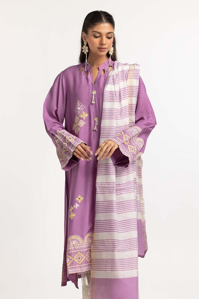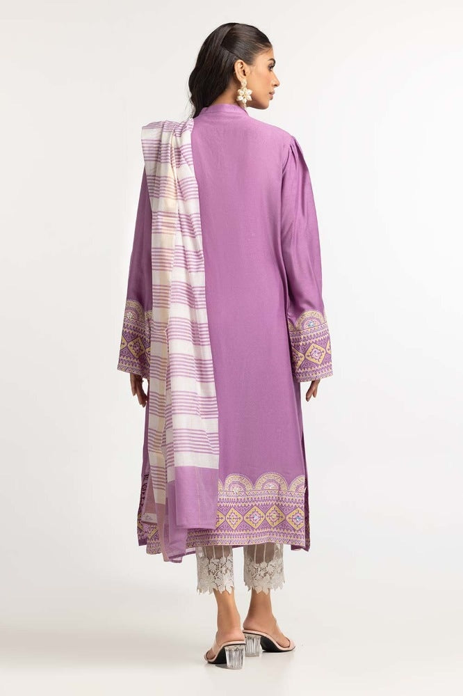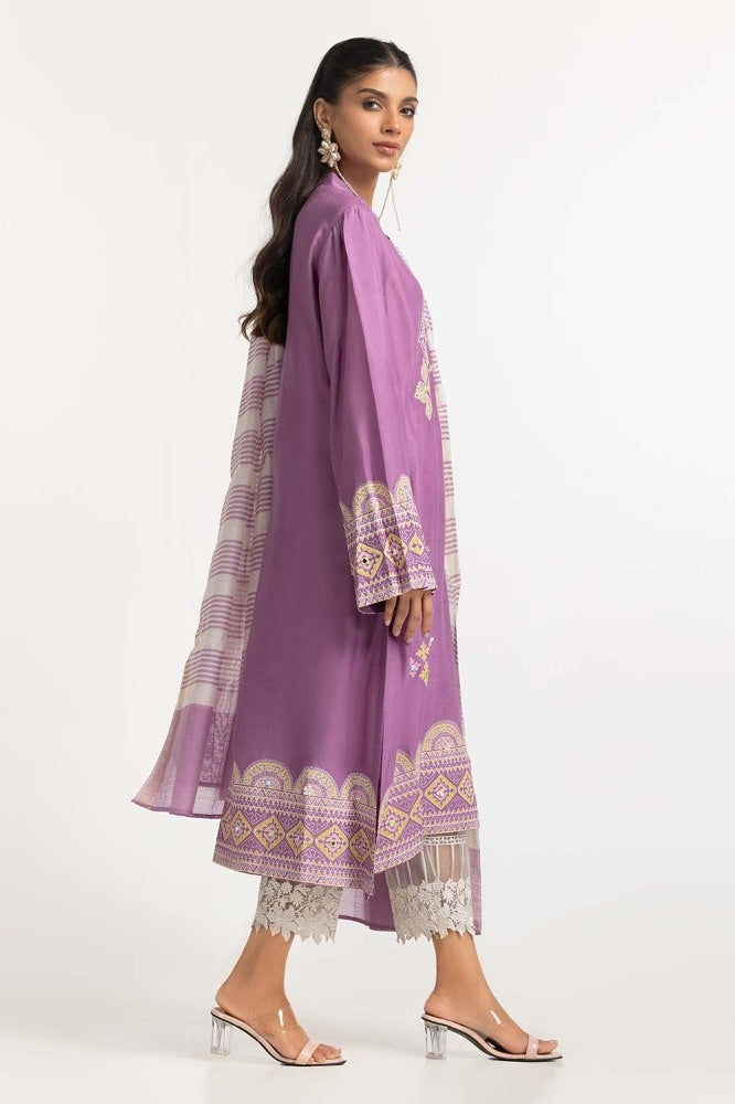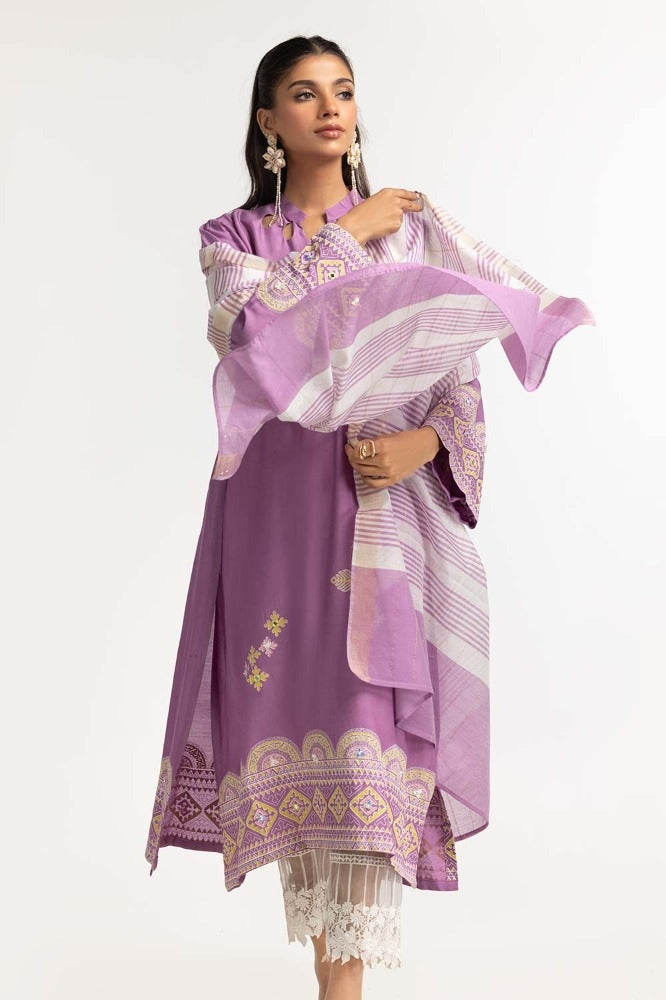 Ready to wear Embrace pastel elegance with this 2 PC purple-dyed screen printed cotton net shirt, featuring a shirt style v-neck collar with tear drop cuts, embellishments on the placket, and print on sleeves and hem, paired perfectly with a complementing yarn-dyed dupatta.