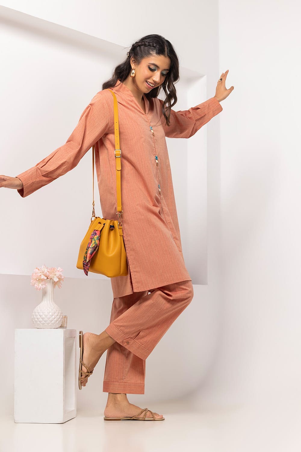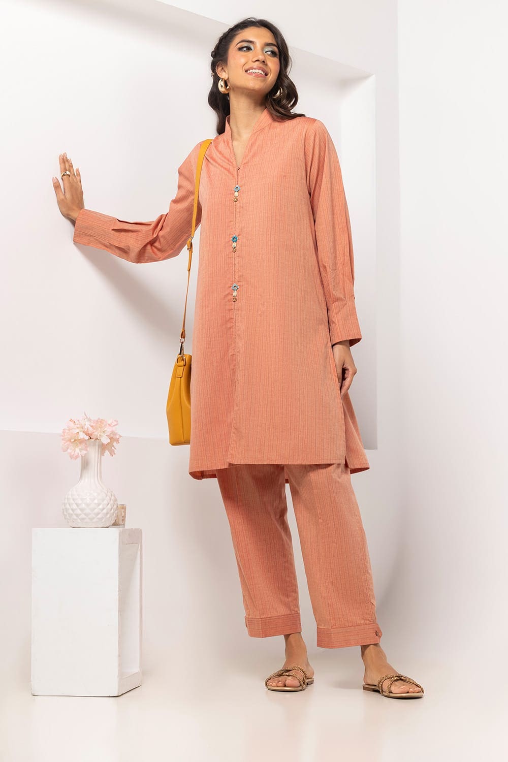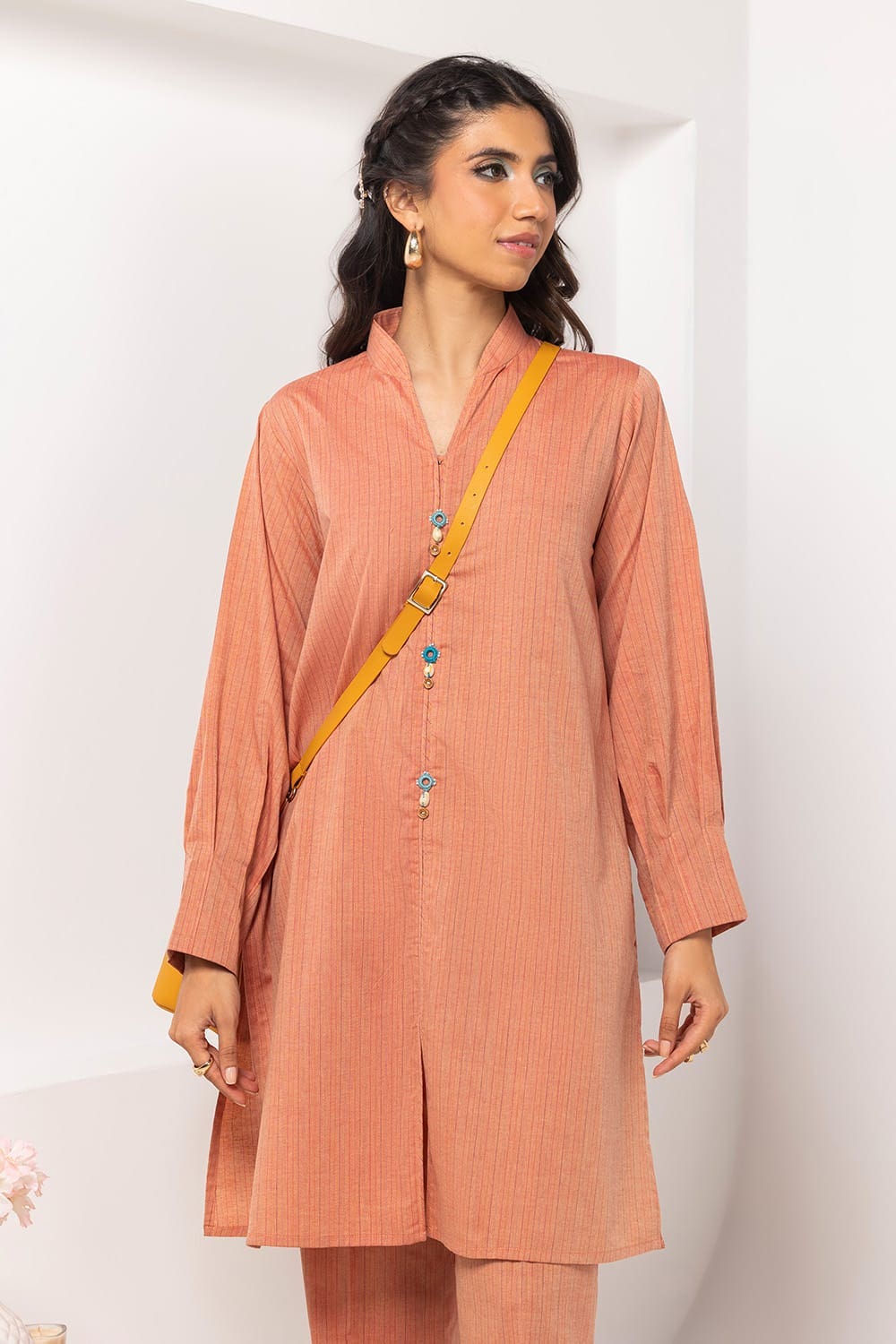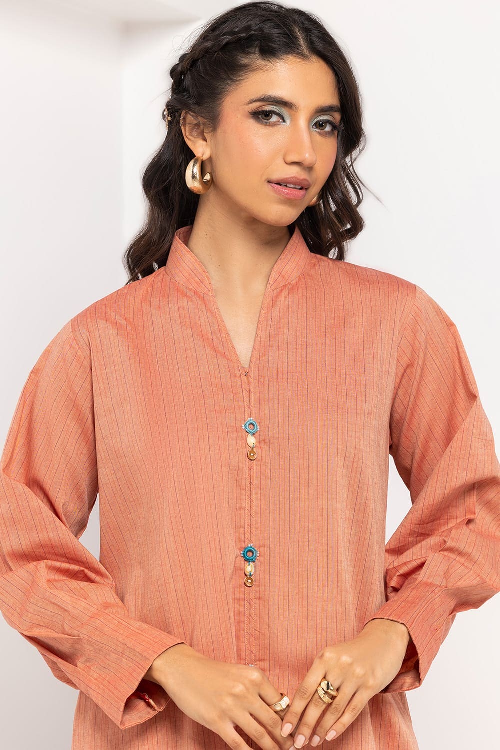 Ready to wear Add a touch of elegance with this 2PC peach button-down kurta. It boasts a round neckline, full sleeves, and a straight hem. Ideal for a subtle and stylish look.