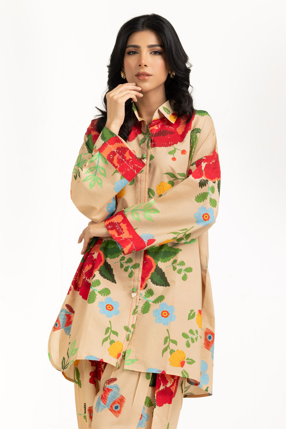 A vibrant floral print settles on this soft beige co-ord set, creating an easy winter look for women who prefer subtle detailing. The blend stays light on the skin while offering seasonal warmth. With a loose fit, the outfit works well for extended wear.