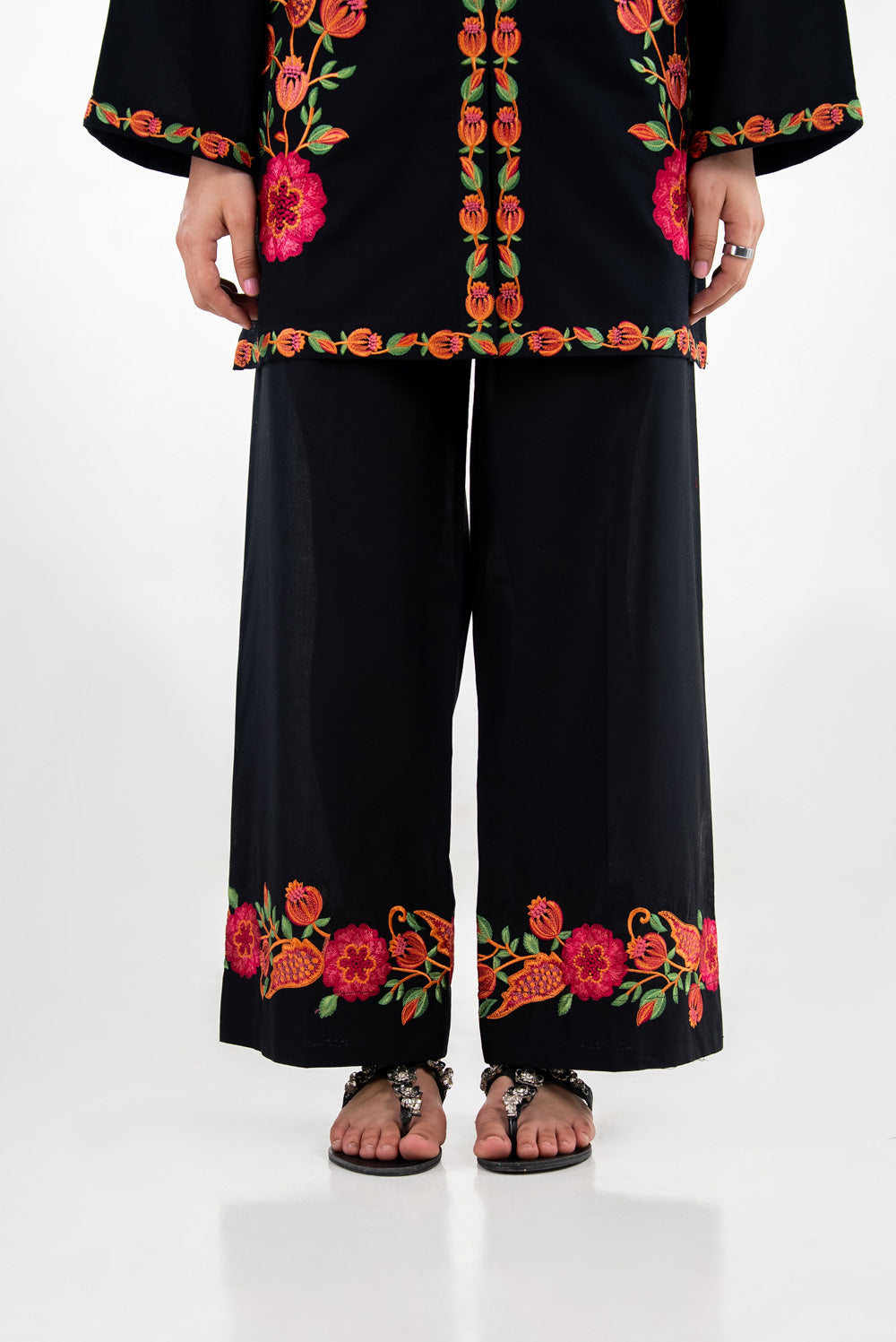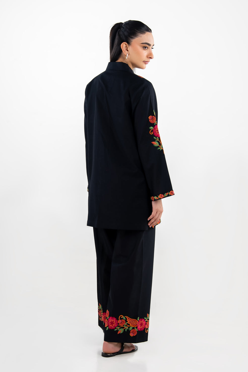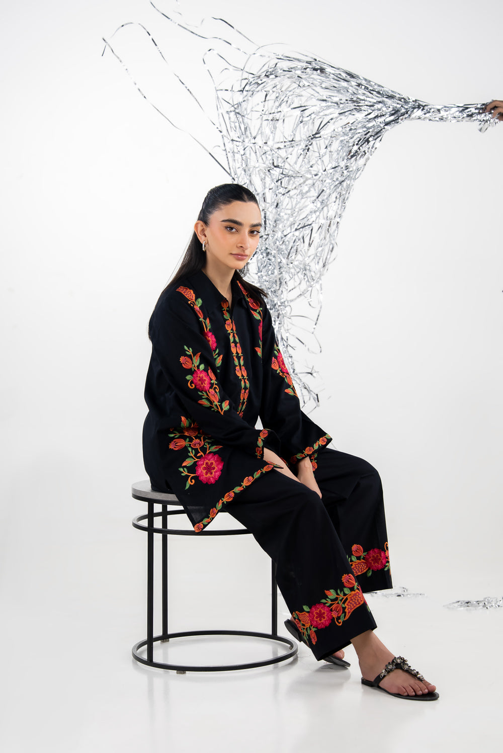 A timeless black canvas enhanced with delicate floral embroidery, that makes this co-ord set standout in understated fashion. The dobby texture adds subtle richness, while the regular fit ensures a clean and structured silhouette. Perfect for those who appreciate classic tones with a contemporary finish.