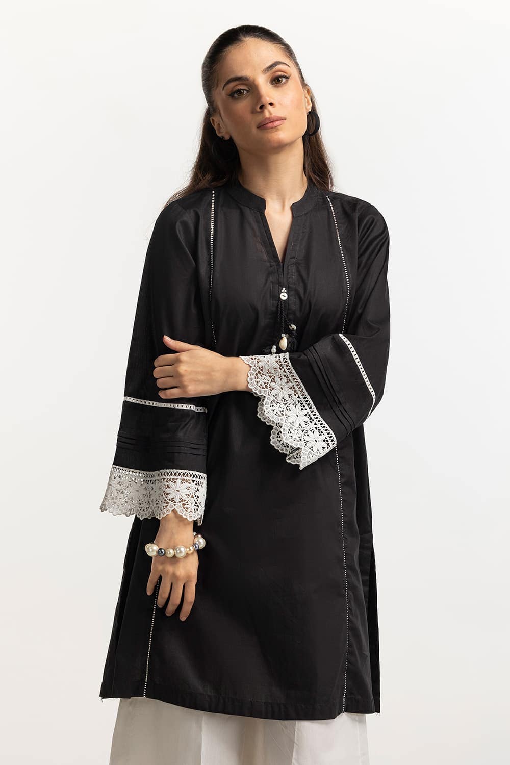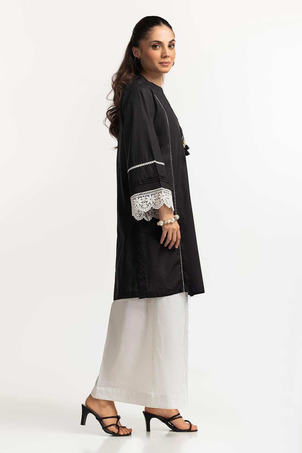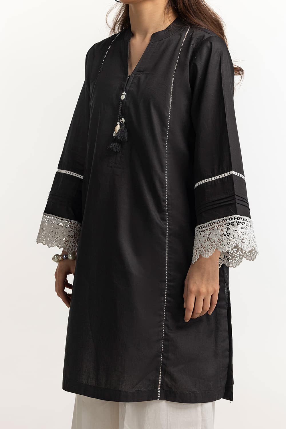 Ready to wear Look elegant with this black lawn kurta featuring a v-neckline with embellishments on the front, broad lace work on the cuffs and subtle highlights on the front. Making it perfect for any outing and occasion.