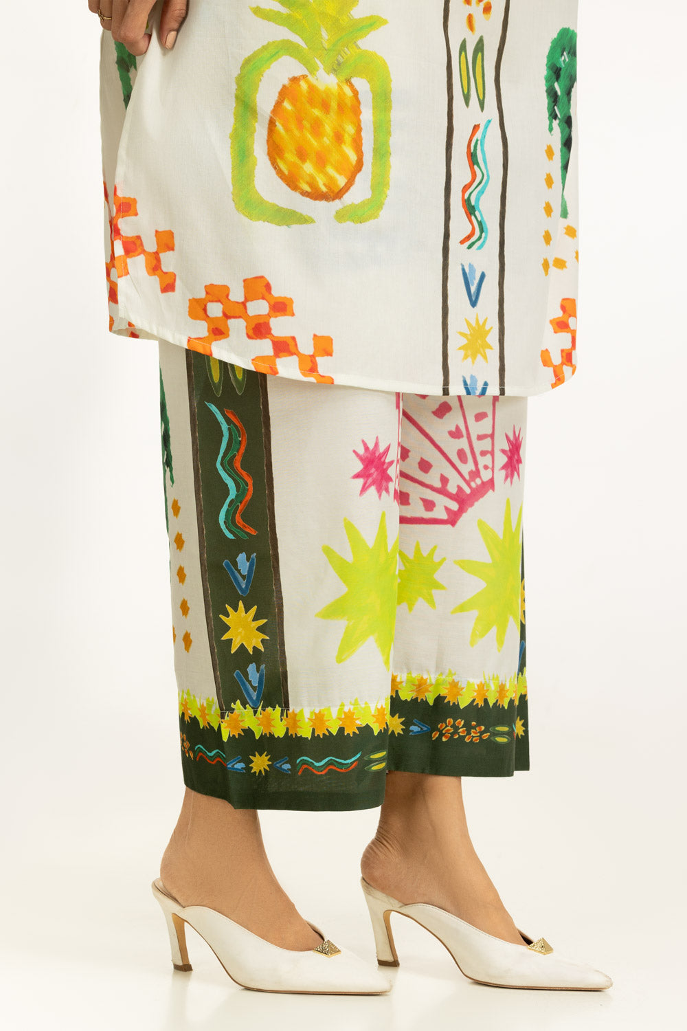 This co-ord set celebrates modern femininity with its lively tropical print. The brezy fabric lends a soft, airy texture, while the regular fit exudes understated poise. Designed for effortless wear, it transitions seamlessly from cozy home hours to casual meetups.