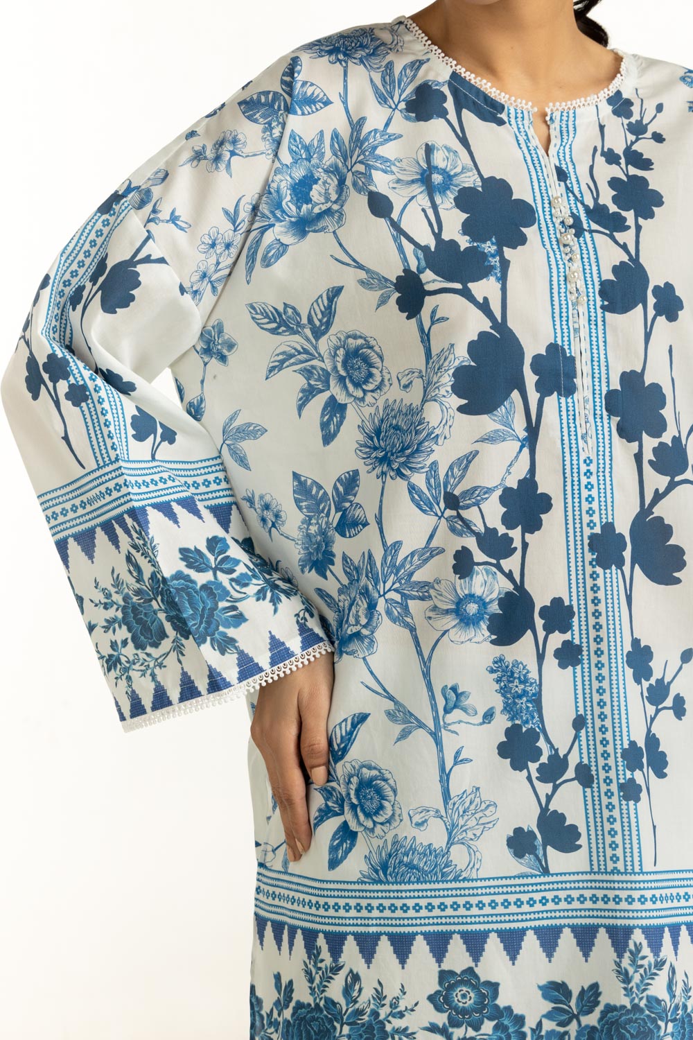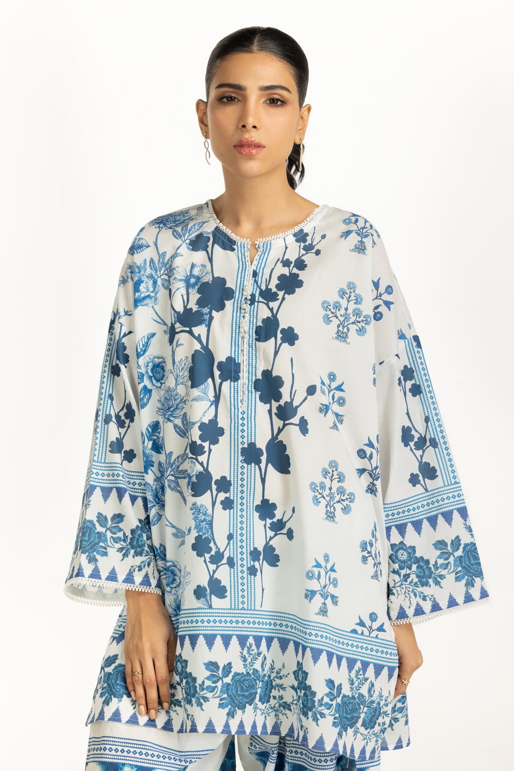 Details: Printed Co-ord set featuring a Round-Neckline with delicate Lacework.